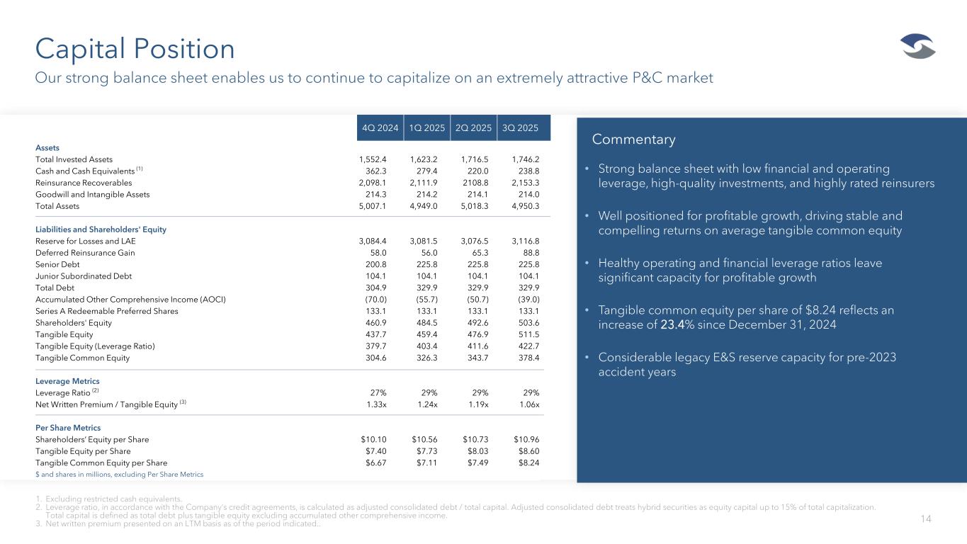 <5% Net retention across in force programs $130 Million of Net Reserves (12% Group Net Reserve Base) $264 Million LTM Gross Written Premium 6% Of Company 3Q25 Net Earned Premium Specialty Admitted Will Mitigate Risk with Low Net Retention 13 The capital light platform is positioned to take advantage of attractive profitable opportunities • The fronting market has seen a significant increase in competition during recent years, putting pressure on reinsurance terms and conditions and net retentions. • Strategically, Falls Lake is focused on: • Low net retentions and placing strong, rated, reinsurance support. • Reducing commercial auto program exposure – written premium related to commercial auto programs declined approximately 50% year to date compared to YTD24. • Acute focus on expense management – expenses at the segment declined 40% for YTD25 compared to YTD24. • Capital supporting the business contributes meaningfully to overall net investment income.