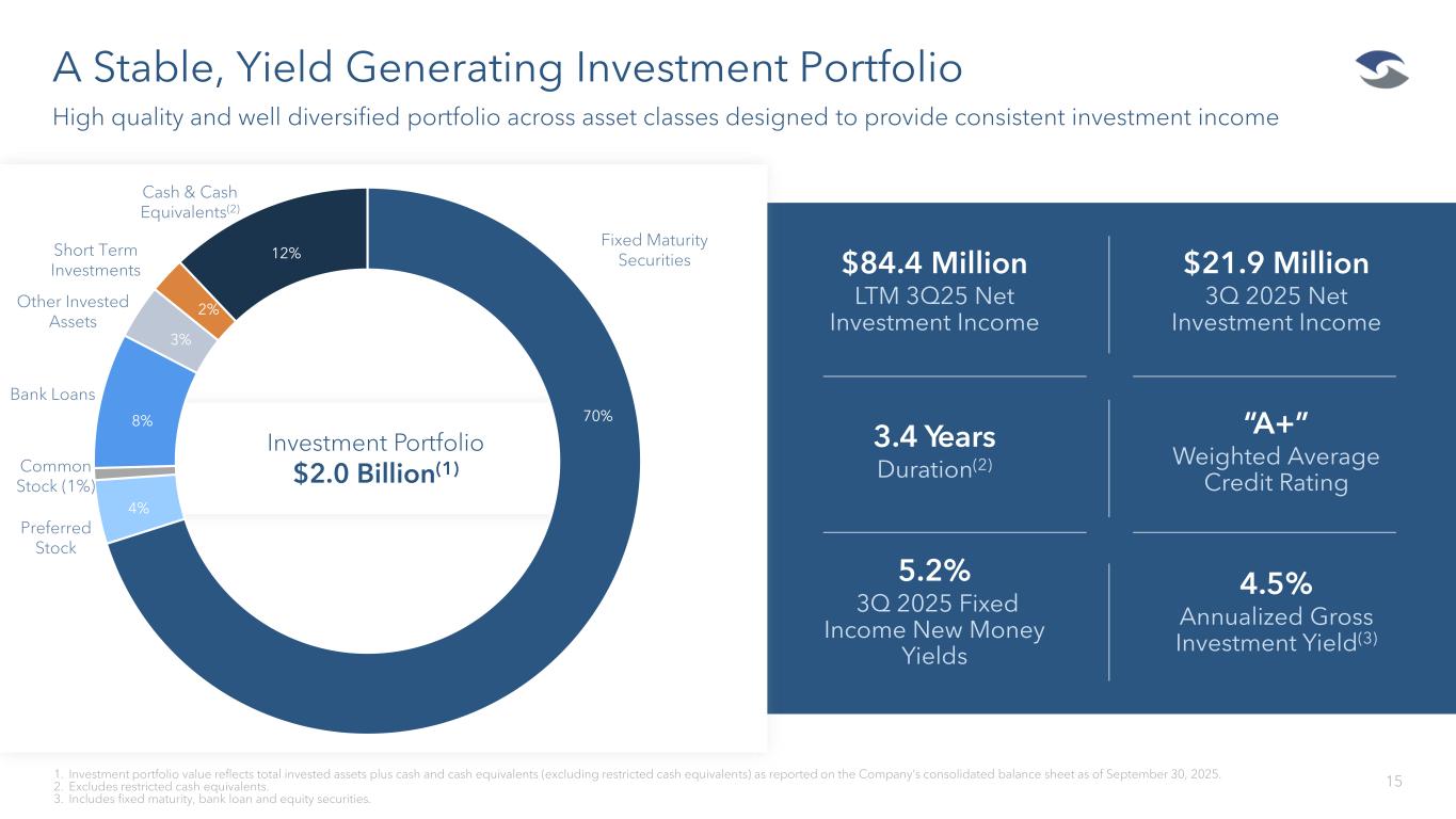 Capital Position 14 Our strong balance sheet enables us to continue to capitalize on an extremely attractive P&C market 1. Excluding restricted cash equivalents. 2. Leverage ratio, in accordance with the Company’s credit agreements, is calculated as adjusted consolidated debt / total capital. Adjusted consolidated debt treats hybrid securities as equity capital up to 15% of total capitalization. Total capital is defined as total debt plus tangible equity excluding accumulated other comprehensive income. 3. Net written premium presented on an LTM basis as of the period indicated.. 4Q 2024 1Q 2025 2Q 2025 3Q 2025 Assets Total Invested Assets 1,552.4 1,623.2 1,716.5 1,746.2 Cash and Cash Equivalents (1) 362.3 279.4 220.0 238.8 Reinsurance Recoverables 2,098.1 2,111.9 2108.8 2,153.3 Goodwill and Intangible Assets 214.3 214.2 214.1 214.0 Total Assets 5,007.1 4,949.0 5,018.3 4,950.3 Liabilities and Shareholders' Equity Reserve for Losses and LAE 3,084.4 3,081.5 3,076.5 3,116.8 Deferred Reinsurance Gain 58.0 56.0 65.3 88.8 Senior Debt 200.8 225.8 225.8 225.8 Junior Subordinated Debt 104.1 104.1 104.1 104.1 Total Debt 304.9 329.9 329.9 329.9 Accumulated Other Comprehensive Income (AOCI) (70.0) (55.7) (50.7) (39.0) Series A Redeemable Preferred Shares 133.1 133.1 133.1 133.1 Shareholders' Equity 460.9 484.5 492.6 503.6 Tangible Equity 437.7 459.4 476.9 511.5 Tangible Equity (Leverage Ratio) 379.7 403.4 411.6 422.7 Tangible Common Equity 304.6 326.3 343.7 378.4 Leverage Metrics Leverage Ratio (2) 27% 29% 29% 29% Net Written Premium / Tangible Equity (3) 1.33x 1.24x 1.19x 1.06x Per Share Metrics Shareholders’ Equity per Share $10.10 $10.56 $10.73 $10.96 Tangible Equity per Share $7.40 $7.73 $8.03 $8.60 Tangible Common Equity per Share $6.67 $7.11 $7.49 $8.24 $ and shares in millions, excluding Per Share Metrics • Strong balance sheet with low financial and operating leverage, high-quality investments, and highly rated reinsurers • Well positioned for profitable growth, driving stable and compelling returns on average tangible common equity • Healthy operating and financial leverage ratios leave significant capacity for profitable growth • Tangible common equity per share of $8.24 reflects an increase of 23.4% since December 31, 2024 • Considerable legacy E&S reserve capacity for pre-2023 accident years Commentary