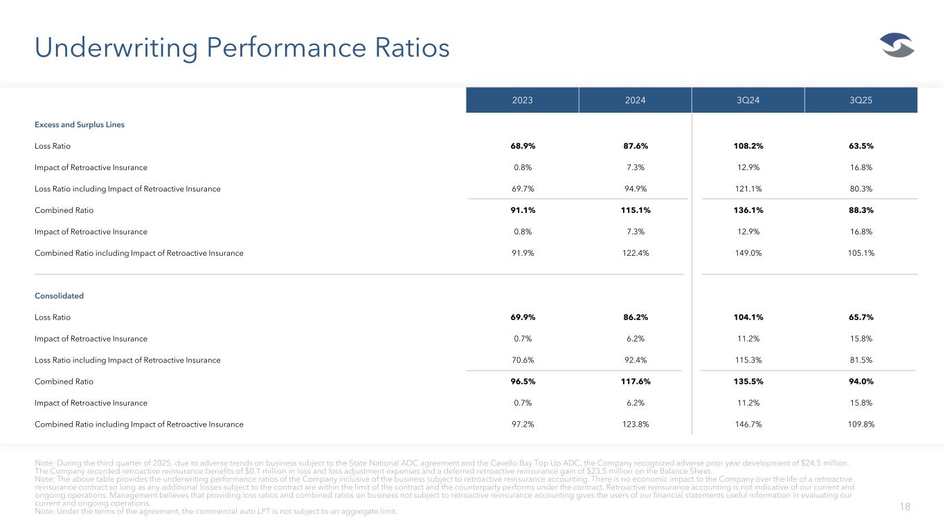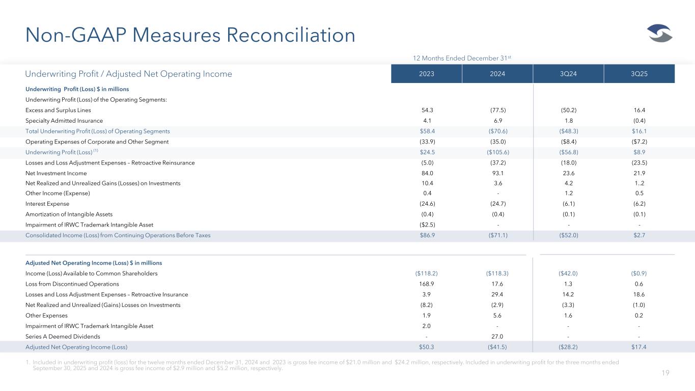 Underwriting Performance Ratios 18 Note: During the third quarter of 2025, due to adverse trends on business subject to the State National ADC agreement and the Cavello Bay Top Up ADC, the Company recognized adverse prior year development of $24.5 million. The Company recorded retroactive reinsurance benefits of $0.1 million in loss and loss adjustment expenses and a deferred retroactive reinsurance gain of $23.5 million on the Balance Sheet. Note: The above table provides the underwriting performance ratios of the Company inclusive of the business subject to retroactive reinsurance accounting. There is no economic impact to the Company over the life of a retroactive reinsurance contract so long as any additional losses subject to the contract are within the limit of the contract and the counterparty performs under the contract. Retroactive reinsurance accounting is not indicative of our current and ongoing operations. Management believes that providing loss ratios and combined ratios on business not subject to retroactive reinsurance accounting gives the users of our financial statements useful information in evaluating our current and ongoing operations. Note: Under the terms of the agreement, the commercial auto LPT is not subject to an aggregate limit. 2023 2024 3Q24 3Q25 Excess and Surplus Lines Loss Ratio 68.9% 87.6% 108.2% 63.5% Impact of Retroactive Insurance 0.8% 7.3% 12.9% 16.8% Loss Ratio including Impact of Retroactive Insurance 69.7% 94.9% 121.1% 80.3% Combined Ratio 91.1% 115.1% 136.1% 88.3% Impact of Retroactive Insurance 0.8% 7.3% 12.9% 16.8% Combined Ratio including Impact of Retroactive Insurance 91.9% 122.4% 149.0% 105.1% Consolidated Loss Ratio 69.9% 86.2% 104.1% 65.7% Impact of Retroactive Insurance 0.7% 6.2% 11.2% 15.8% Loss Ratio including Impact of Retroactive Insurance 70.6% 92.4% 115.3% 81.5% Combined Ratio 96.5% 117.6% 135.5% 94.0% Impact of Retroactive Insurance 0.7% 6.2% 11.2% 15.8% Combined Ratio including Impact of Retroactive Insurance 97.2% 123.8% 146.7% 109.8%