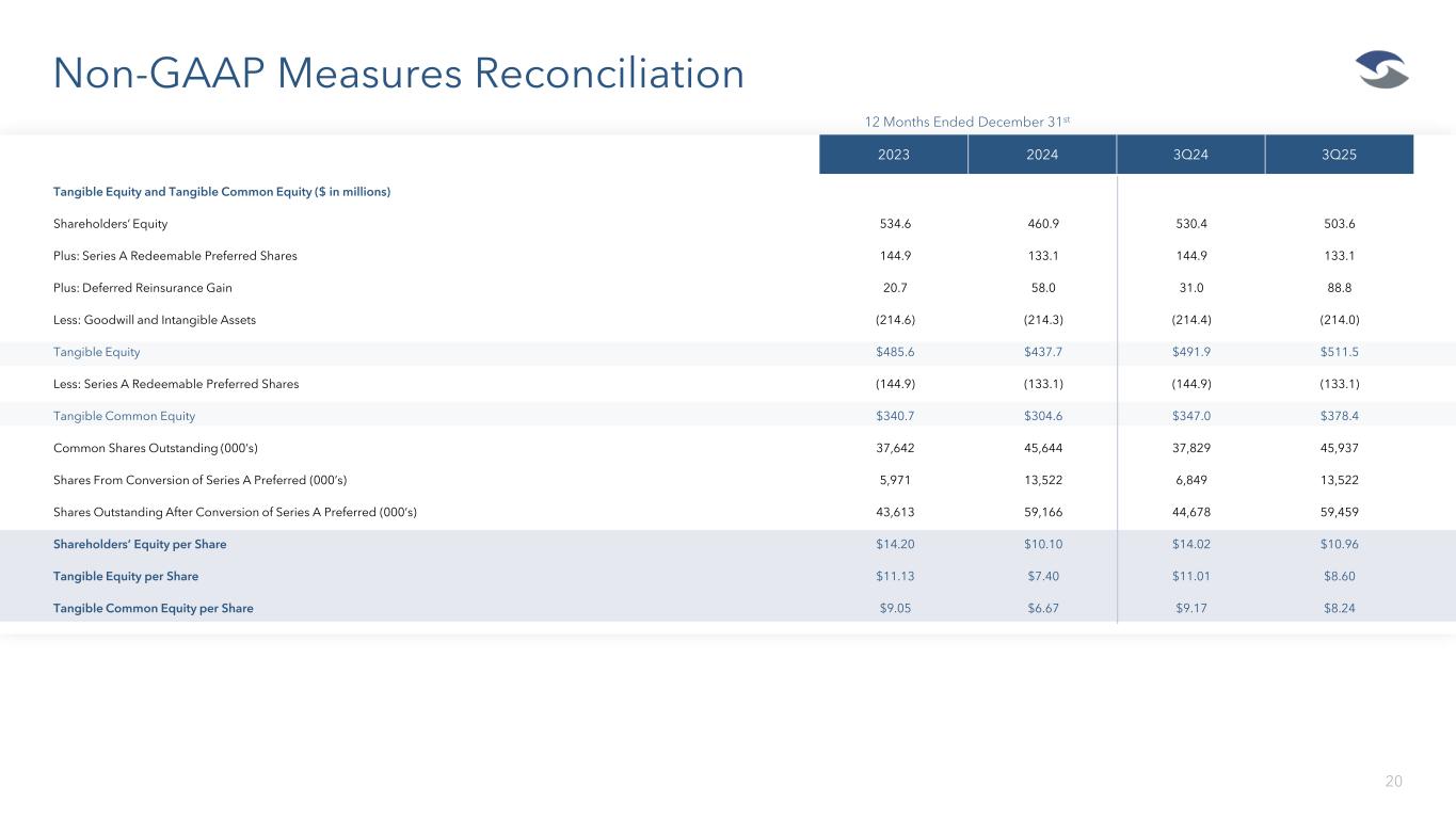 Non-GAAP Measures Reconciliation 19 1. Included in underwriting profit (loss) for the twelve months ended December 31, 2024 and 2023 is gross fee income of $21.0 million and $24.2 million, respectively. Included in underwriting profit for the three months ended September 30, 2025 and 2024 is gross fee income of $2.9 million and $5.2 million, respectively. 2023 2024 3Q24 3Q25 Underwriting Profit (Loss) $ in millions Underwriting Profit (Loss) of the Operating Segments: Excess and Surplus Lines 54.3 (77.5) (50.2) 16.4 Specialty Admitted Insurance 4.1 6.9 1.8 (0.4) Total Underwriting Profit (Loss) of Operating Segments $58.4 ($70.6) ($48.3) $16.1 Operating Expenses of Corporate and Other Segment (33.9) (35.0) ($8.4) ($7.2) Underwriting Profit (Loss) (1) $24.5 ($105.6) ($56.8) $8.9 Losses and Loss Adjustment Expenses – Retroactive Reinsurance (5.0) (37.2) (18.0) (23.5) Net Investment Income 84.0 93.1 23.6 21.9 Net Realized and Unrealized Gains (Losses) on Investments 10.4 3.6 4.2 1..2 Other Income (Expense) 0.4 - 1.2 0.5 Interest Expense (24.6) (24.7) (6.1) (6.2) Amortization of Intangible Assets (0.4) (0.4) (0.1) (0.1) Impairment of IRWC Trademark Intangible Asset ($2.5) - - - Consolidated Income (Loss) from Continuing Operations Before Taxes $86.9 ($71.1) ($52.0) $2.7 Underwriting Profit / Adjusted Net Operating Income Adjusted Net Operating Income (Loss) $ in millions Income (Loss) Available to Common Shareholders ($118.2) ($118.3) ($42.0) ($0.9) Loss from Discontinued Operations 168.9 17.6 1.3 0.6 Losses and Loss Adjustment Expenses – Retroactive Insurance 3.9 29.4 14.2 18.6 Net Realized and Unrealized (Gains) Losses on Investments (8.2) (2.9) (3.3) (1.0) Other Expenses 1.9 5.6 1.6 0.2 Impairment of IRWC Trademark Intangible Asset 2.0 - - - Series A Deemed Dividends - 27.0 - - Adjusted Net Operating Income (Loss) $50.3 ($41.5) ($28.2) $17.4 12 Months Ended December 31st