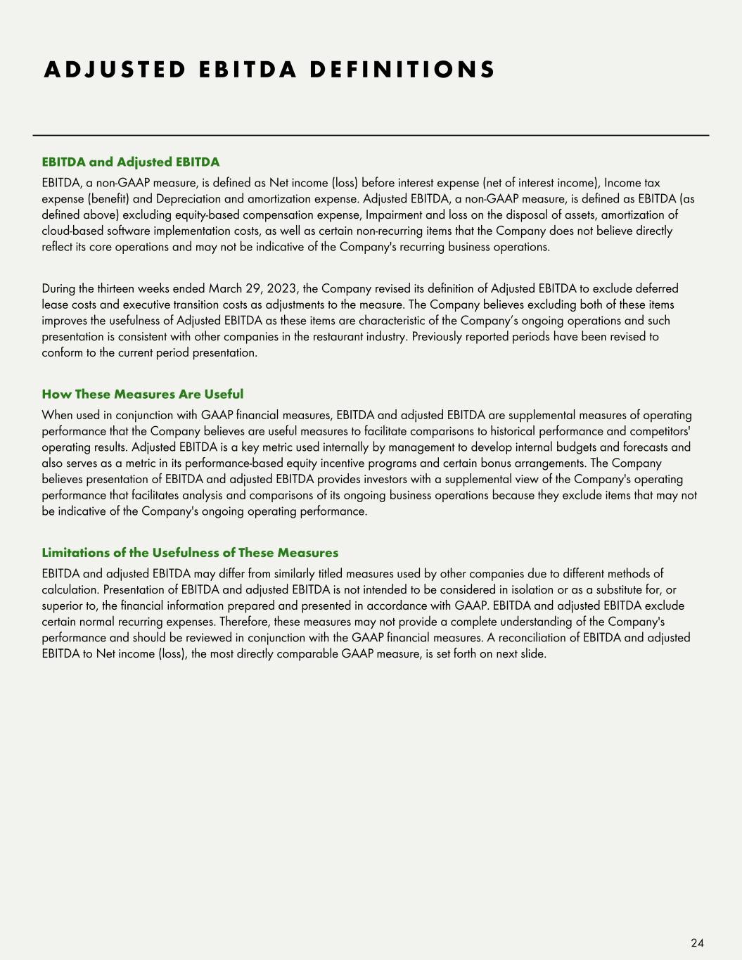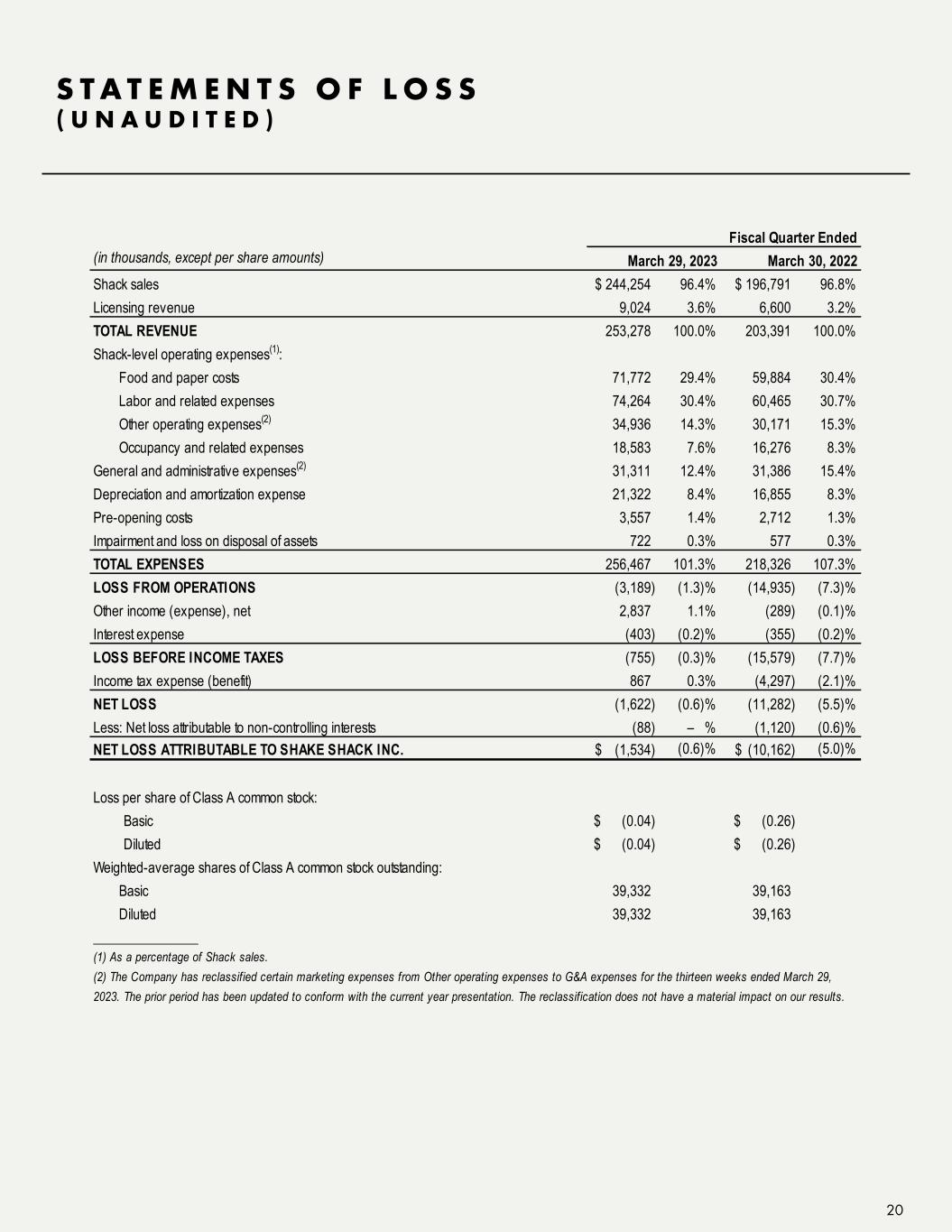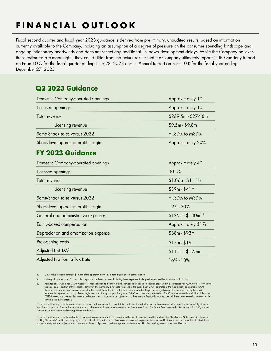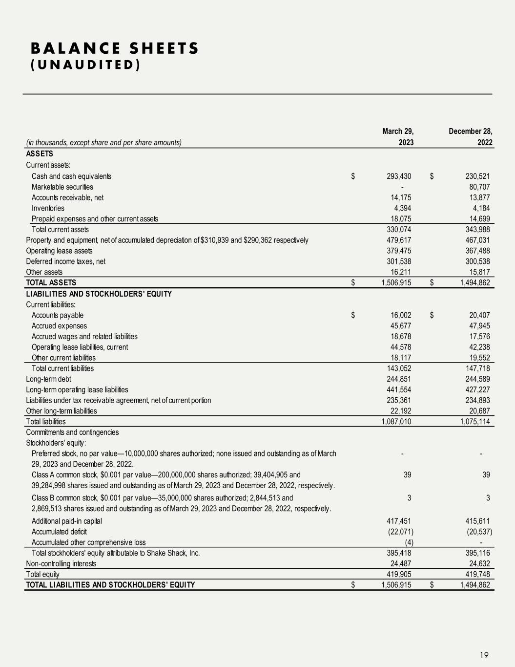 (1)シャックレベルの営業利益、調整後EBITDA、調整後プロフォーマ当期純利益(損失)は非GAAP指標です。GAAPに準拠して表示される最も直接的に比較できる財務指標との調整は、本リリースに添付されたスケジュールに記載されています。以下の「非GAAP財務指標」をご参照ください。