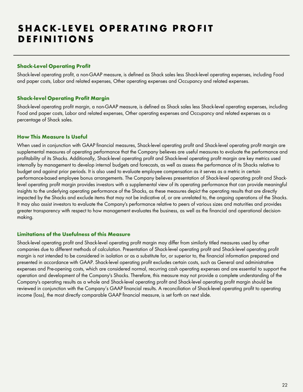 「シャックレベルの営業利益」は、シャックの売上高から、食品及び紙費、人件費及び関連費用、その他の営業費用、及び居住費及び関連費用を含むシャックレベルの営業費用を控除したものと定義されています。