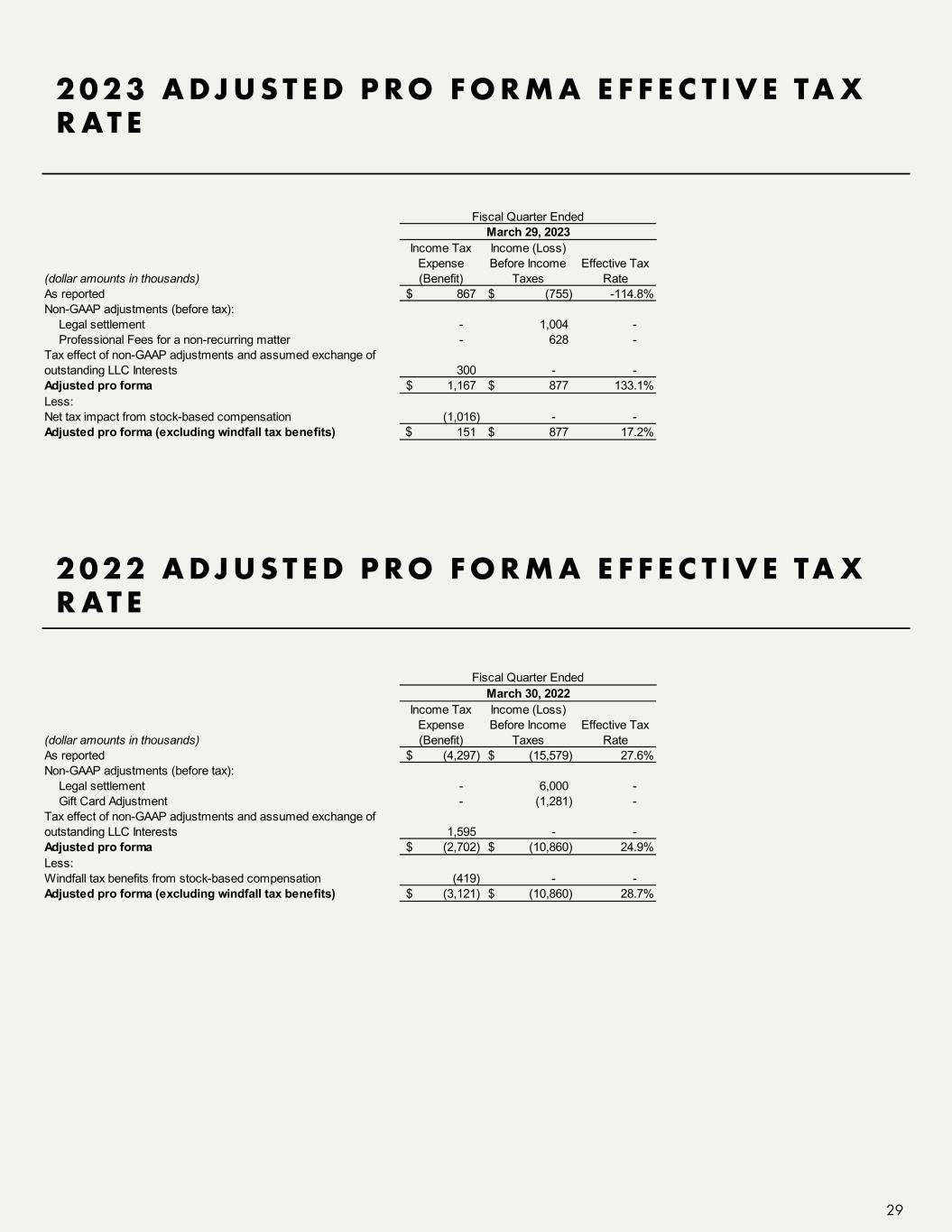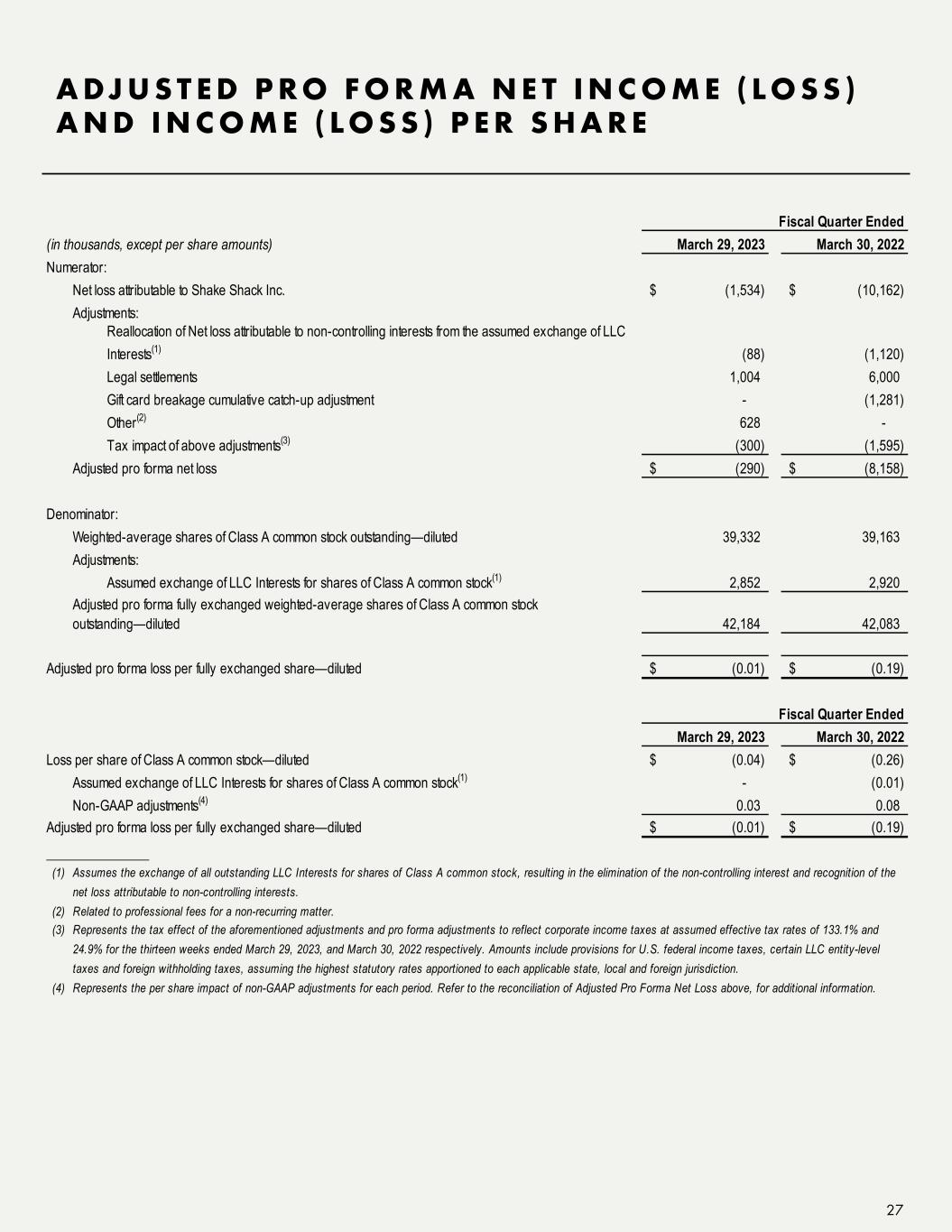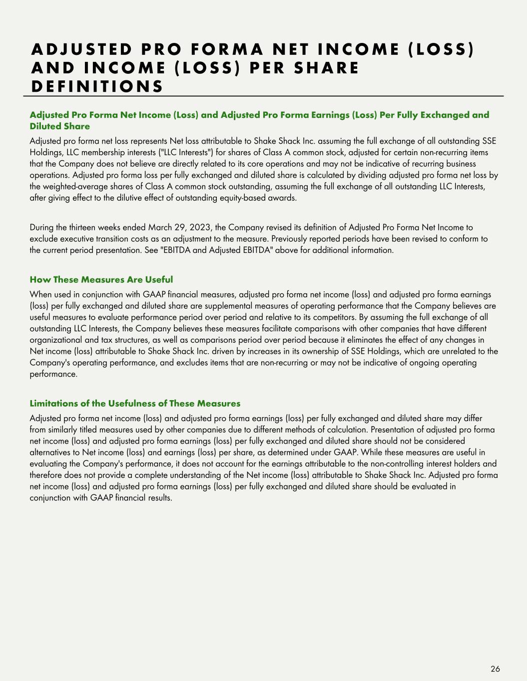 非GAAP指標である「調整後プロフォーマ当期純利益」は、すべての発行済SSE Holdings, LLC会員権(以下「LLC持分」)をクラスA普通株式に完全交換したと仮定した場合のShake Shack Inc.に帰属する当期純利益(損失)を、当社が中核事業を直接反映するとは考えておらず、当社の経常的な事業活動を示すとは限らない特定の経常外項目およびその他の項目について調整して示しています。