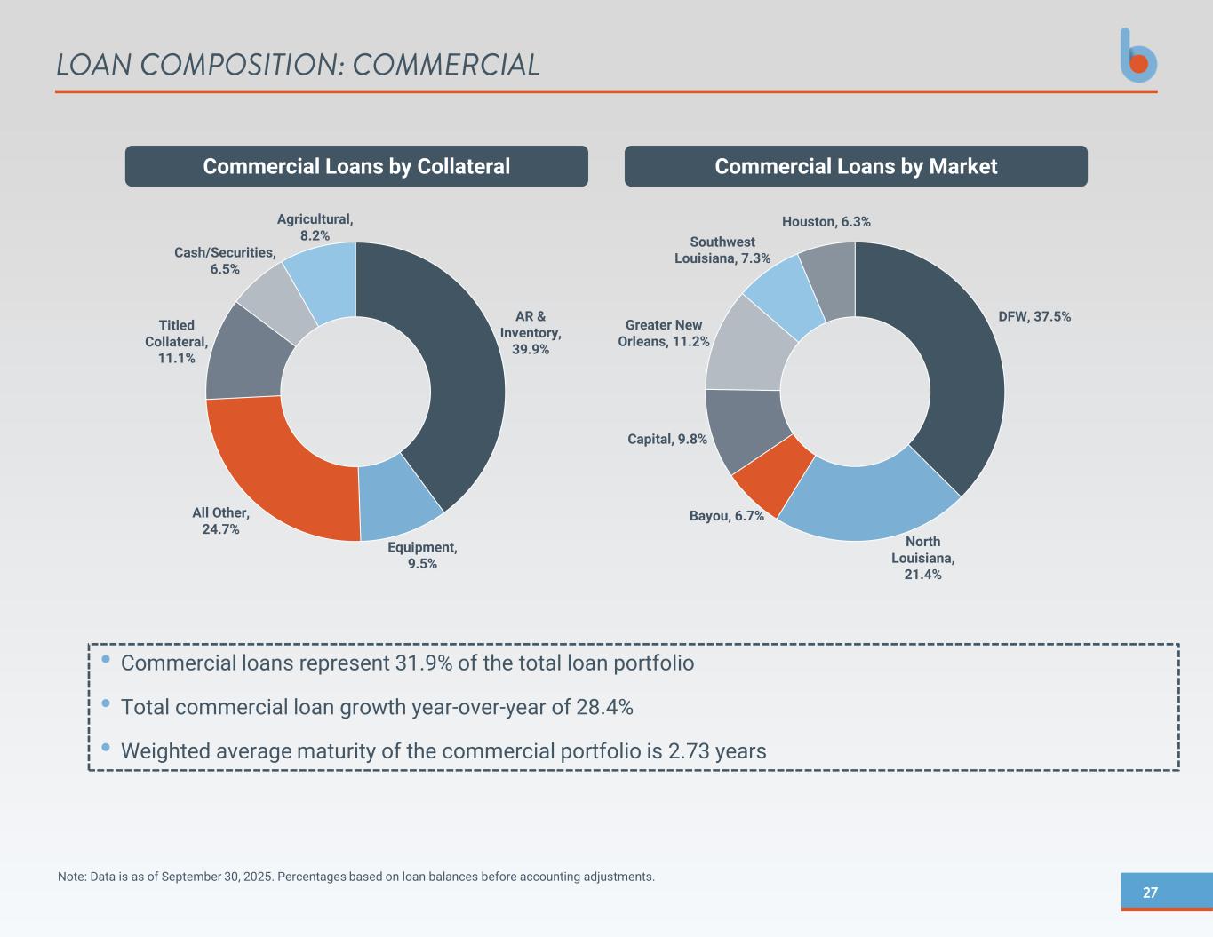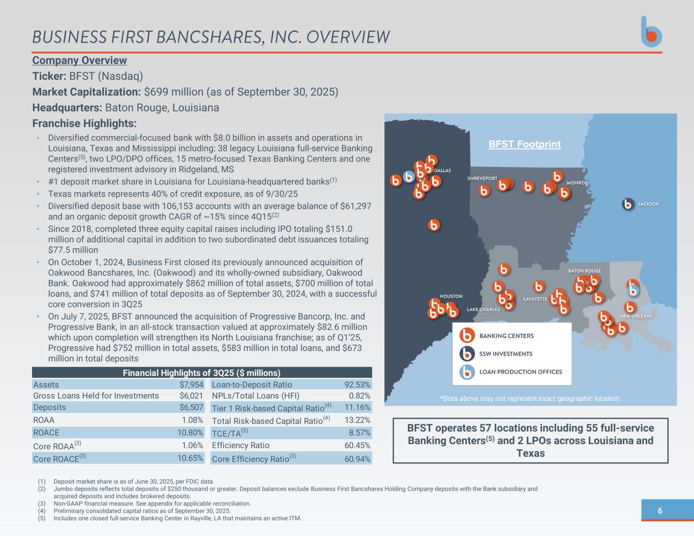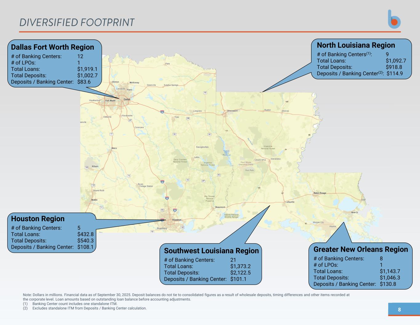 経営陣は 2025 年 10 月 23 日(木)午後 4 時(米国中部標準時)より、決算に関する電話会議とウェブキャストを開催する。ご興味のある方は、フリーダイヤル1-800-715-9871(北米のみ)、カンファレンスID 8427939におかけいただくか、ビジネス・ファースト・バンクシェアズのカンファレンス・コールとお申し付けください。ライブ・ウェブキャストはhttps://edge.media-server.com/mmc/p/hvu86bo6。プレゼンテーション当日は、対応するスライド・プレゼンテーションをb1BANKのウェブサイトhttps://www.b1bank.com/shareholder-info。