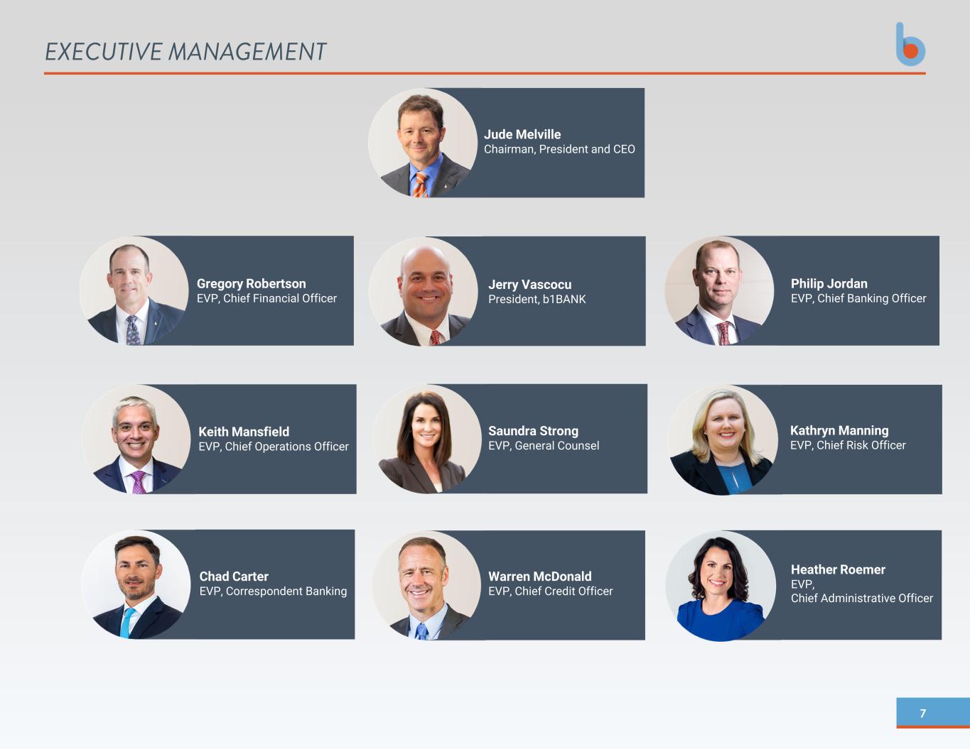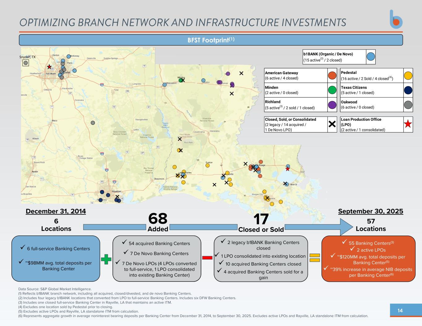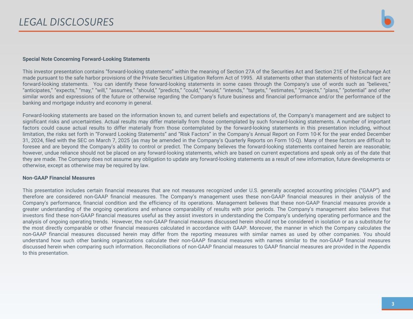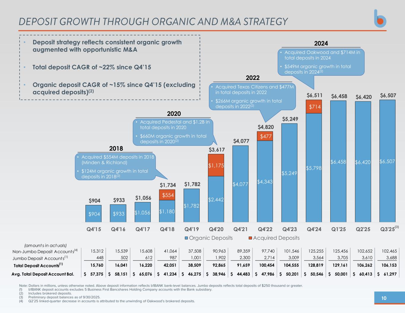 経営陣は 2025 年 10 月 23 日(木)午後 4 時(米国中部標準時)より、決算に関する電話会議とウェブキャストを開催する。ご興味のある方は、フリーダイヤル1-800-715-9871(北米のみ)、カンファレンスID 8427939におかけいただくか、ビジネス・ファースト・バンクシェアズのカンファレンス・コールとお申し付けください。ライブ・ウェブキャストはhttps://edge.media-server.com/mmc/p/hvu86bo6。プレゼンテーション当日は、対応するスライド・プレゼンテーションをb1BANKのウェブサイトhttps://www.b1bank.com/shareholder-info。