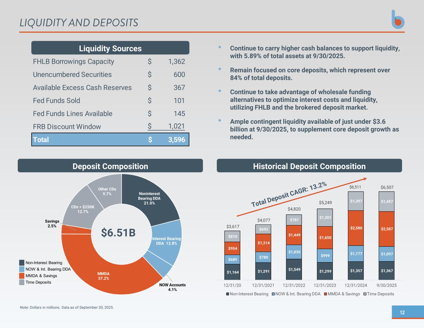 2025年9月30日に終了した四半期の預金残高は、連動四半期から8,720万ドル(1.36%)、年率換算で5.39%増加した。平均利付預金は9,220万ドル(1.83%)増加し、非利付預金は2,280万ドル(1.76%)増加しました。