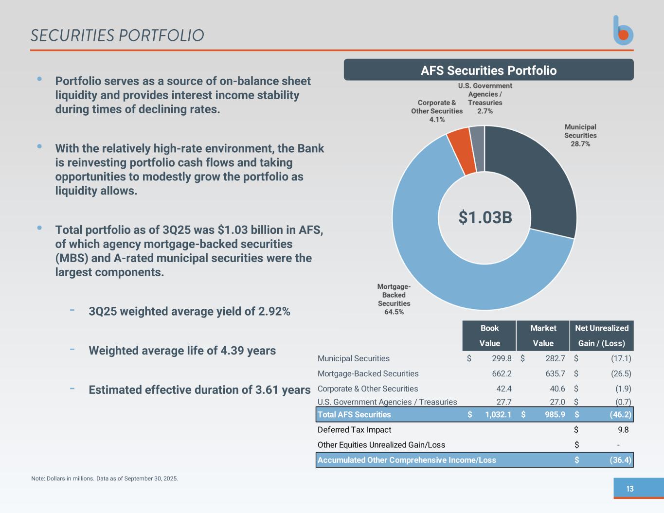 有価証券ポートフォリオは、前年同期から 5,950 万ドル(6.42%)増加した。この増加は、1,440万ドルの税引前公正価値調整によるもので、残りは主にモーゲージ担保証券の購入によるものである。推定公正価値に基づく有価証券ポートフォリオは、2025年9月30日現在、総資産の12.40%を占めていた。新たに購入した有価証券により、2025年9月30日現在の有価証券ポートフォリオの帳簿利回りは2.77%から2.92%に上昇した。