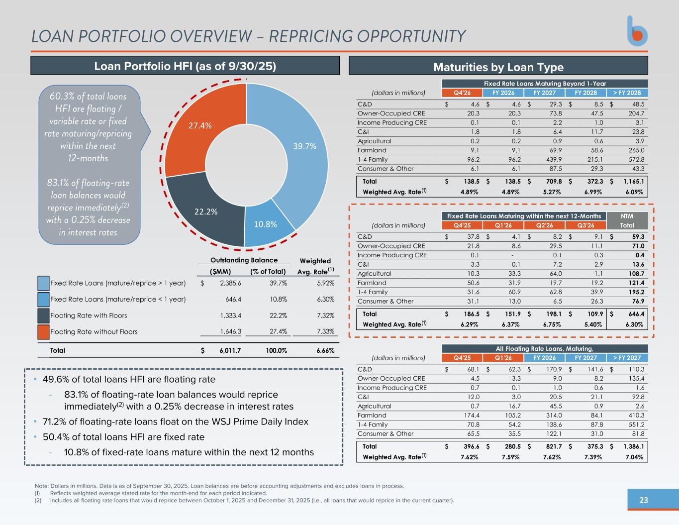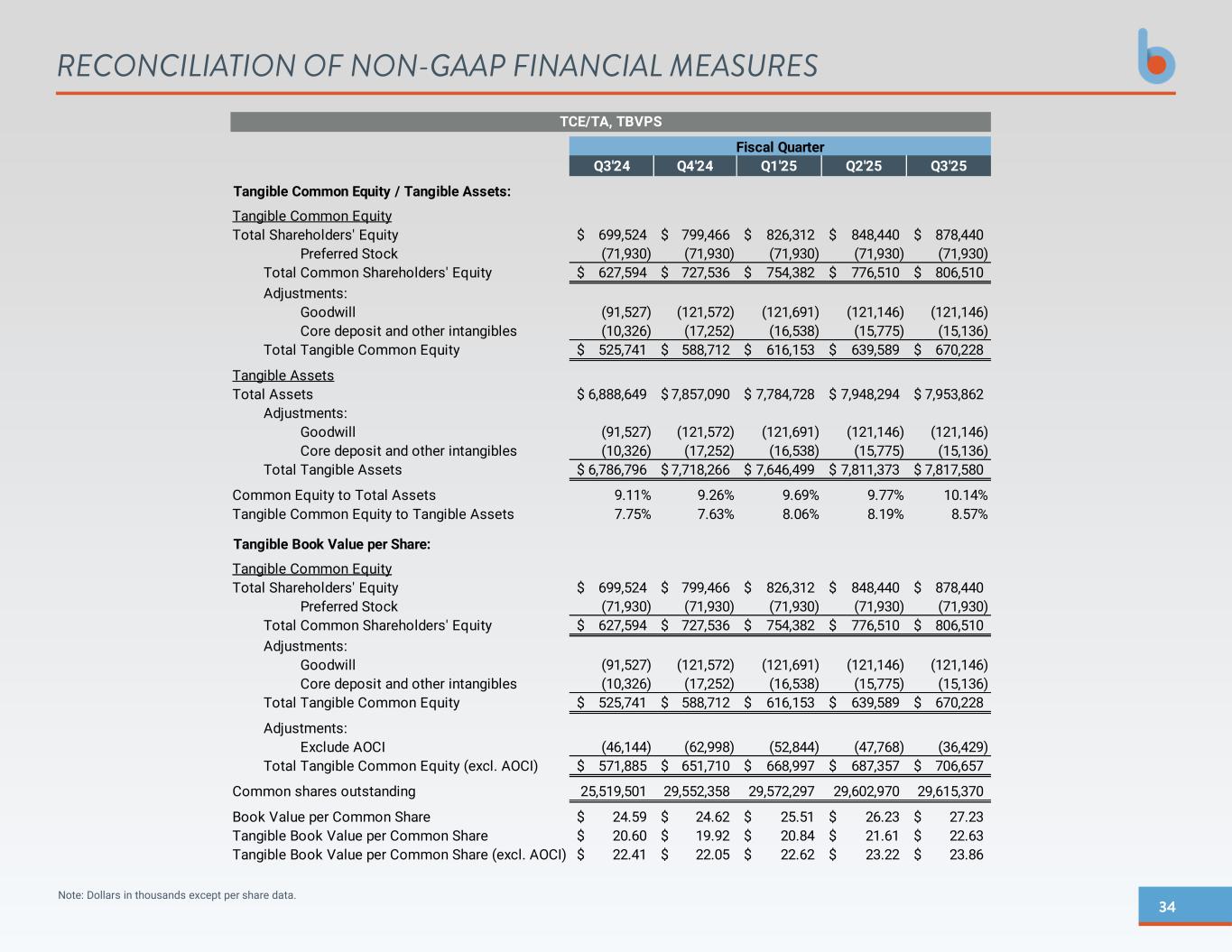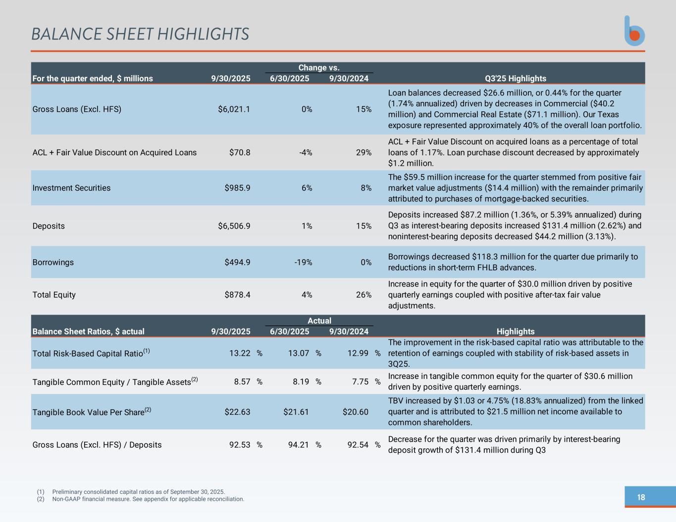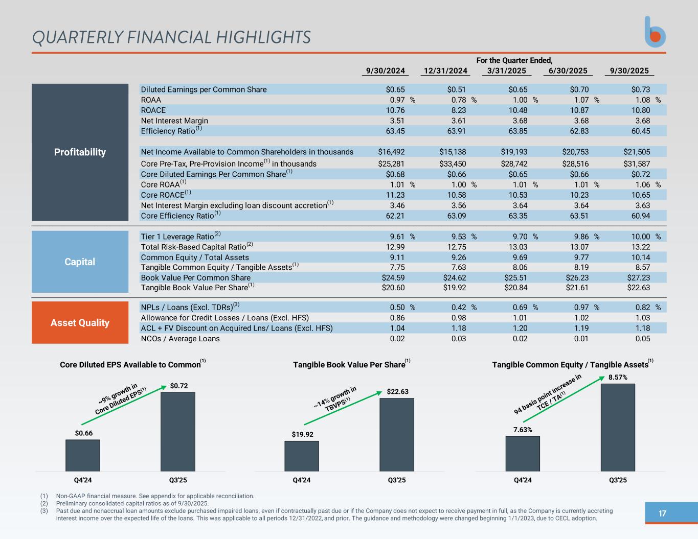 -資本成長の継続。総資産に対する普通資本の比率は 9.77%から 10.14%に上昇した。有形固定資産に対する有形普通資本は8.19%から8.57%に増加し、連結四半期比では4.71%、年率換算では18.68%増加した。非GAAP基準では、2025年9月30日現在の普通株式1株当たり有形簿価は22.63ドルに増加し、前四半期比で1.02ドル増、年率換算で4.75%増、18.83%増となった。この増加は主に利益およびその他の包括利益累計額(AOCI)によるもので、4.75%の増加のうち0.38ドル(1.78%)を占めた。
