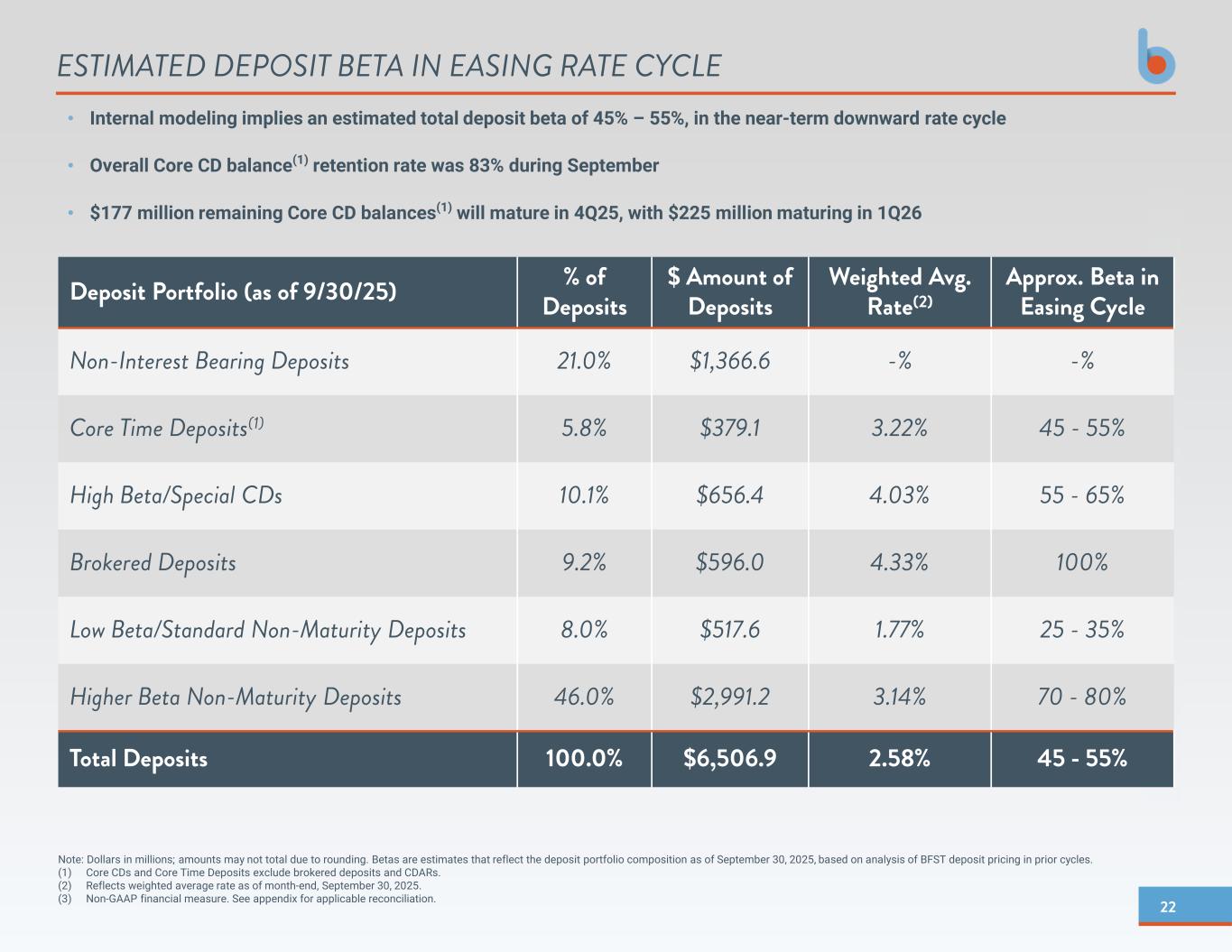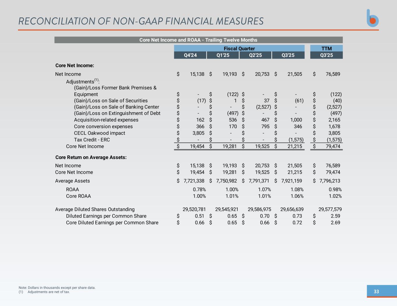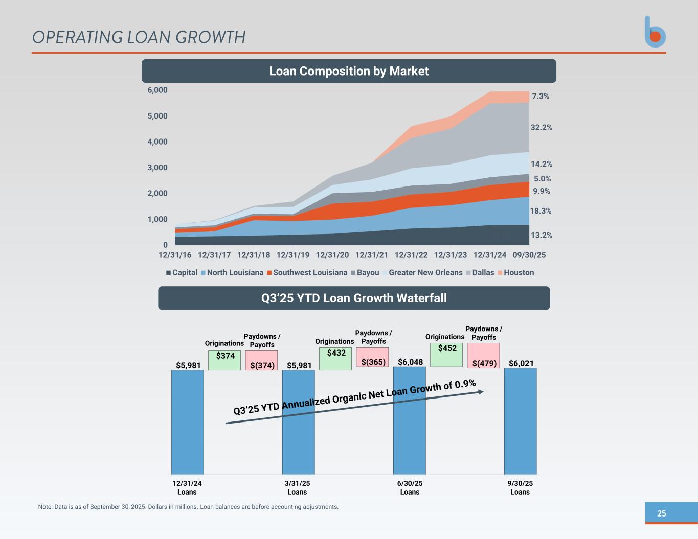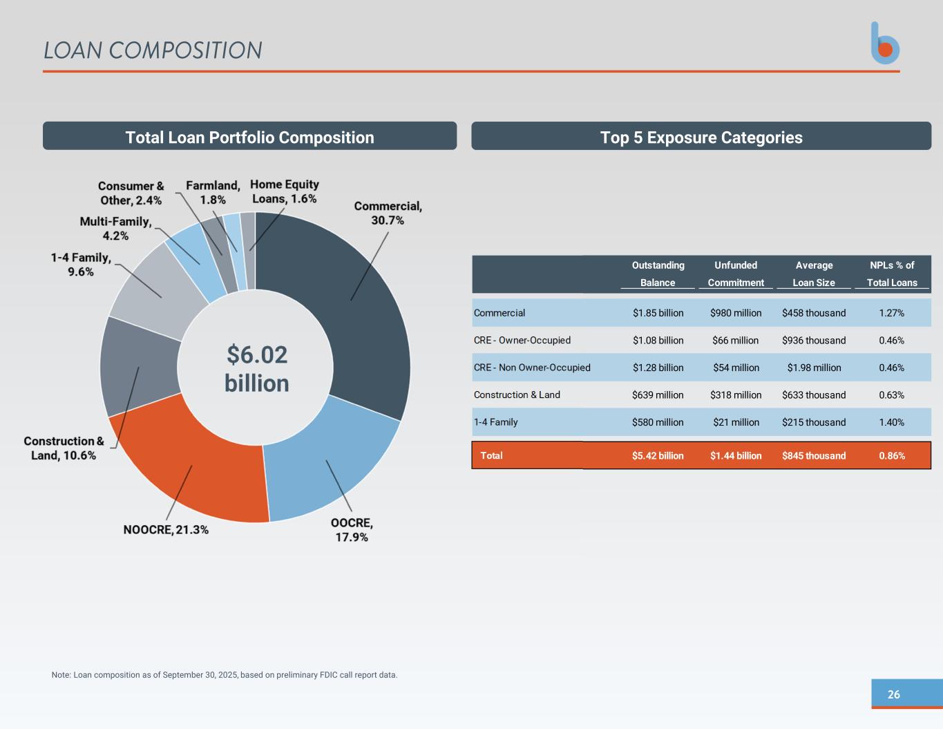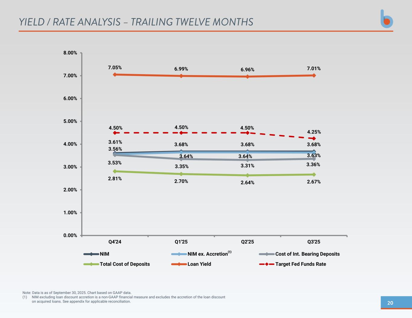 -資本成長の継続。総資産に対する普通資本の比率は 9.77%から 10.14%に上昇した。有形固定資産に対する有形普通資本は8.19%から8.57%に増加し、連結四半期比では4.71%、年率換算では18.68%増加した。非GAAP基準では、2025年9月30日現在の普通株式1株当たり有形簿価は22.63ドルに増加し、前四半期比で1.02ドル増、年率換算で4.75%増、18.83%増となった。この増加は主に利益およびその他の包括利益累計額(AOCI)によるもので、4.75%の増加のうち0.38ドル(1.78%)を占めた。
