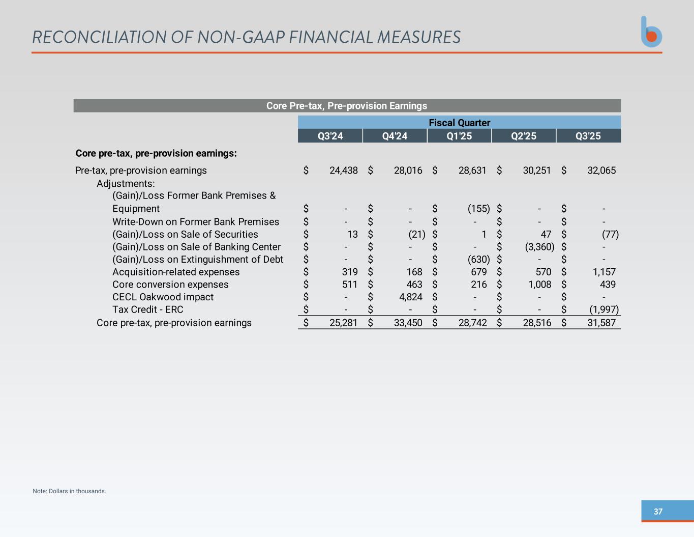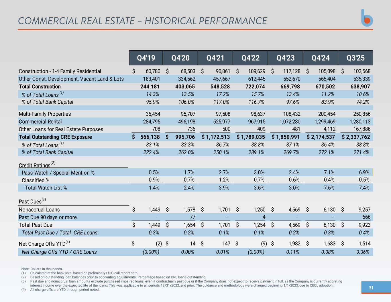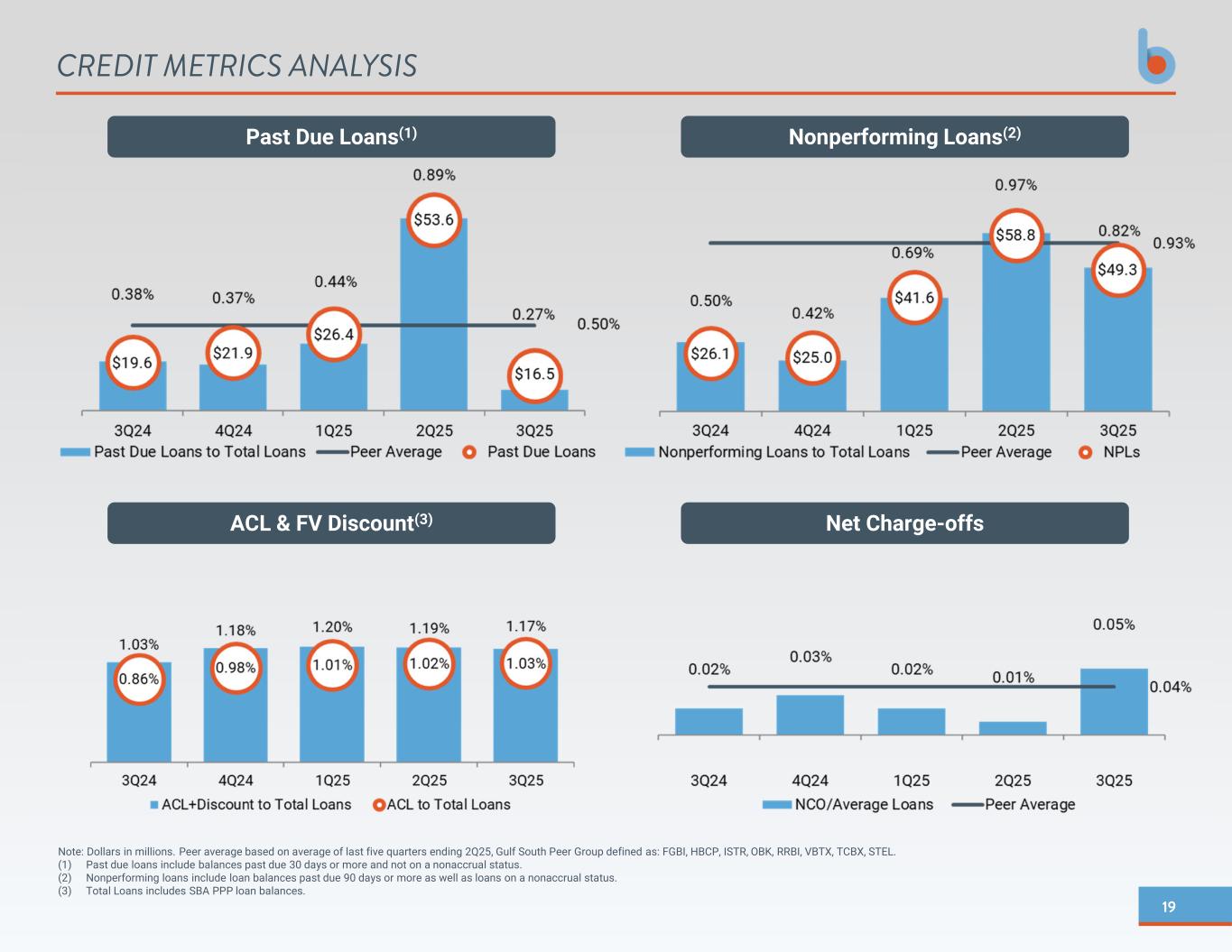 -安定した純金利マージン(NIM)。正味受取利息は 6,930 万ドル、正味金利マージンは 3.68%、正味金利スプレッドは 2.85%でした(前年同期は 6,700 万ドル、3.68%、2.88%)。2025年9月30日に終了した四半期のNon-GAAPベースの純金利マージンは3.63%、純金利スプレッドは2.80%でした(ローン割引増額110万ドルを除く)。