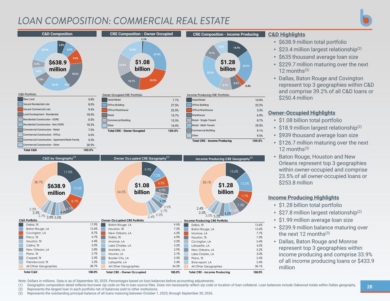 投資目的で保有する貸出金は、2,660 万ドル(0.44%、年率 1.74%)減少しました。商業用および商業用不動産ポートフォリオは、連 結四半期と比べそれぞれ 4,020 万ドル、7,110 万ドル減少しました。建設および住宅ローン・ポートフォリオは、連 結四半期と比べ、それぞれ3,860万ドルおよび4,760万ドル増加しました。2025年9月30日現在、テキサス州を拠点とするローンは、未払い元本残高ベースでローン・ポートフォリオ全体の約40%を占めている。