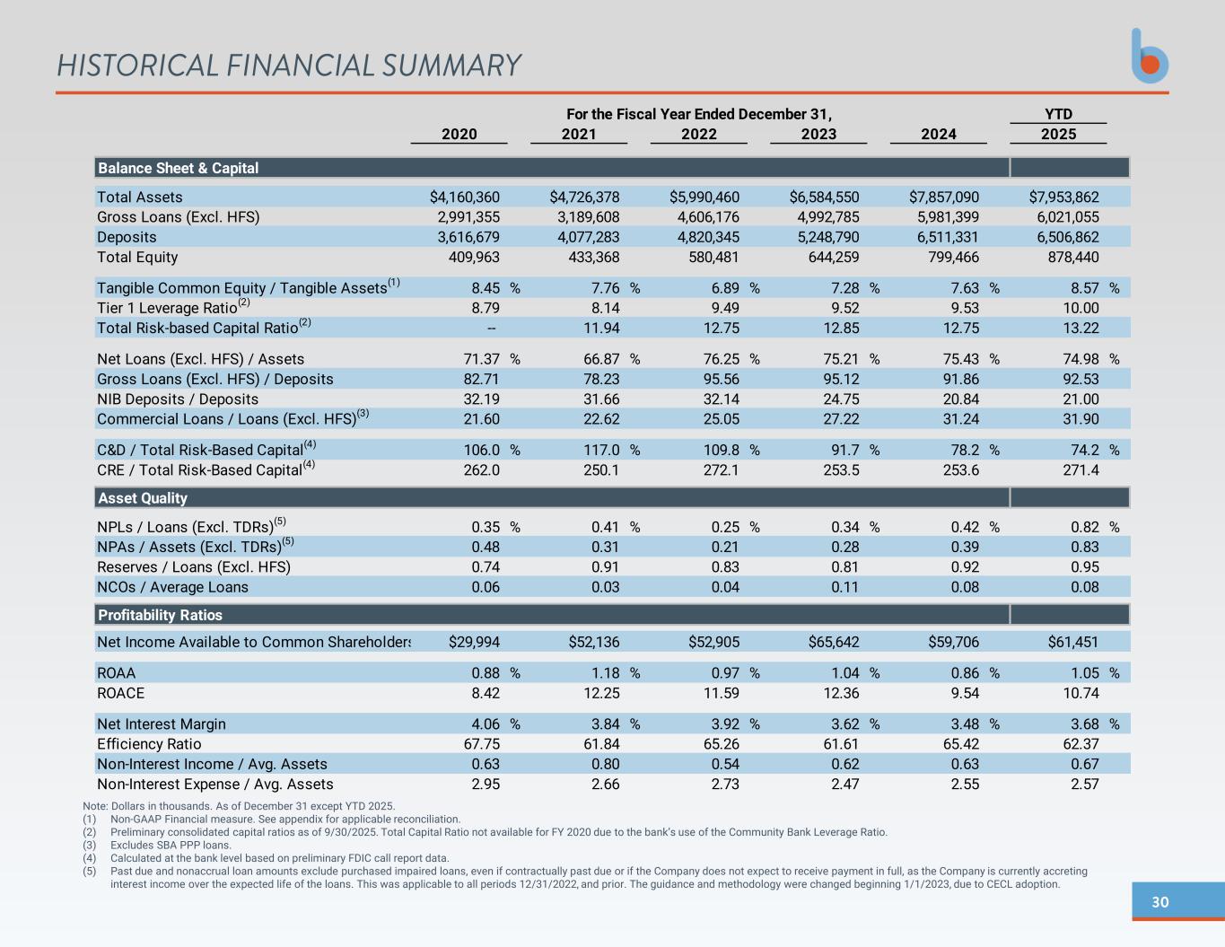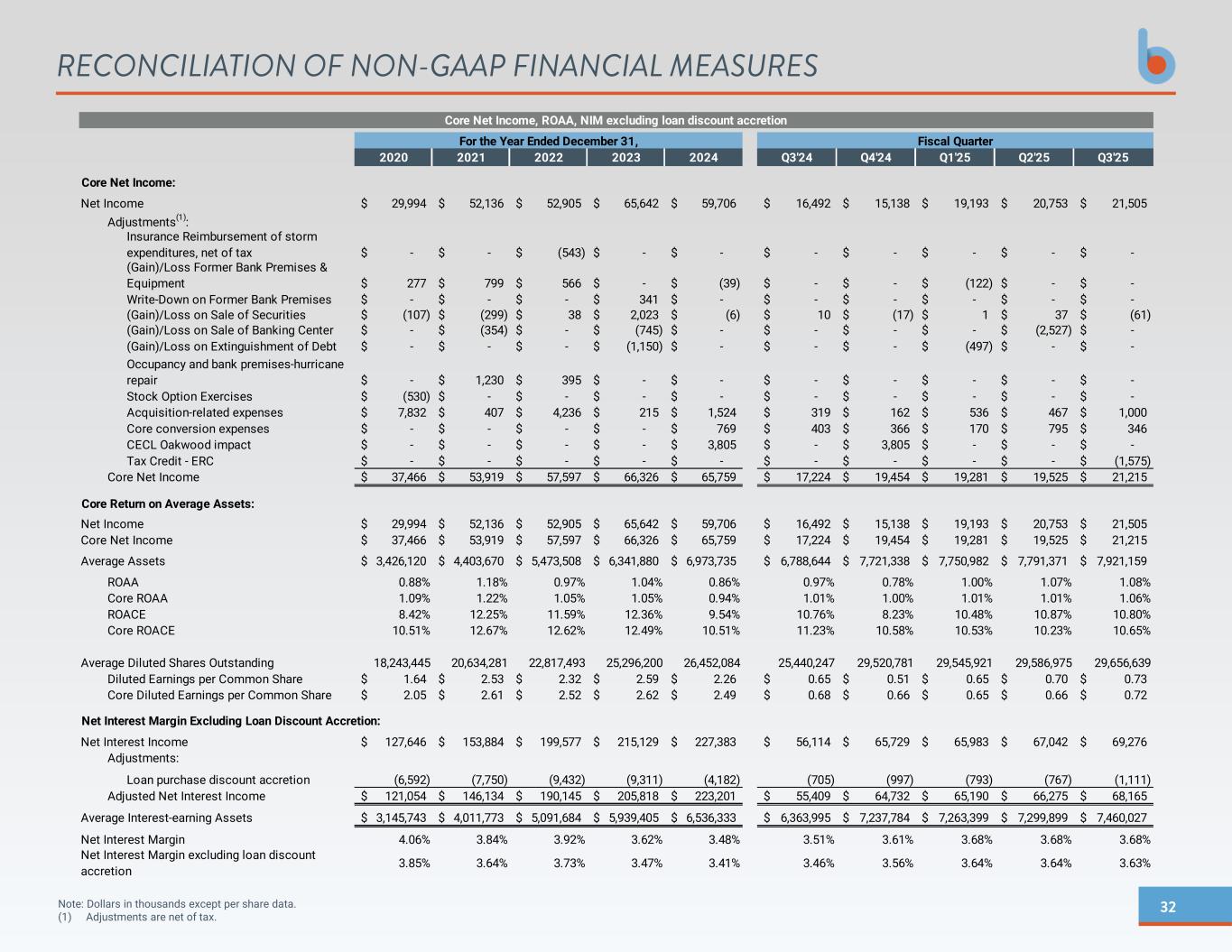 株主資本は、前年同期から 3,000 万ドル(3.54%)増加しました。その他の包括利益累計額(AOCI)は、有価証券ポートフォリオの税引後公正価値調整により、当四半期に1,130万ドル(23.74%)増加しました。2025年9月30日現在の普通株式1株当たり簿価は27.23ドルとなり、2025年6月30日現在の26.23ドルから上昇しました。非GAAP基準では、普通株式1株当たり有形簿価はリンク先の四半期の21.61ドルから2025年9月30日現在では22.63ドルへと4.75%(年率換算で18.83%)増加した。