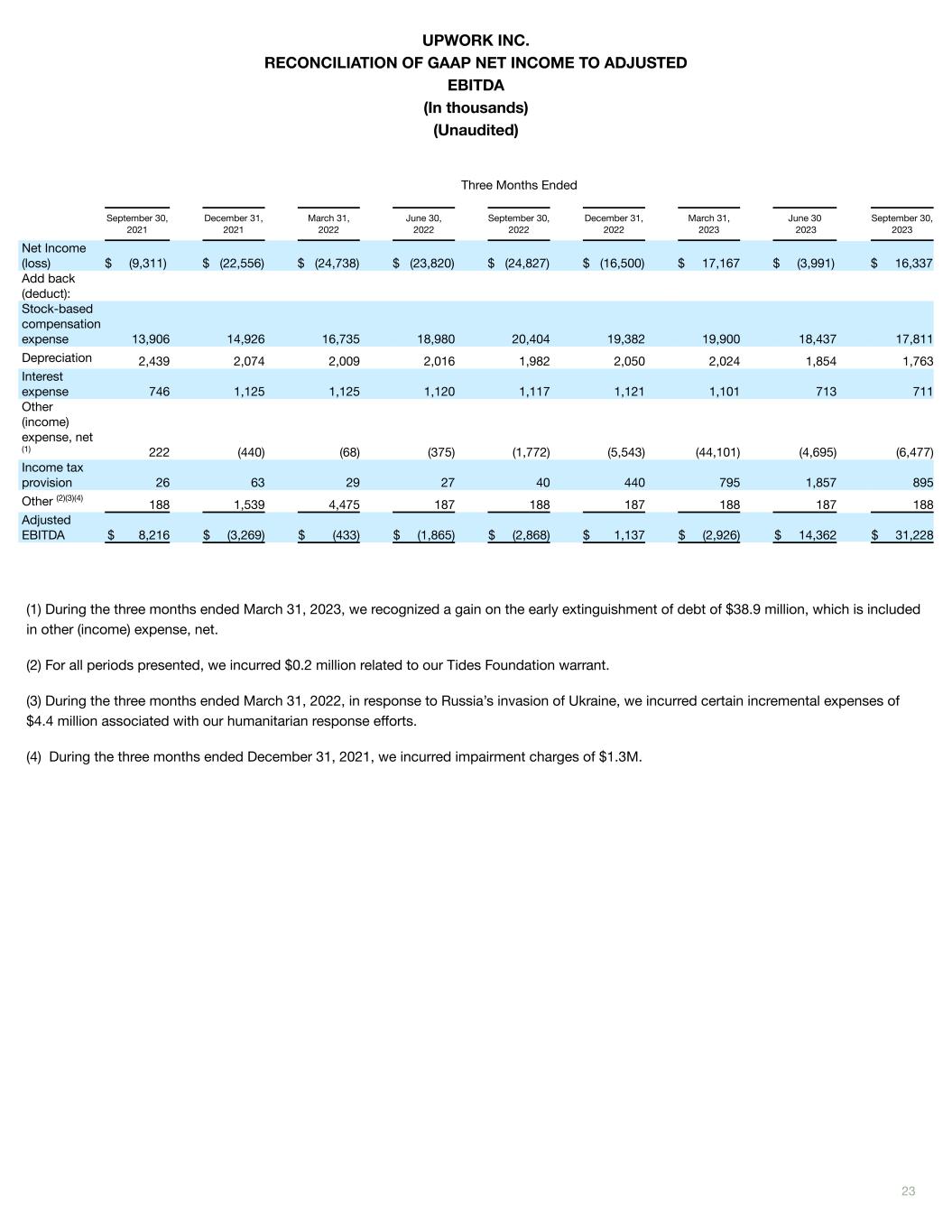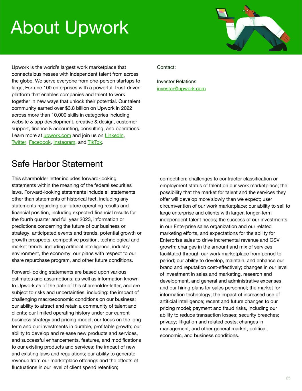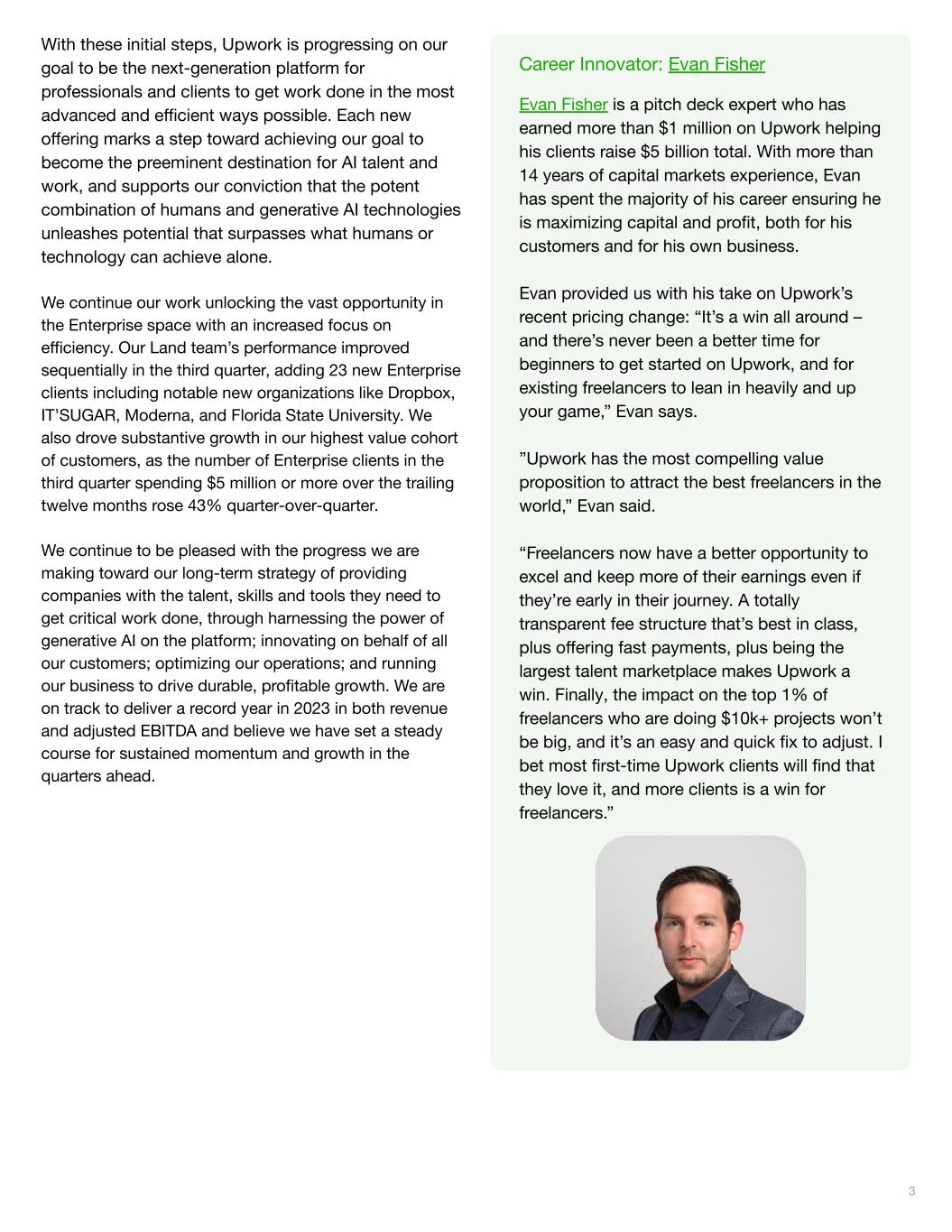 With these initial steps, Upwork is progressing on our goal to be the next-generation platform for professionals and clients to get work done in the most advanced and efficient ways possible. Each new offering marks a step toward achieving our goal to become the preeminent destination for AI talent and work, and supports our conviction that the potent combination of humans and generative AI technologies unleashes potential that surpasses what humans or technology can achieve alone. We continue our work unlocking the vast opportunity in the Enterprise space with an increased focus on efficiency. Our Land team’s performance improved sequentially in the third quarter, adding 23 new Enterprise clients including notable new organizations like Dropbox, IT’SUGAR, Moderna, and Florida State University. We also drove substantive growth in our highest value cohort of customers, as the number of Enterprise clients in the third quarter spending $5 million or more over the trailing twelve months rose 43% quarter-over-quarter. We continue to be pleased with the progress we are making toward our long-term strategy of providing companies with the talent, skills and tools they need to get critical work done, through harnessing the power of generative AI on the platform; innovating on behalf of all our customers; optimizing our operations; and running our business to drive durable, profitable growth. We are on track to deliver a record year in 2023 in both revenue and adjusted EBITDA and believe we have set a steady course for sustained momentum and growth in the quarters ahead. 3 Career Innovator: Evan Fisher Evan Fisher is a pitch deck expert who has earned more than $1 million on Upwork helping his clients raise $5 billion total. With more than 14 years of capital markets experience, Evan has spent the majority of his career ensuring he is maximizing capital and profit, both for his customers and for his own business. Evan provided us with his take on Upwork’s recent pricing change: “It’s a win all around – and there’s never been a better time for beginners to get started on Upwork, and for existing freelancers to lean in heavily and up your game,” Evan says. ”Upwork has the most compelling value proposition to attract the best freelancers in the world,” Evan said. “Freelancers now have a better opportunity to excel and keep more of their earnings even if they’re early in their journey. A totally transparent fee structure that’s best in class, plus offering fast payments, plus being the largest talent marketplace makes Upwork a win. Finally, the impact on the top 1% of freelancers who are doing $10k+ projects won’t be big, and it’s an easy and quick fix to adjust. I bet most first-time Upwork clients will find that they love it, and more clients is a win for freelancers.”