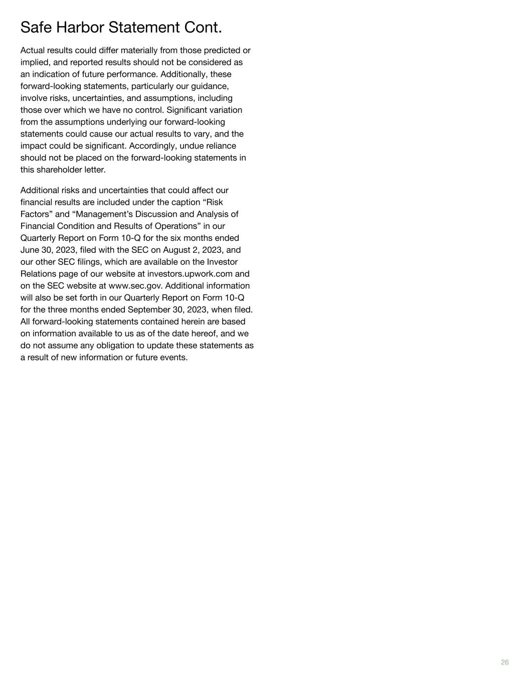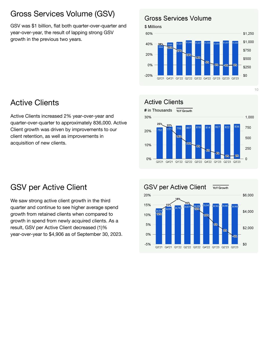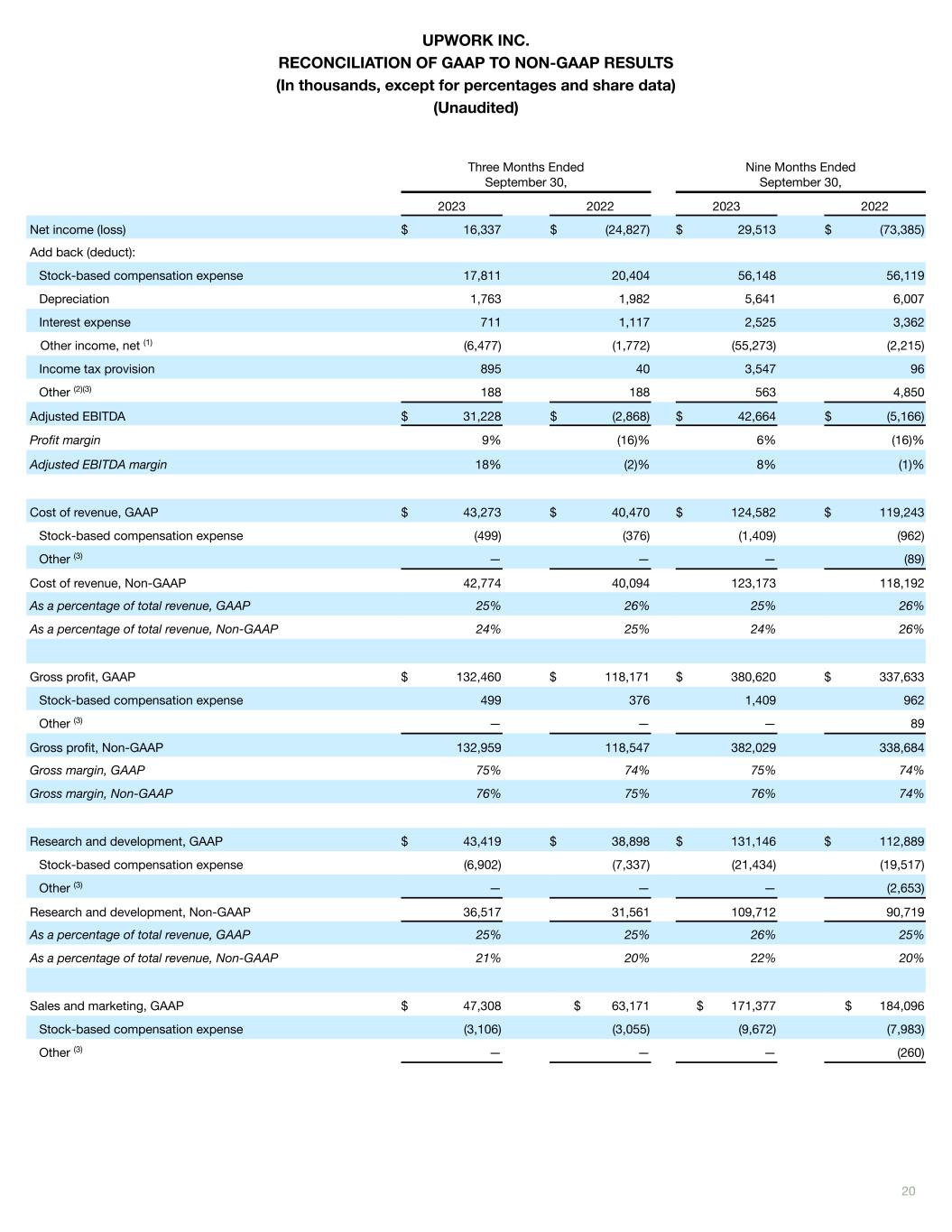 AI Enhancements That Benefit Our Customers We have strong conviction that growth opportunities in AI are a tailwind for our business, and providing access to new generative AI tools into the hands of our customers was again a top priority in the third quarter. We have continued advancing our approach to leveraging AI in three primary ways: 1. Innovating new AI-powered features and platform experiences across every category of work. 2. Giving talent on Upwork access to the most modern generative AI tools to supercharge their productivity and quality of work. 3. Serving clients with a singular destination for sourcing the full breadth of AI-focused talent they need. We focused on innovative ways to continue making professionals on Upwork the most AI-enabled talent in the world, which benefits talent’s productivity, quality of work and earnings, ultimately driving better outcomes for clients across all categories of work on our marketplace. By enabling professionals on Upwork to be even more efficient and effective, we continue to deepen and grow the pool of highly skilled talent that businesses can partner with and encourage repeat projects and client retention. Q3’23 Business Highlights 44 Along with the AI Services hub, we continue to add AI-based tools to better support clients in connecting with and evaluating talent, and support professionals in finding and securing work. The job post generator, which helps reduce friction for clients by aiding them in accurately describing their needs and increasing the speed with which they can post jobs, was released to new users and has continued to increase the quality of job posts and cut the time to post a job nearly in half for those using it. Early findings from the use of proposal tips, which aim to enhance the way professionals display their unique talent and differentiate themselves to win more work, show that freelancers using the tool secure work at a higher rate. The efficacy of these tools, along with our newly released Upwork Chat Pro, demonstrate our ability to integrate AI solutions directly into the most common workflows on our platform, rapidly improving our clients’ ability to post jobs and hire talent, and helping independent professionals find, land and complete projects