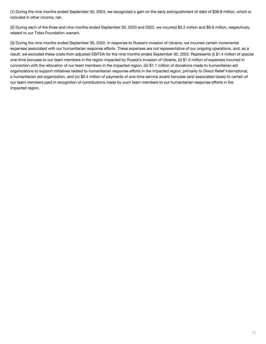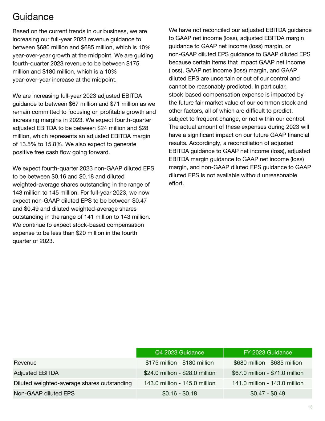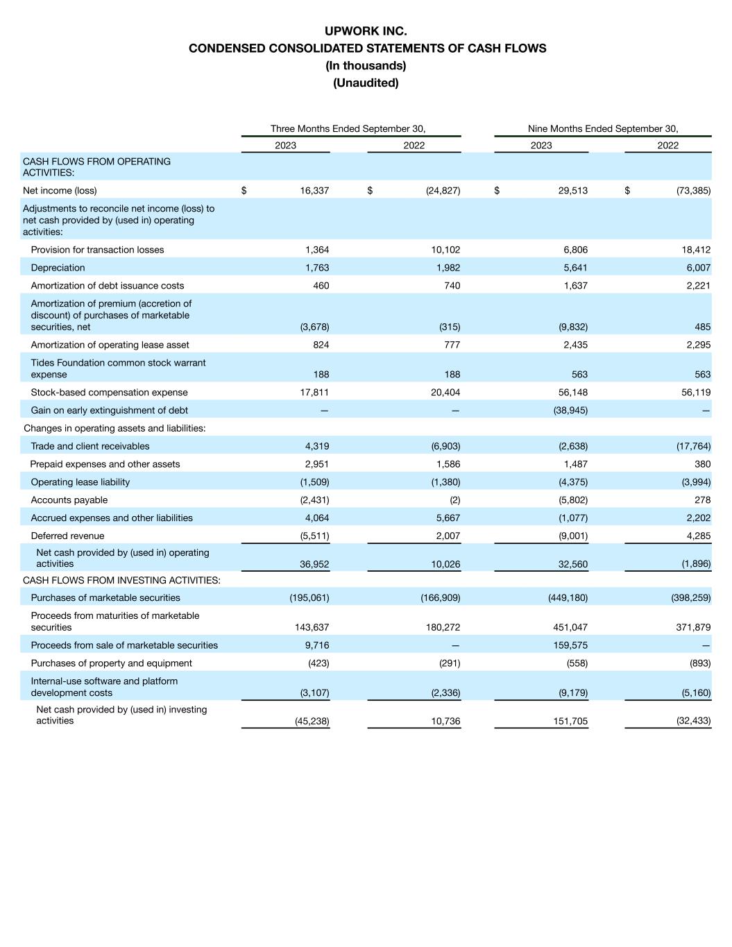 These include adding new features and functionality to the platform, bringing AI-enabled experiences and work to clients and talent, and engaging in valuable new partnerships that will deliver differentiated tools and resources to our customers to drive lasting shareholder value. One of our most ambitious growth goals is to foster the most AI-empowered independent professionals in the world. In pursuit of this, we greatly enhanced our AI Services hub, which has seen a 10x increase in average monthly visitors since its launch in the second quarter and, just yesterday, announced an extension of the hub with a new suite of generative AI apps, offers and educational content specially designed for talent. Our scale as the world’s work marketplace has aided us in creating a deep and diverse ecosystem of partners that span education, technology and special offers for clients and talent. New featured partnerships for AI-powered apps and offers for independent professionals include industry-leading companies like Adobe, Amazon, ClickUp and Miro that have advanced integration of generative AI into their tools and services, alongside educational AI skills-based courses and content from leading providers like Coursera, Jasper and Udemy that form a new Education Marketplace on Upwork Academy. We also launched limited access to Upwork Chat Pro, a new generative AI application embedded directly on Upwork’s platform and powered by GPT-4. Upwork Chat Pro utilizes unique insights from Upwork about independent professionals to provide specific, contextualized responses and recommendations that are relevant to the needs of professionals on Upwork, assisting them in starting, creating and completing projects more efficiently and effectively. In the third quarter of 2023, Upwork continued to drive durable, profitable growth, while advancing our position as the world’s work marketplace. We made significant progress on our goal to become the preeminent destination for AI-related talent and work, while also improving the efficiency, effectiveness, and speed to match on our platform through improvements to our core product experiences and capabilities. We achieved better-than-expected results across our financial goals, generating third-quarter 2023 revenue of $175.7 million, up 11% from a year ago. We recorded GAAP net income of $16.3 million and adjusted EBITDA of $31.2 million this quarter, demonstrating very rapid margin improvement compared to GAAP net loss of $(24.8) million and adjusted EBITDA loss of $(2.9) million in the third quarter of 2022. Our strong third-quarter adjusted EBITDA results are due to strong growth in revenue as well as the implementation of cost optimization programs across our business, resulting in unit cost improvements in transaction losses, sales and marketing, and other areas. Our focus on profitable growth has also strengthened our balance sheet, with cash from operating activities of $37 million in the third quarter. Due to our strong execution, we are raising our revenue and adjusted EBITDA guidance for 2023 to $680 million to $685 million in revenue, or 10% to 11% year-over-year growth, and $67 million to $71 million of adjusted EBITDA. We are also pleased to announce that our Board of Directors has approved a share repurchase program, with authorization to purchase up to $100 million of our outstanding shares of common stock. While we continue to capture opportunities for cost optimization, we also remain committed to investing in growth. We expect the third quarter to be the high point for adjusted EBITDA margin in 2023, as we continue to invest in near- and long-term growth opportunities. Dear Shareholders 2