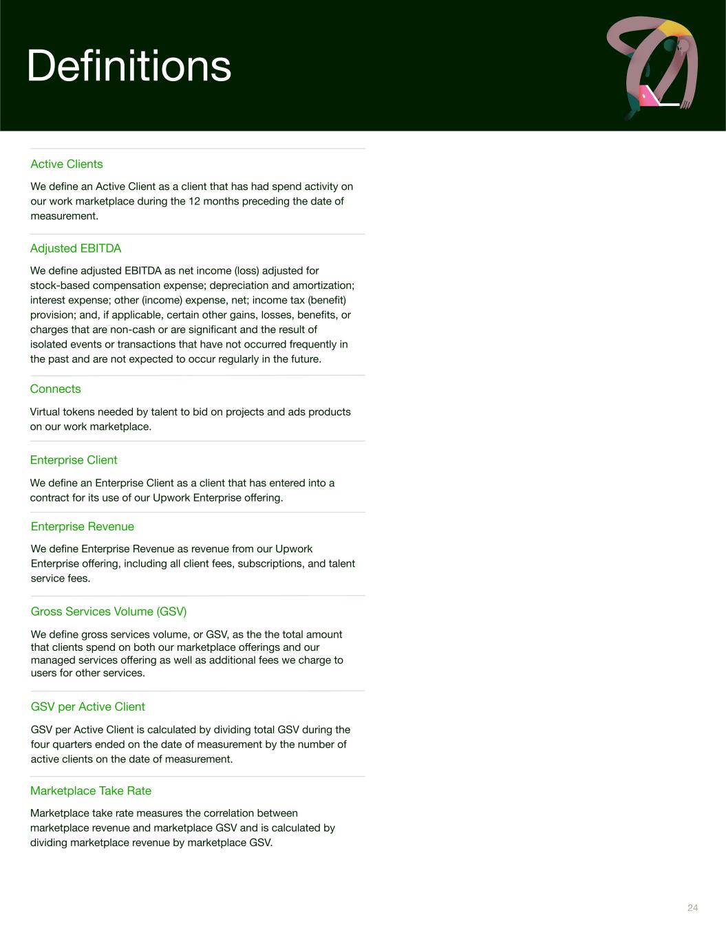 5 Career Innovator: Jennifer Davis Austin-based freelancer Jennifer Davis holds a PhD from Georgetown University. She currently works on Upwork as an AI and Machine Learning Consultant and teaches at Columbia University. Following a post-doctoral fellowship, Jennifer worked at the MD Anderson Cancer Center where she became very interested in supercomputing while conducting cancer research. She decided to accept a role with Accenture and fell in love with consulting. At IBM, she led teams and business development across the United States and Europe, oversaw and developed proposals for complex data science projects, and helped internally with the design of artificial intelligence products geared towards healthcare and pharmaceuticals. She was happy with what she was doing, but didn’t love traveling 80 percent of the time. That’s when she started finding work on Upwork. “Upwork was one of the best things that ever happened to me,” she said. Jennifer says her main focus on Upwork is helping customers solve problems that we “really can’t wait decades to solve.” That's where freelancers like Jennifer come in -- They are helping companies rethink the way they approach their biggest challenges and advance their most critical goals. Jennifer’s favorite type of client is one with a “blue sky project” that seems impossible but she knows isn't. “When it comes to AI, people think there’s no human in the loop. There is always going to be some human intervention in order for us to harness the power it offers,” Jennifer says. Ads Tools Lead to a More Efficient Marketplace We are building a Talent Marketplace that is efficient, equitable, and optimized for growth by matching talent and clients at scale to fill more jobs. We have been gradually building an ads products ecosystem to help high-intent talent find more personalized pathways to match with clients. We’re excited about the increased customer value and revenue growth we’ve seen from our ads products. The products introduced last year, such as Availability Badges and Boosted Proposals, have had clear and positive outcomes for those who use them. Talent using our Availability Badges have received 50% more invites, and clients are 62% more likely to get their invites accepted by these badged talent. The use of Boosted Proposals increases a boosted professional’s likelihood to get hired by 24%. Our suite of ads products is already leading to a more efficient and rewarding marketplace for our customers, and delivering significant opportunities to increase freelancer earnings and drive meaningful revenue growth for Upwork. Partnerships and Platform Improvements That Equip Talent and Fulfill Client Needs This year, we have worked to accelerate the expansion of our partner ecosystem. This lets Upwork engage in additive new partnerships that bring differentiated tools and value to our customers, generate new revenue streams and continue to attract high quality talent to our platform.