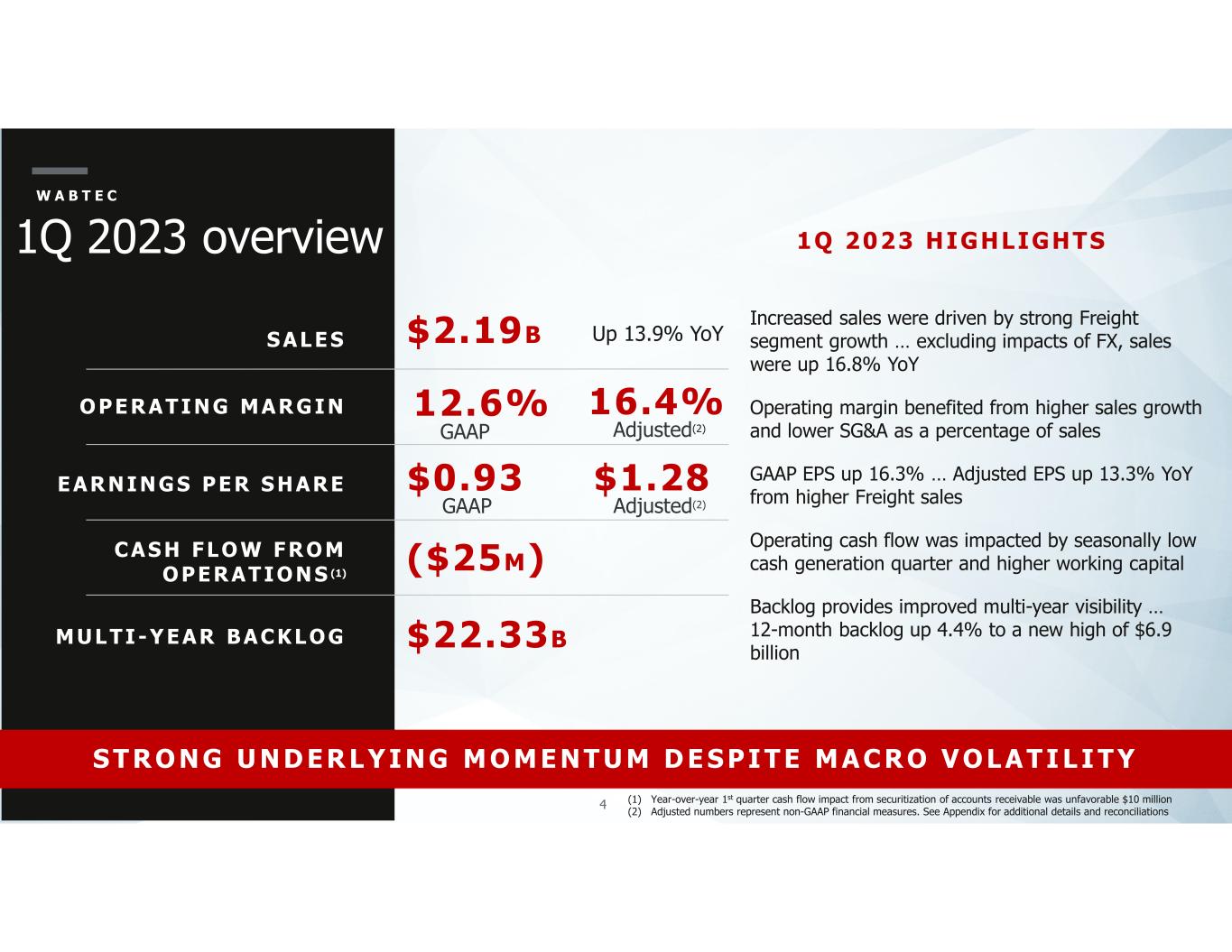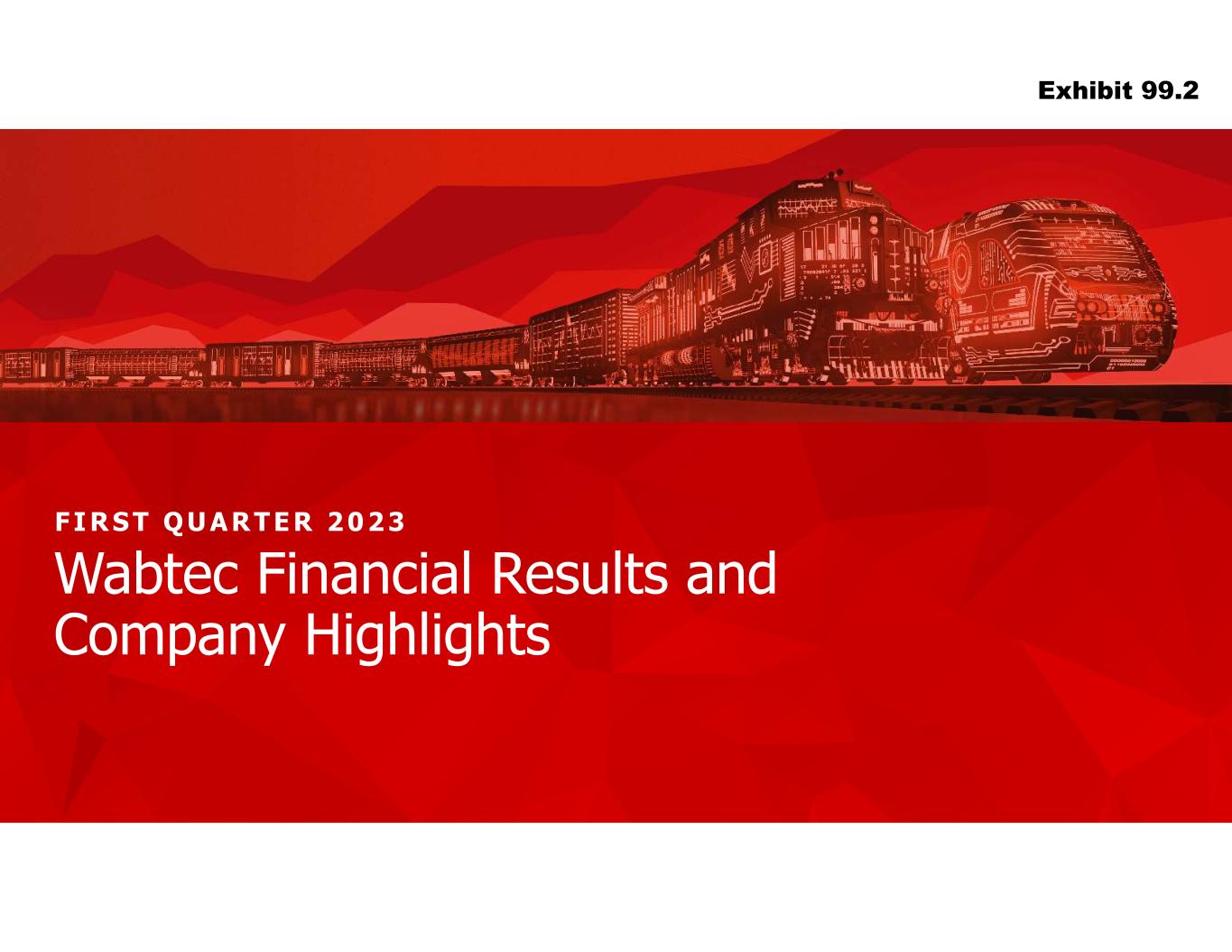PITTSBURGH, April 26, 2023 – Wabtec Corporation (NYSE: WAB) today reported first quarter 2023 GAAP earnings per diluted share of $0.93, up 16.3% versus the first quarter of 2022. Adjusted earnings per diluted share were $1.28, up 13.3% versus the same quarter a year ago. First quarter sales were $2.19 billion driven by strong sales across the portfolio.