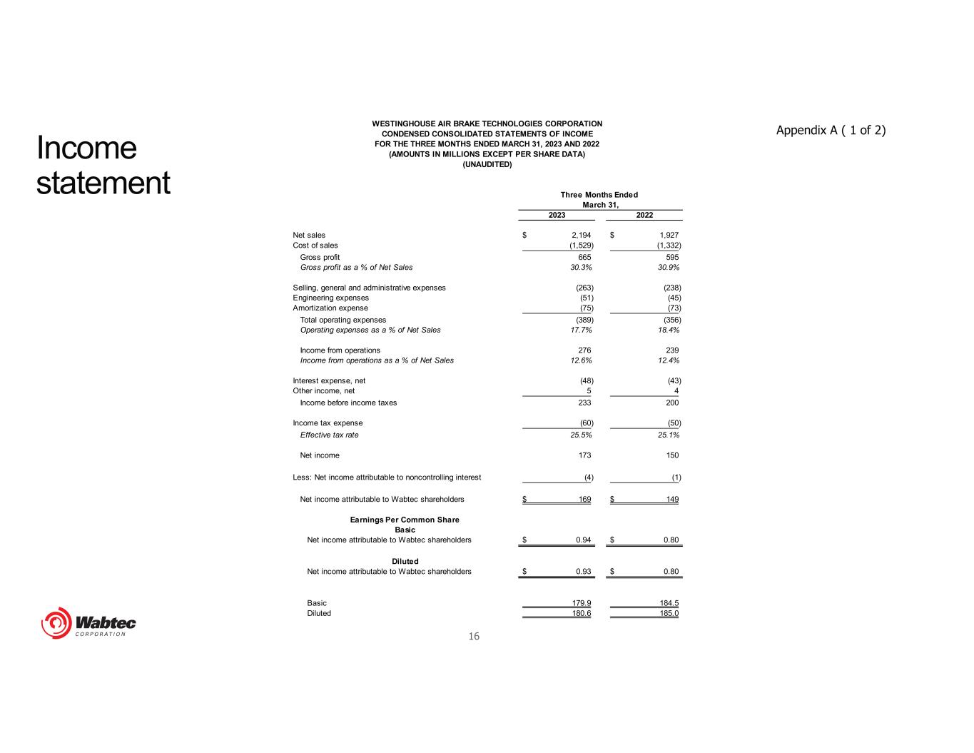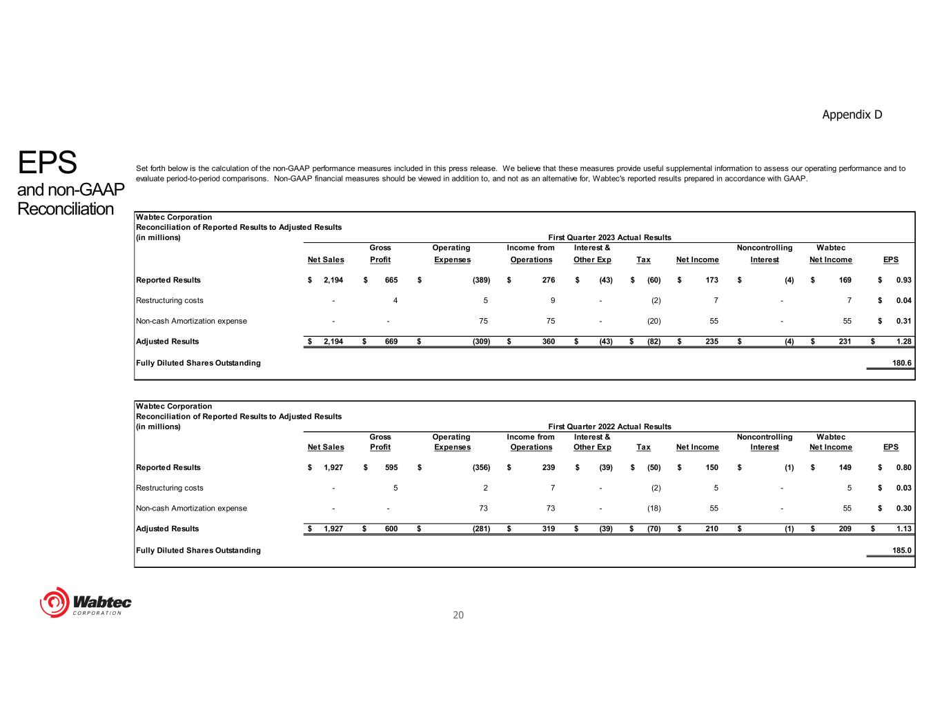 Set forth below is the calculation of the non-GAAP performance measures included in this press release. We believe that these measures provide useful supplemental information to assess our operating performance and to evaluate period-to-period comparisons. Non-GAAP financial measures should be viewed in addition to, and not as an alternative for, Wabtec's reported results prepared in accordance with GAAP.
