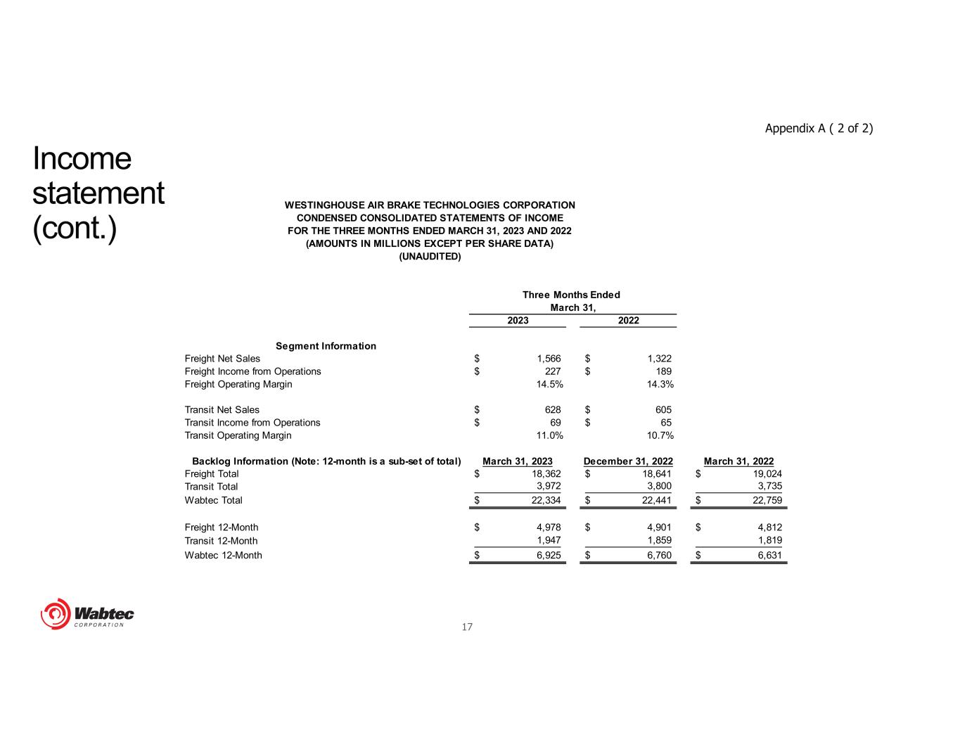 “The Wabtec team delivered a strong start to 2023 demonstrating continued momentum across both our Freight and Transit segments supporting a double-digit percentage increase in earnings per share,” said Rafael Santana, Wabtec’s President and CEO. “We remained resilient in the face of considerable macro-economic challenges by focusing on operational excellence as we continued to deliver for our customers and shareholders. The underlying business fundamentals strengthened in the first quarter despite a challenging environment.”