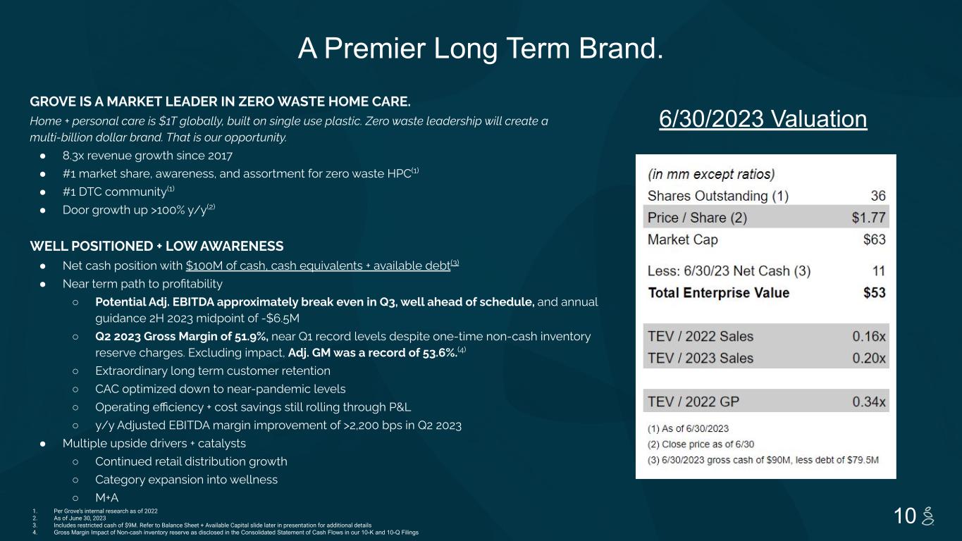 1.1.7.As of the date of this Subscription Agreement, the authorized share capital of Grove consists of 900,000,000 shares of capital stock, 600,000,000 of which are designated as Class A Common Stock, 200,000,000 of which are designated Class B common stock and 100,000,000 of which are designated as preferred stock, each $0.0001 par value per share. As of the date hereof, 29,334,036 shares of Class A Common Stock, 7,818,165 shares of Class B common stock and no shares of preferred stock are issued and outstanding. Without limiting the foregoing, Section 2.2.7 of the Disclosure Schedule sets forth the capitalization of the Company as of August 8, 2023, including the number of shares of Class A Common Stock, Class B common stock and preferred stock: (i) issued and outstanding; (ii) issuable upon exercise or conversion of options, warrants, restricted unit awards, purchase rights, indebtedness and other securities, in each case, whether or not vested (and the exercise, conversion or exchange price therefor); (iii) reserved for issuance (directly or indirectly) pursuant to any equity incentive plans; and (iv) issuable pursuant to earnout or similar provisions. Section 2.2.7 of the Disclosure Schedule is true, correct and complete in all material respects.