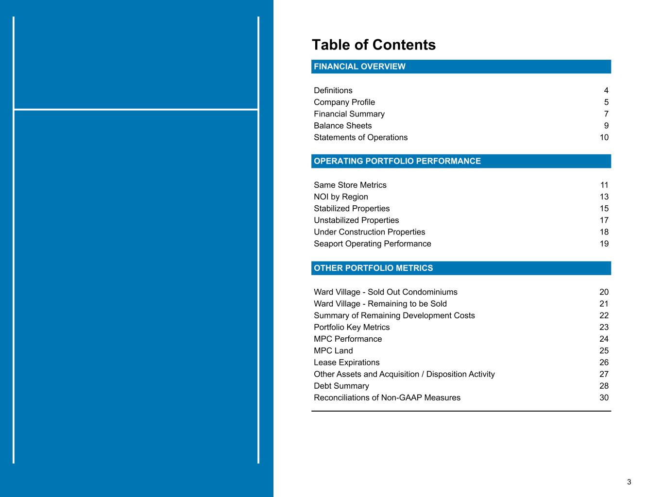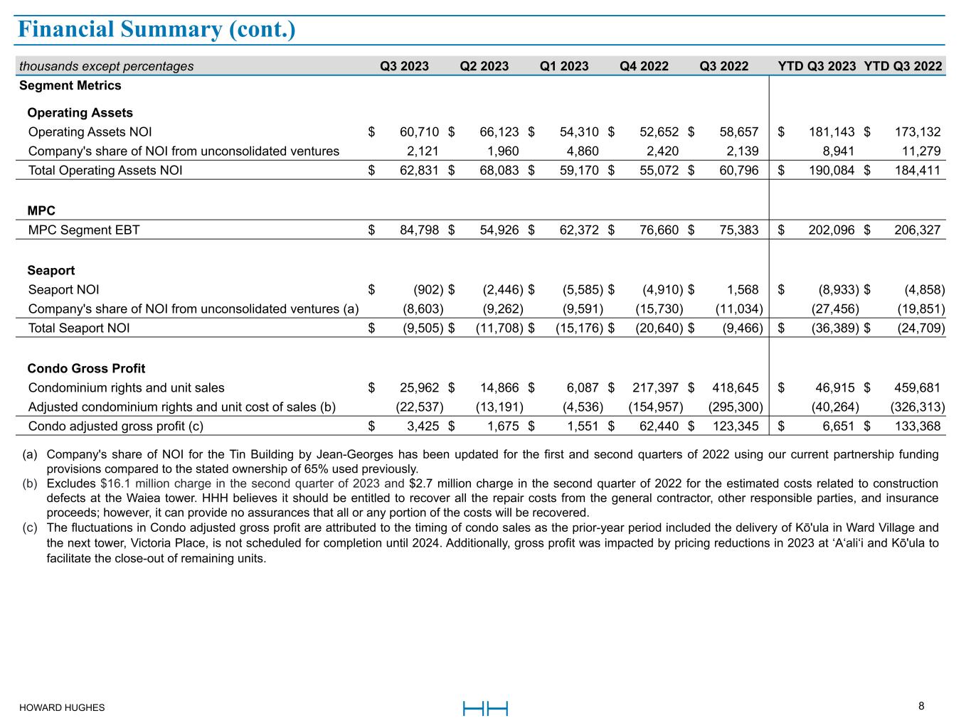 –HHHの第3四半期の純損失は5億4,420万ドル(希薄化後1株当たり10.97ドル)で、これにはシーポート関連の税引き後減損損失5億5,500万ドル(同11.19ドル)が含まれる。前年同期の純利益は1億810万ドル(希薄化後1株当たり2.19ドル)でした。税引き後減損を除くと、前年同期にワードビレッジのKō'ulaの引き渡しが含まれていたため、前年同期の減少は主にコンドミニアムの販売時期によるものです。