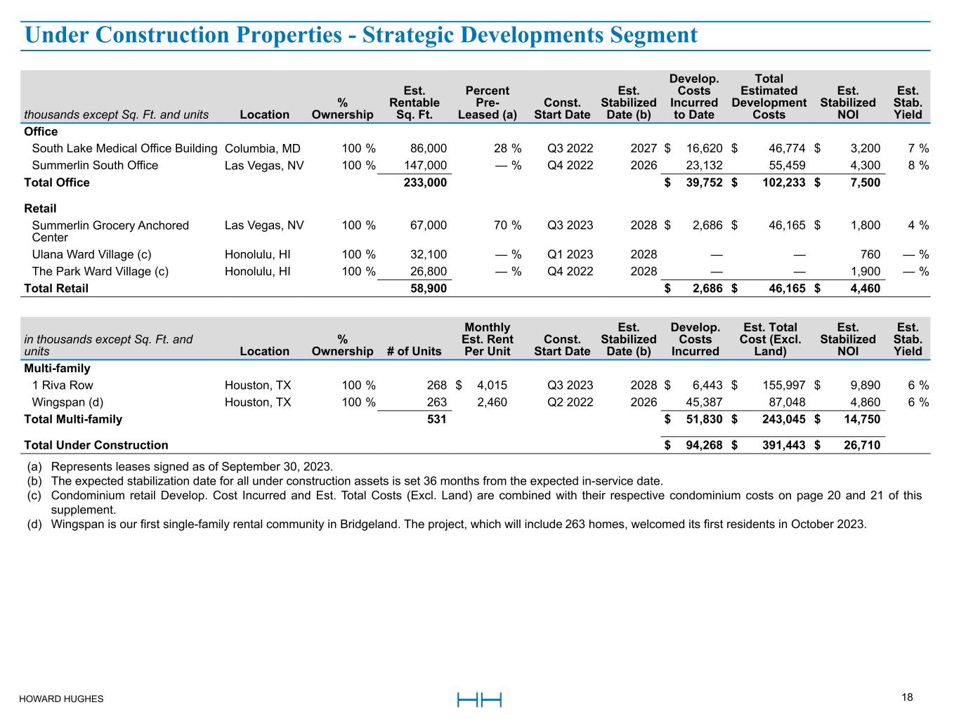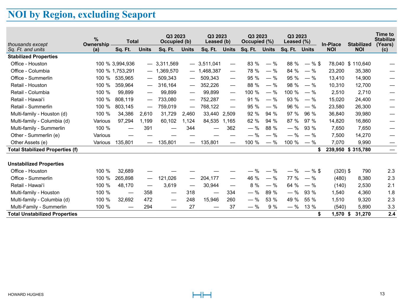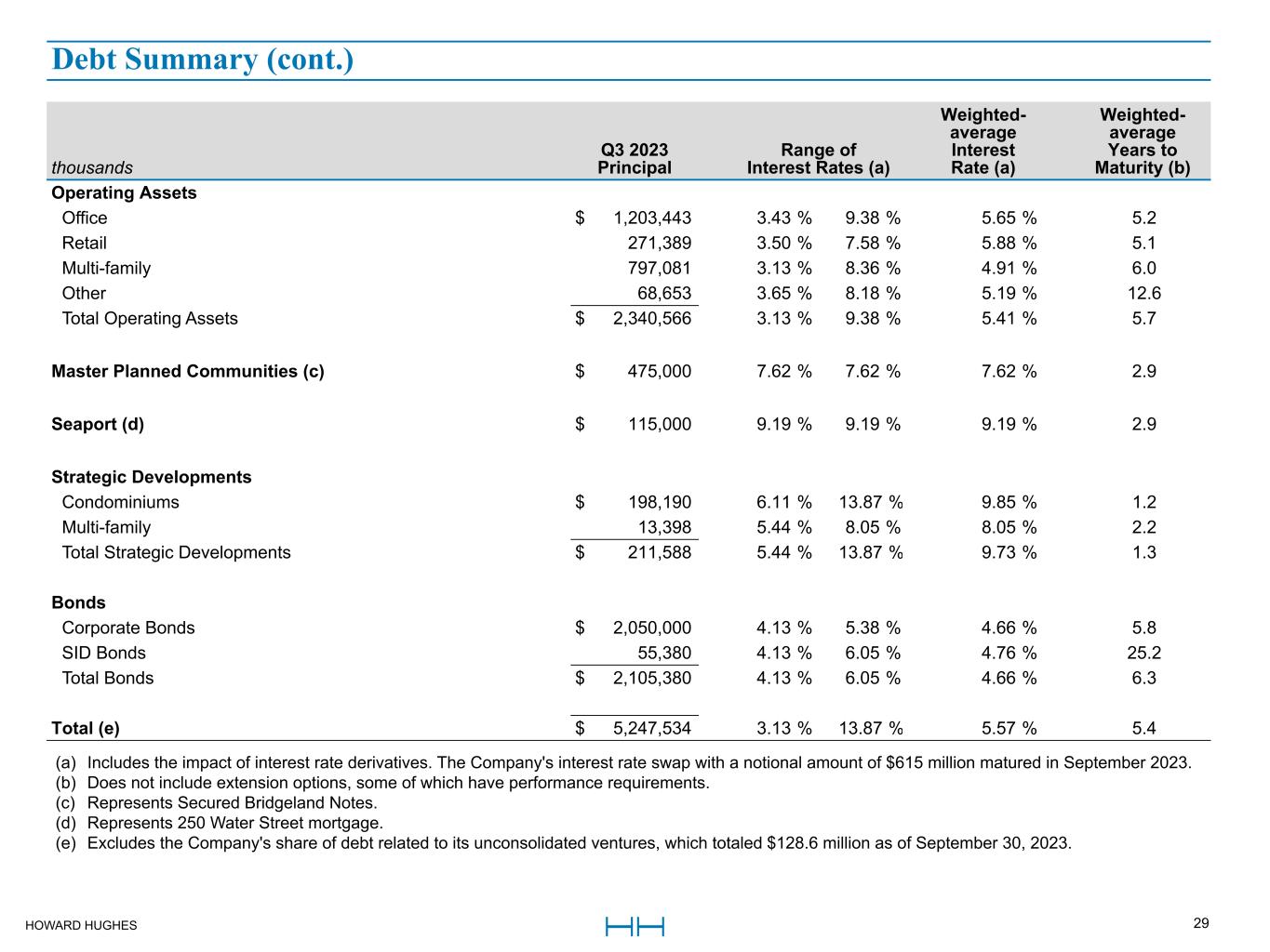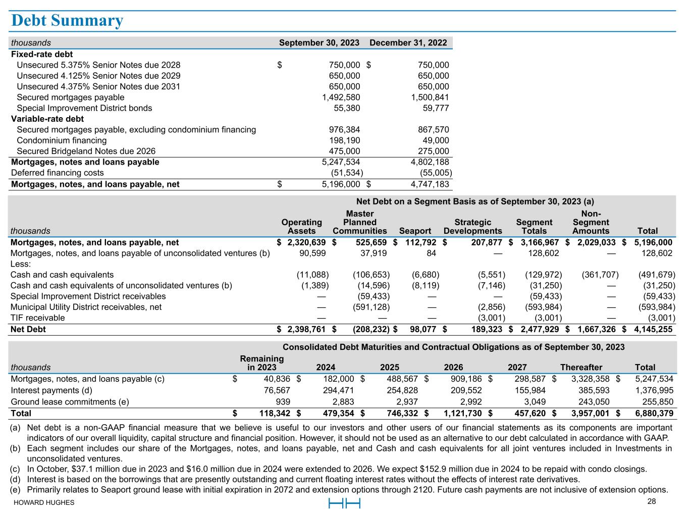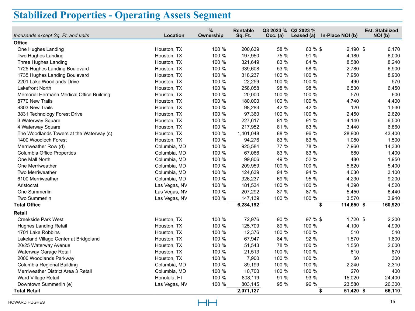 –第3四半期において、HHHはシーポートに関連する5億5,500万ドル(税引き後)の減損損失を計上しました。これは、安定化および収益性が予想以上に長期化しているため、将来の業績が著しく不透明であること、現在のコスト構造に対する圧力、オフィススペースに対する需要の低下、ならびに将来のキャッシュフローを評価するために使用される資本化率の上昇およびレストラン倍率の低下により、見積将来キャッシュフローが減少したことによるものです。