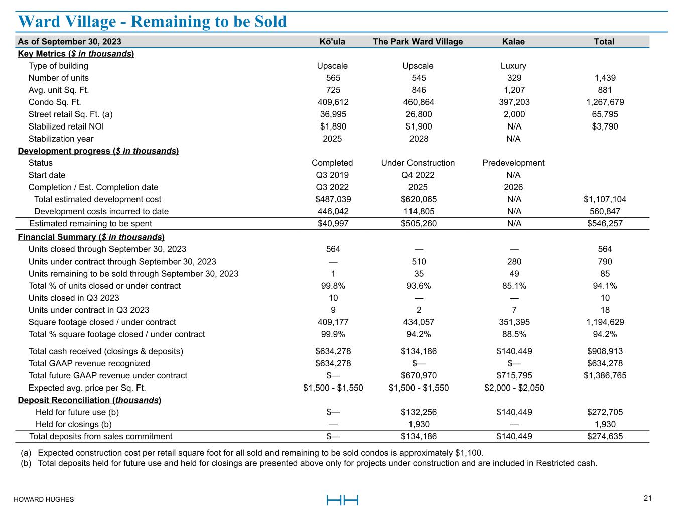 –コンドミニアムの販売収入は、以前は4,000万ドルから4,500万ドル、粗利率は10%から13%を見込んでいましたが、現在は4,700万ドルから4,800万ドル、粗利率は13%から14%を見込んでいます。2023年のコンドミニアムの販売収入と売上総利益率は、2023年9月30日時点でそれぞれ100%と99.8%が販売されたアアリイとコオウラの残戸の成約によるものです。Kō'ulaの最終ユニットは第4四半期に閉鎖された。今期はこれらの残戸の利益率が低下したものの、'A'ali'iとKō'ulaの全体的な粗利益率は25%と30%の範囲を維持している。次に完成予定の大型コンドミニアム・プロジェクトはヴィクトリア・プレイスで、2024年に引き渡される予定で、100%事前販売済みである。