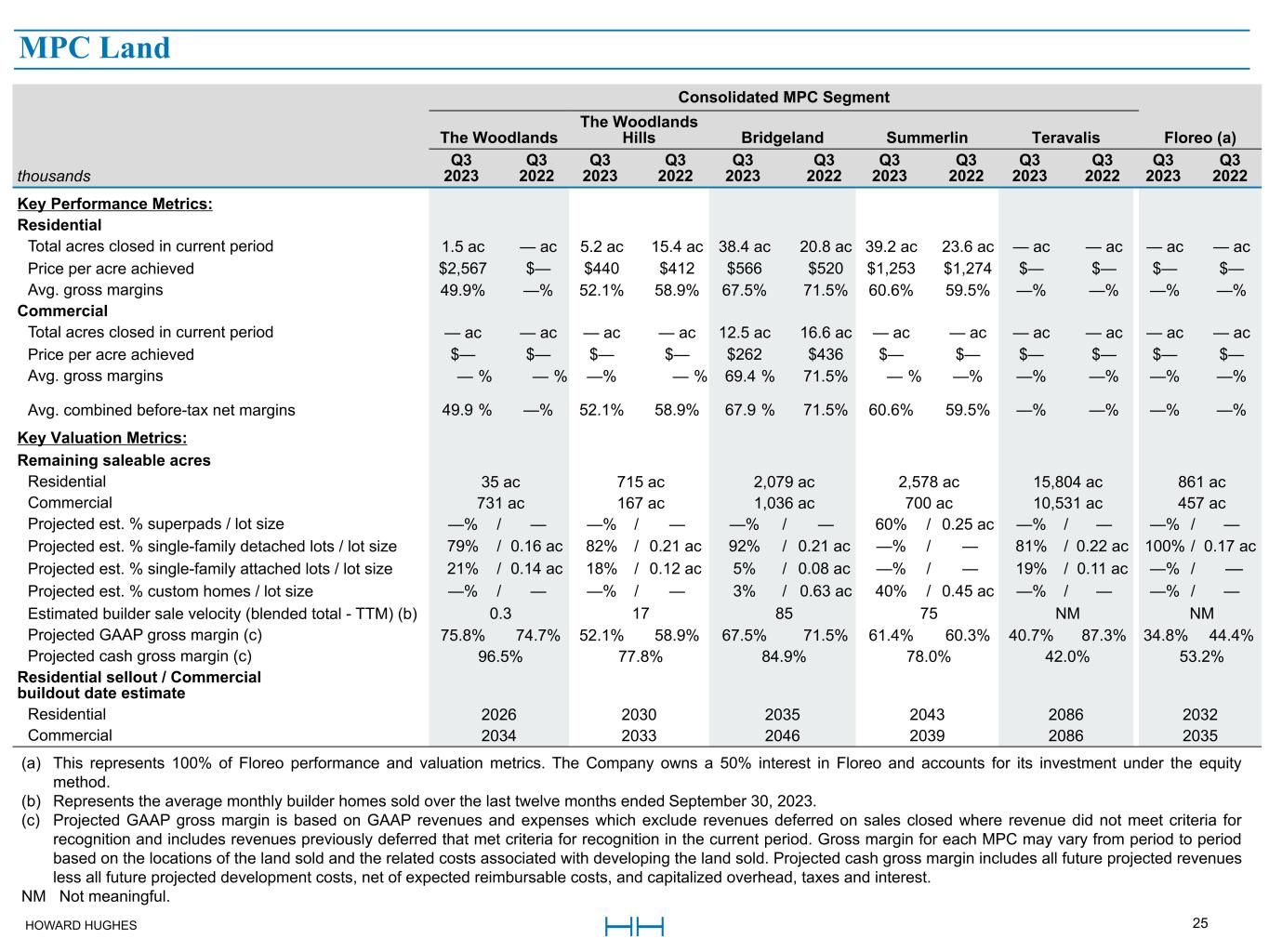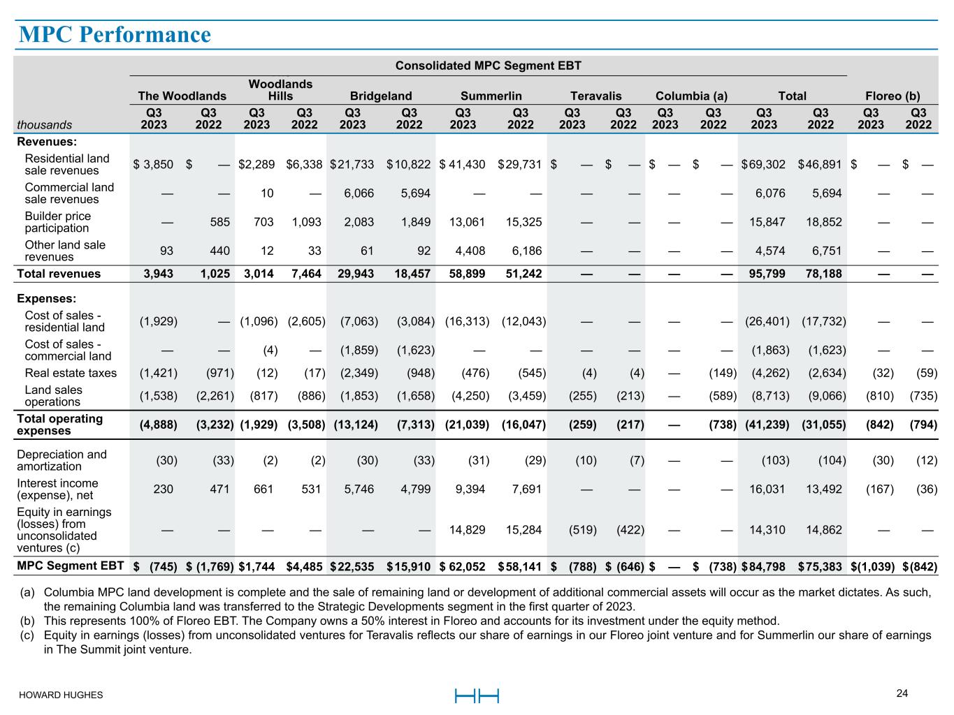 –MPCのEBTは、前四半期に前年同期比横ばいから10%減に修正されたが、ブリッヂランド、サマーリン、ザ・ウッドランズ・ヒルズ®における新築住宅の販売増加の恩恵を受け続けている。新築住宅や空き地の在庫が少ないため、住宅建設業者の新規用地への関心は引き続き高まっており、当社は第4四半期中に土地の重要な売却を見込んでいます。その結果、2023年のMPC EBTは前年比10%から20%増加し、中位値は約3億2,500万ドルになると予想される。これは、2023年初めに発表された当初の通期ガイダンスと比較して、中間点で1億2,500万ドルの改善となる。