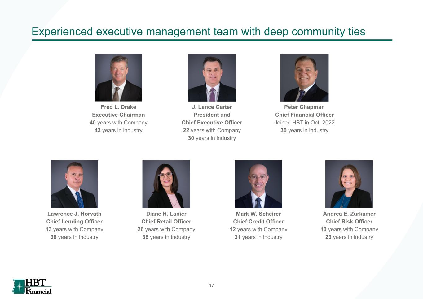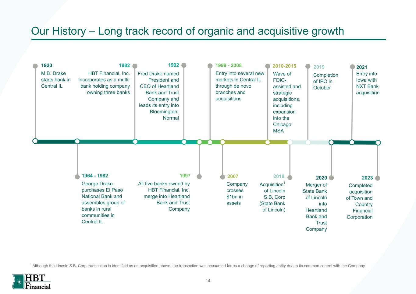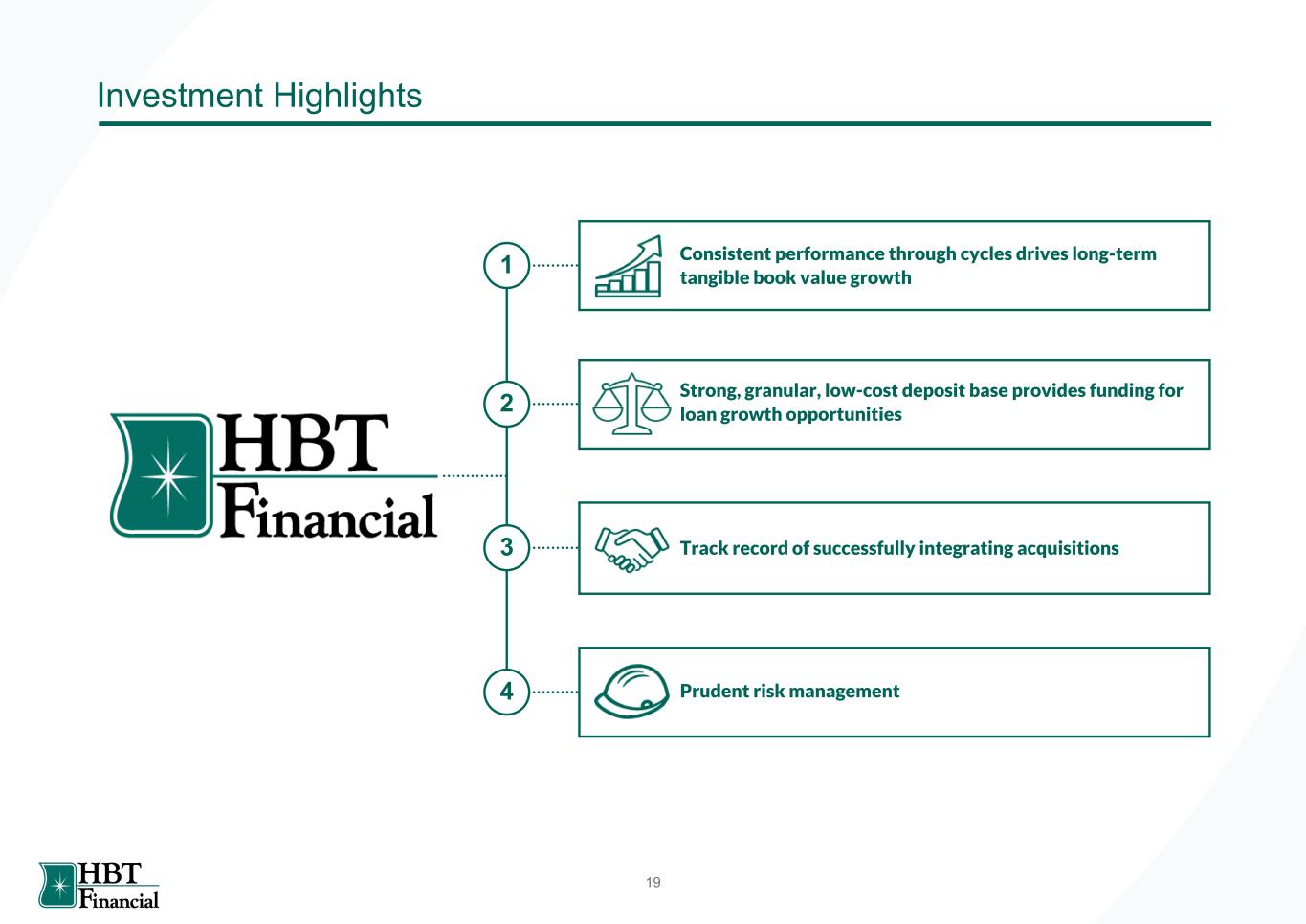 イリノイ州ブルーミントンに本社を置くHBT Financial, Inc.は、ハートランド・バンク・アンド・トラスト・カンパニーの持株会社で、銀行業のルーツは1920年まで遡ることができる。HBTはイリノイ州およびアイオワ州東部全域の個人、企業、自治体に対し、ビジネス、商業、ウェルス・マネジメント、リテール・バンキングの包括的な商品・サービスを67のフルサービス支店を通じて提供している。2023年12月31日現在、総資産51億ドル、貸出総額34億ドル、預金総額44億ドル。