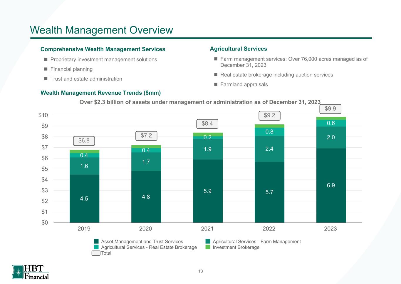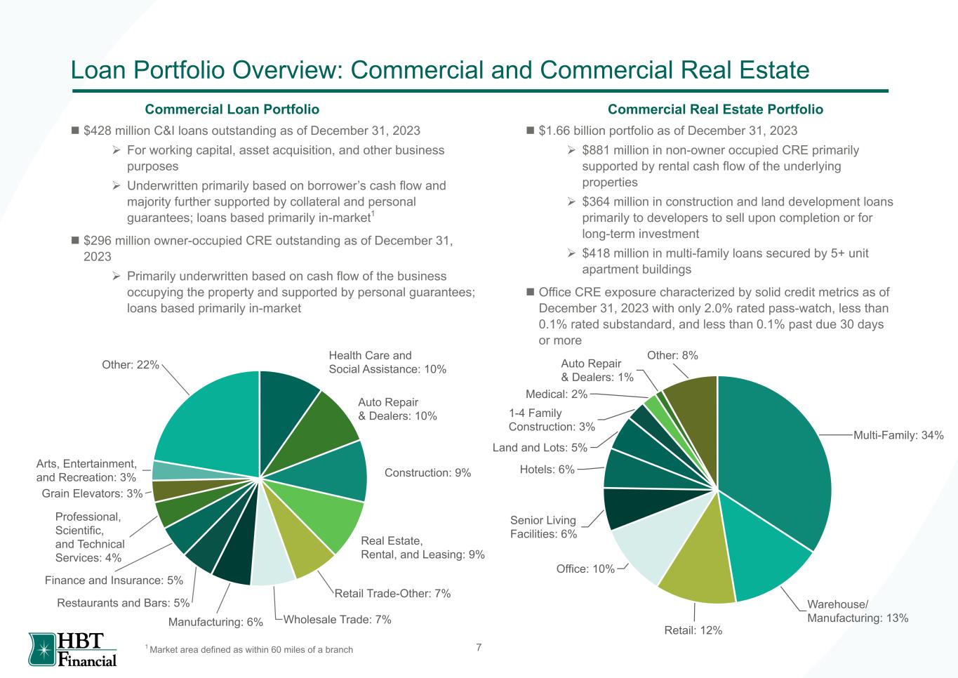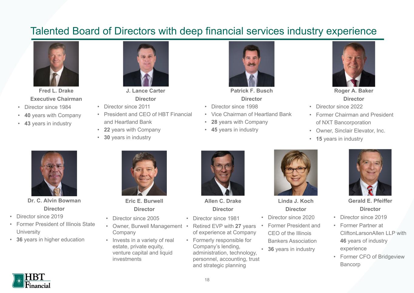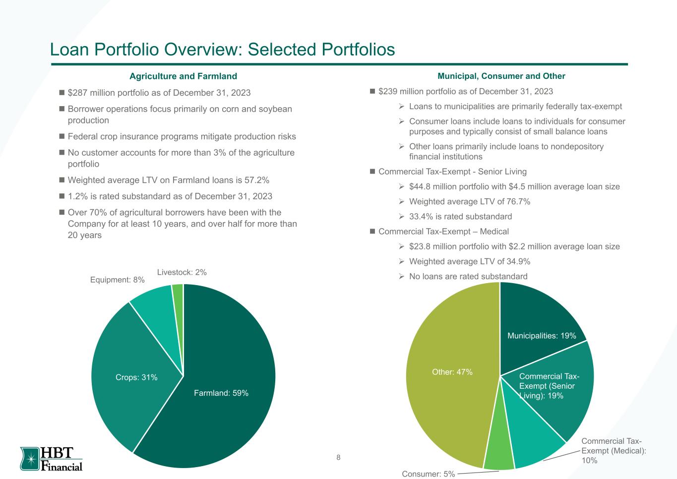 イリノイ州ブルーミントンに本社を置くHBT Financial, Inc.は、ハートランド・バンク・アンド・トラスト・カンパニーの持株会社で、銀行業のルーツは1920年まで遡ることができる。HBTはイリノイ州およびアイオワ州東部全域の個人、企業、自治体に対し、ビジネス、商業、ウェルス・マネジメント、リテール・バンキングの包括的な商品・サービスを67のフルサービス支店を通じて提供している。2023年12月31日現在、総資産51億ドル、貸出総額34億ドル、預金総額44億ドル。