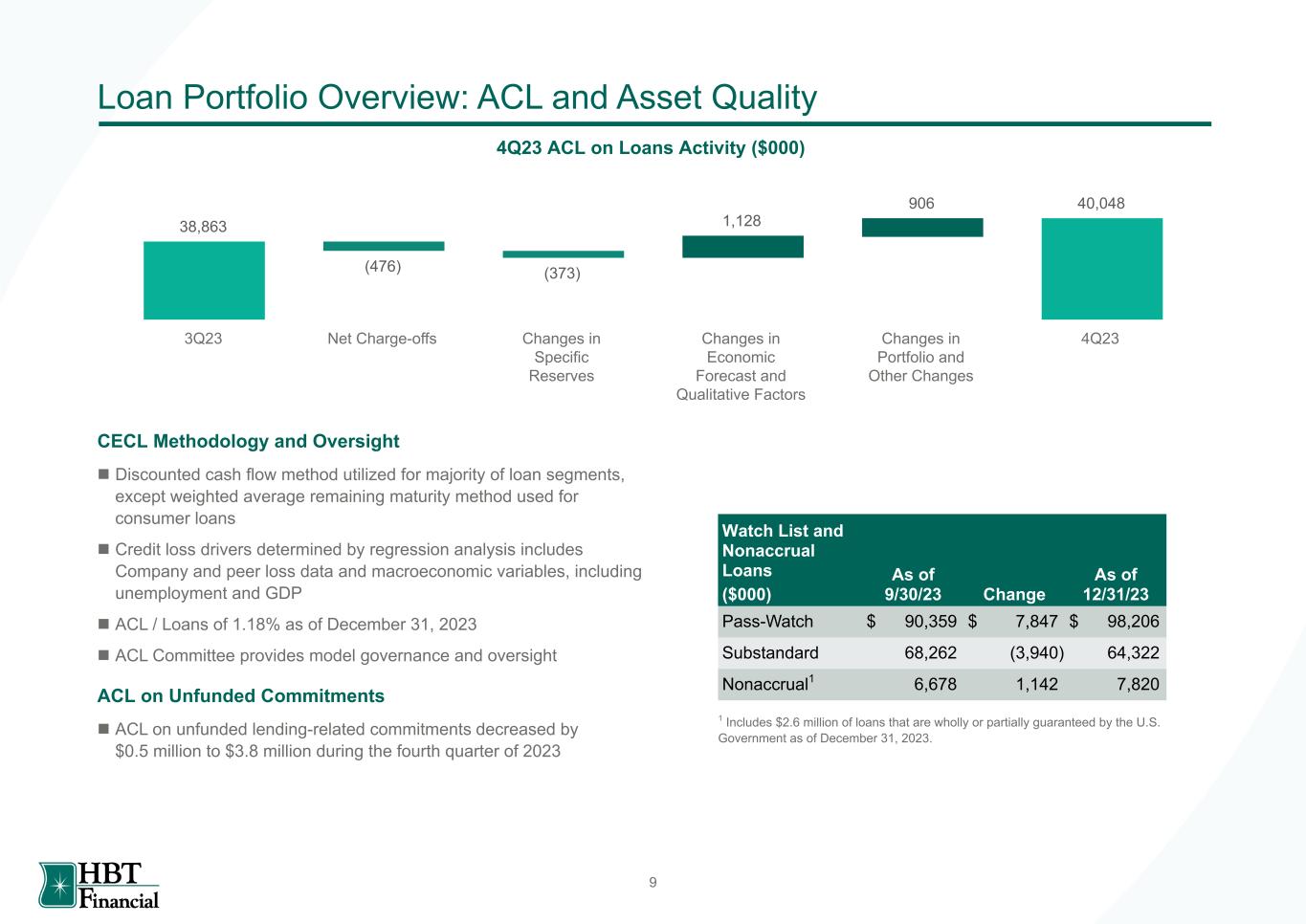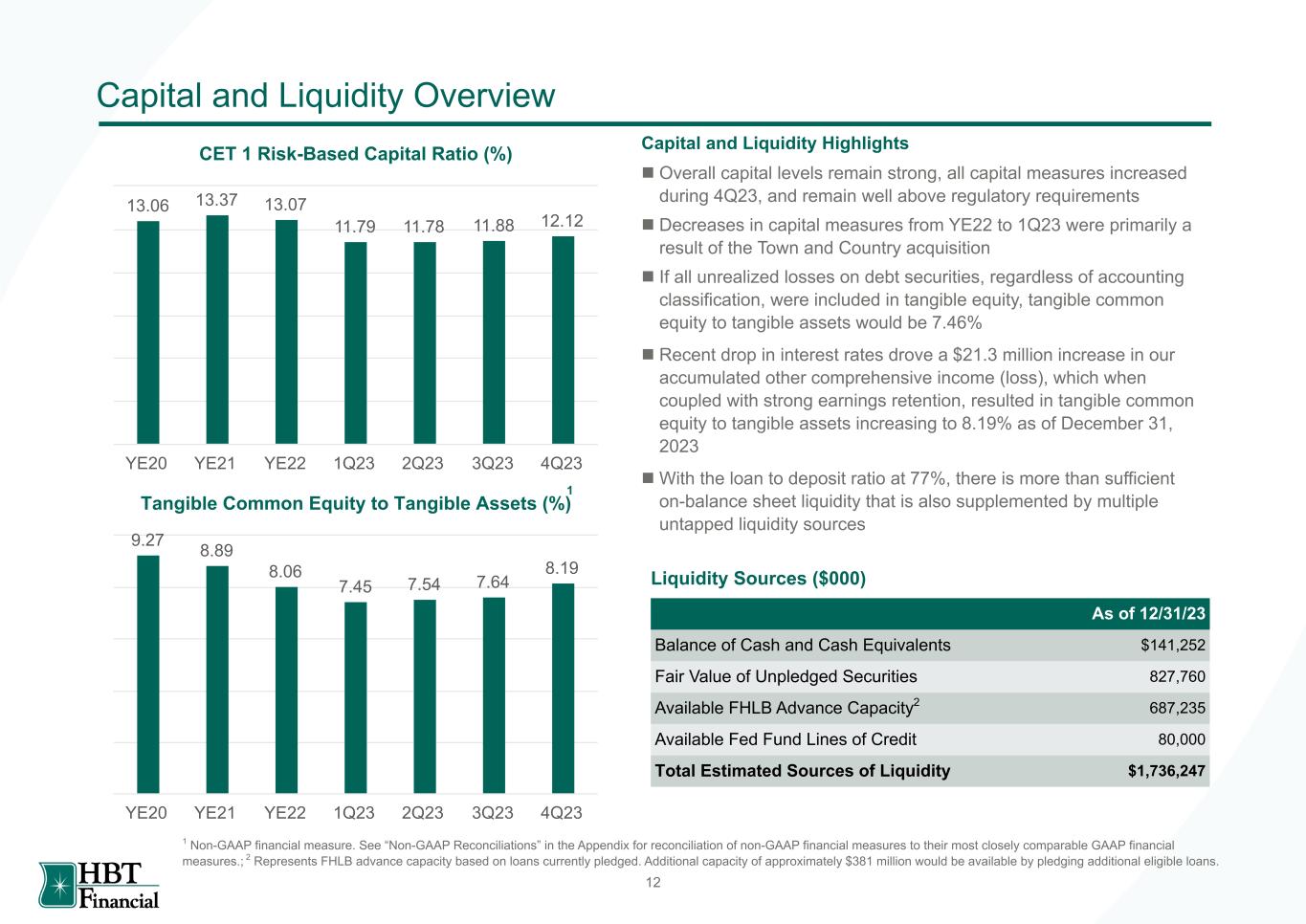 J.HBTファイナンシャルの社長兼最高経営責任者(CEO)であるランス・カーターは次のように述べた。調整後ROAA(1) は1.53%、調整後ROATCE(1) は19.81%、調整後希薄化後1株当たり利益(1) は0.60ドルと、引き続き高い収益性を達成しました。当四半期は、流動性を改善し、ウェルス・マネジメントの顧客の預金の大半をバランスシートに取り込むことで、仲介預金を除く預金を 4.2%増加させることができました。ウェルス・マネジメント顧客からの預金を除いた預金総額は、2,940 万ドル(0.7%)増加しました。当四半期の貸出残高は1.8%増と堅調な伸びを維持し、不良資産は総資産の0.17%にとどまるなど、信用力の高さも維持しました。当四半期の純金利マージン(税引前ベース)(1) は 3.99%に低下しましたが、2024 年第 1 四半期には純金利マージンの低下ペースは緩やかになると考えています。最近の金利低下により、その他の包括利益(損失)累計額は 2,130 万ドル増加し、好調な収益維持と相まって、1 株当たり有形簿価(1) は 9.3%増加しました。すべての資本指標は増加し、継続的な有機的成長または将来の買収を支えることができます。今期も引き続き、強力な収益性を生み出し、堅固なバランスシートを維持し、フランチャイズ価値を高める能力を実証できたと確信しています。