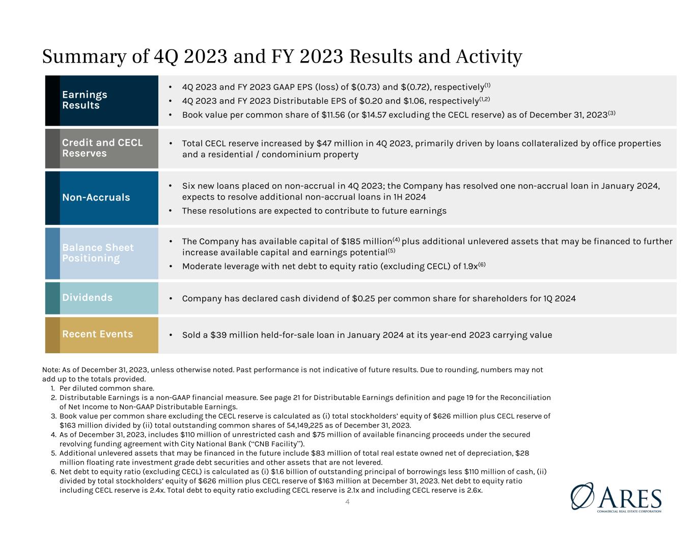 3 Company Highlights Note: As of December 31, 2023, unless otherwise noted. Past performance is not indicative of future results. Due to rounding, numbers presented may not add up to the totals provided. 1. Percentage of loans held for investment is based on outstanding principal balance. 2. Distributable Earnings is a non-GAAP financial measure. See page 21 for Distributable Earnings definition and page 19 for the Reconciliation of Net Income to Non-GAAP Distributable Earnings. 3. Net debt to equity ratio is calculated as (i) $1.6 billion of outstanding principal of borrowings less $110 million of cash, (ii) divided by total stockholders’ equity of $626 million plus CECL reserve of $163 million at December 31, 2023. Net debt to equity ratio including CECL reserve is 2.4x. Total debt to equity ratio excluding CECL reserve is 2.1x and including CECL reserve is 2.6x. 4. As of December 31, 2023, includes $110 million of unrestricted cash and $75 million of available financing proceeds under the secured revolving funding agreement with City National Bank (“CNB Facility”). 5. Ares AUM includes funds managed by Ivy Hill Asset Management, L.P., a wholly owned portfolio company of Ares Capital Corporation and registered investment adviser. Loan Portfolio $2.2 billion outstanding principal balance 98% senior loans $163 million CECL reserve equates to approximately 8%(1) of loans held for investment and 87% of total CECL reserve relates to office loans and a residential / condo loan Balance Sheet Positioning 1.9x net debt to equity ratio (excluding CECL)(3) $185 million of available capital(4) No spread based mark to market provisions Earnings and Dividends $0.20 4Q Distributable Earnings(2) per diluted common share Declared 1Q 2024 regular cash dividend of $0.25 per common share Ares Sponsorship $418.8 billion ARES AUM(5) $49.7 billion ARES real estate platform AUM Benefits from market intelligence and deep relationships