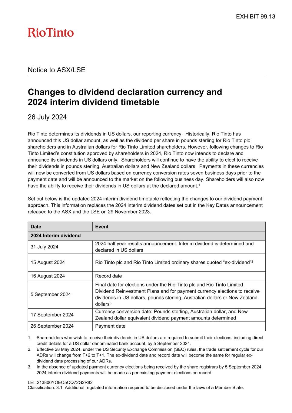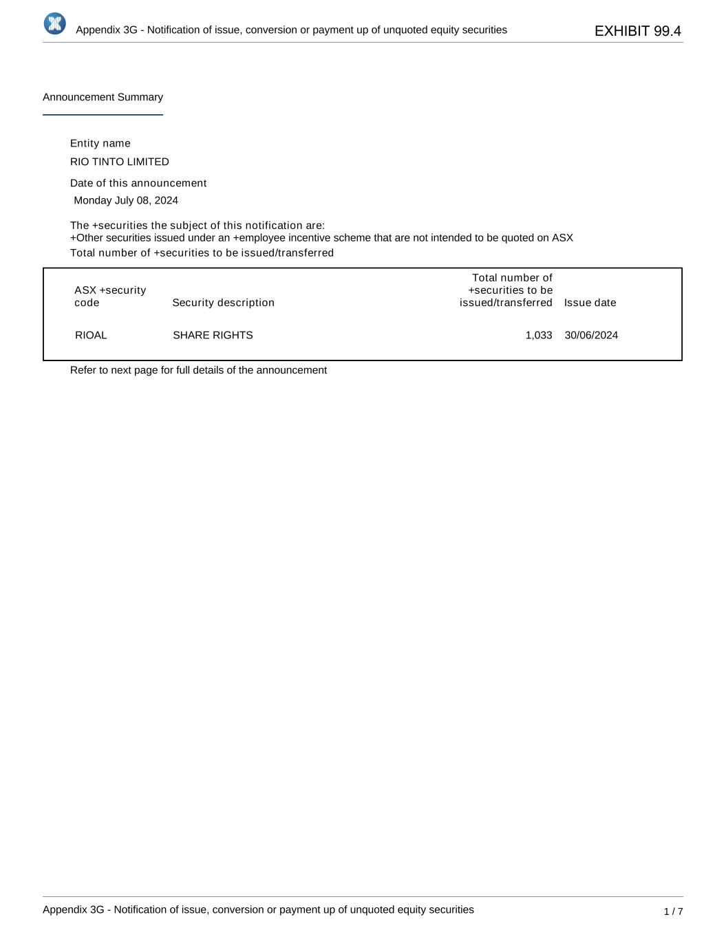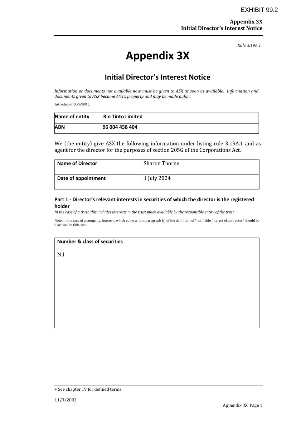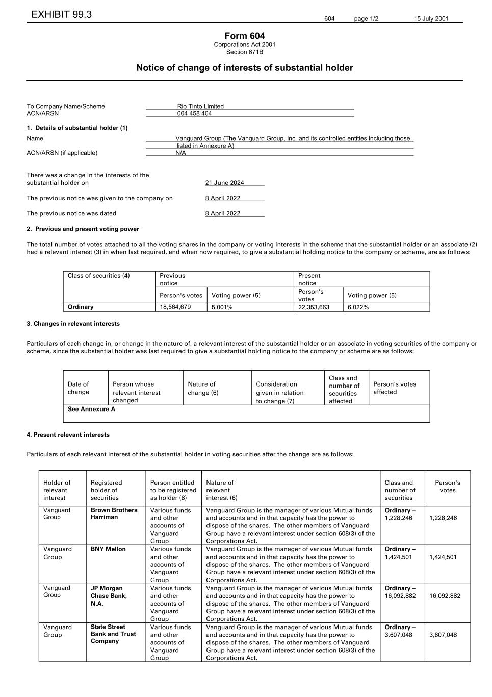 604 page 1/2 15 July 2001 Form 604 Corporations Act 2001 Section 671B Notice of change of interests of substantial holder To Company Name/Scheme Rio Tinto Limited ACN/ARSN 004 458 404 1. Details of substantial holder (1) Name Vanguard Group (The Vanguard Group, Inc. and its controlled entities including those listed in Annexure A) ACN/ARSN (if applicable) N/A There was a change in the interests of the substantial holder on 21 June 2024 The previous notice was given to the company on 8 April 2022 The previous notice was dated 8 April 2022 2. Previous and present voting power The total number of votes attached to all the voting shares in the company or voting interests in the scheme that the substantial holder or an associate (2) had a relevant interest (3) in when last required, and when now required, to give a substantial holding notice to the company or scheme, are as follows: Class of securities (4) Previous notice Present notice Person's votes Voting power (5) Person’s votes Voting power (5) Ordinary 18,564,679 5.001% 22,353,663 6.022% 3. Changes in relevant interests Particulars of each change in, or change in the nature of, a relevant interest of the substantial holder or an associate in voting securities of the company or scheme, since the substantial holder was last required to give a substantial holding notice to the company or scheme are as follows: Date of change Person whose relevant interest changed Nature of change (6) Consideration given in relation to change (7) Class and number of securities affected Person's votes affected See Annexure A 4. Present relevant interests Particulars of each relevant interest of the substantial holder in voting securities after the change are as follows: Holder of relevant interest Registered holder of securities Person entitled to be registered as holder (8) Nature of relevant interest (6) Class and number of securities Person's votes Vanguard Group Brown Brothers Harriman Various funds and other accounts of Vanguard Group Vanguard Group is the manager of various Mutual funds and accounts and in that capacity has the power to dispose of the shares. The other members of Vanguard Group have a relevant interest under section 608(3) of the Corporations Act. Ordinary – 1,228,246 1,228,246 Vanguard Group BNY Mellon Various funds and other accounts of Vanguard Group Vanguard Group is the manager of various Mutual funds and accounts and in that capacity has the power to dispose of the shares. The other members of Vanguard Group have a relevant interest under section 608(3) of the Corporations Act. Ordinary – 1,424,501 1,424,501 Vanguard Group JP Morgan Chase Bank, N.A. Various funds and other accounts of Vanguard Group Vanguard Group is the manager of various Mutual funds and accounts and in that capacity has the power to dispose of the shares. The other members of Vanguard Group have a relevant interest under section 608(3) of the Corporations Act. Ordinary – 16,092,882 16,092,882 Vanguard Group State Street Bank and Trust Company Various funds and other accounts of Vanguard Group Vanguard Group is the manager of various Mutual funds and accounts and in that capacity has the power to dispose of the shares. The other members of Vanguard Group have a relevant interest under section 608(3) of the Corporations Act. Ordinary – 3,607,048 3,607,048 EXHIBIT 99.3