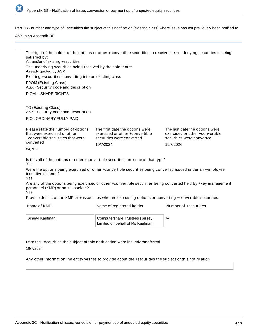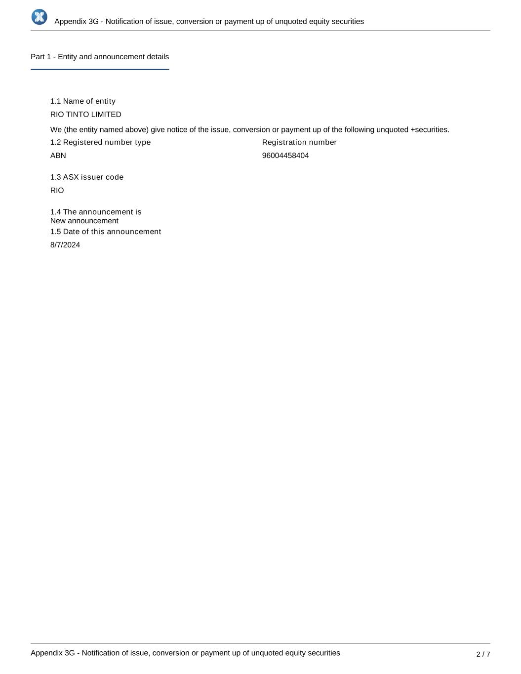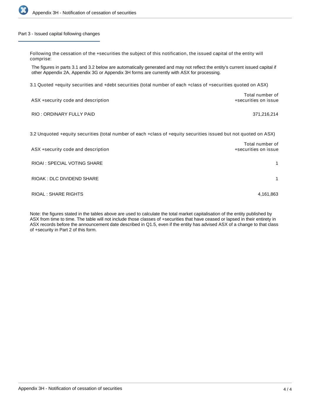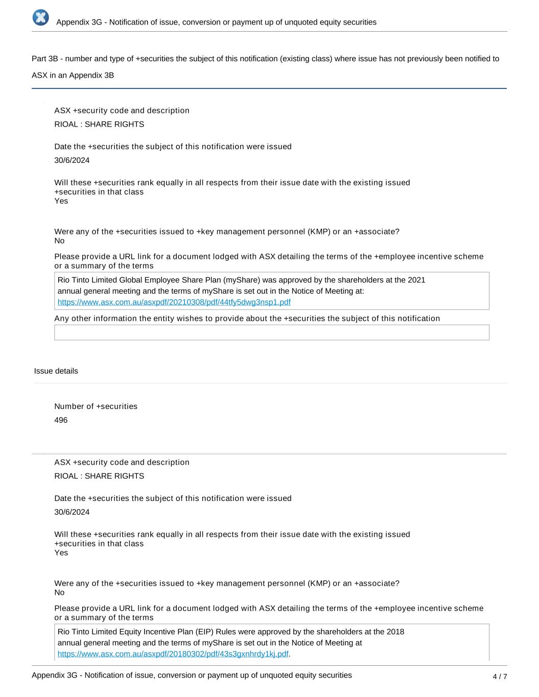 604 page 1/2 15 July 2001 Form 604 Corporations Act 2001 Section 671B Notice of change of interests of substantial holder To Company Name/Scheme Rio Tinto Limited ACN/ARSN 004 458 404 1. Details of substantial holder (1) Name Vanguard Group (The Vanguard Group, Inc. and its controlled entities including those listed in Annexure A) ACN/ARSN (if applicable) N/A There was a change in the interests of the substantial holder on 21 June 2024 The previous notice was given to the company on 8 April 2022 The previous notice was dated 8 April 2022 2. Previous and present voting power The total number of votes attached to all the voting shares in the company or voting interests in the scheme that the substantial holder or an associate (2) had a relevant interest (3) in when last required, and when now required, to give a substantial holding notice to the company or scheme, are as follows: Class of securities (4) Previous notice Present notice Person's votes Voting power (5) Person’s votes Voting power (5) Ordinary 18,564,679 5.001% 22,353,663 6.022% 3. Changes in relevant interests Particulars of each change in, or change in the nature of, a relevant interest of the substantial holder or an associate in voting securities of the company or scheme, since the substantial holder was last required to give a substantial holding notice to the company or scheme are as follows: Date of change Person whose relevant interest changed Nature of change (6) Consideration given in relation to change (7) Class and number of securities affected Person's votes affected See Annexure A 4. Present relevant interests Particulars of each relevant interest of the substantial holder in voting securities after the change are as follows: Holder of relevant interest Registered holder of securities Person entitled to be registered as holder (8) Nature of relevant interest (6) Class and number of securities Person's votes Vanguard Group Brown Brothers Harriman Various funds and other accounts of Vanguard Group Vanguard Group is the manager of various Mutual funds and accounts and in that capacity has the power to dispose of the shares. The other members of Vanguard Group have a relevant interest under section 608(3) of the Corporations Act. Ordinary – 1,228,246 1,228,246 Vanguard Group BNY Mellon Various funds and other accounts of Vanguard Group Vanguard Group is the manager of various Mutual funds and accounts and in that capacity has the power to dispose of the shares. The other members of Vanguard Group have a relevant interest under section 608(3) of the Corporations Act. Ordinary – 1,424,501 1,424,501 Vanguard Group JP Morgan Chase Bank, N.A. Various funds and other accounts of Vanguard Group Vanguard Group is the manager of various Mutual funds and accounts and in that capacity has the power to dispose of the shares. The other members of Vanguard Group have a relevant interest under section 608(3) of the Corporations Act. Ordinary – 16,092,882 16,092,882 Vanguard Group State Street Bank and Trust Company Various funds and other accounts of Vanguard Group Vanguard Group is the manager of various Mutual funds and accounts and in that capacity has the power to dispose of the shares. The other members of Vanguard Group have a relevant interest under section 608(3) of the Corporations Act. Ordinary – 3,607,048 3,607,048 EXHIBIT 99.3