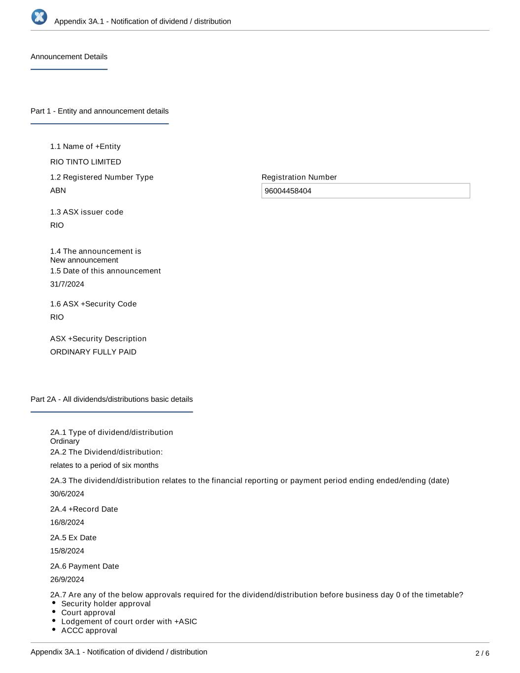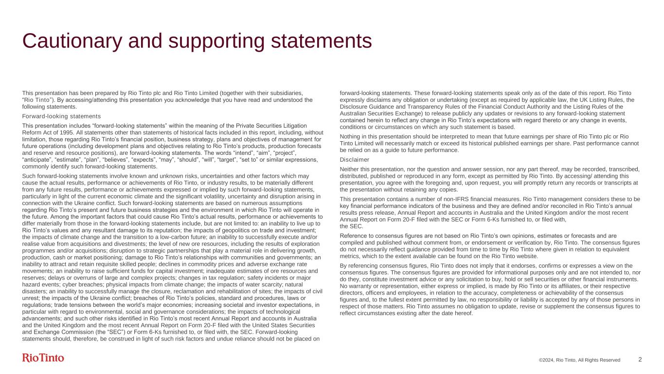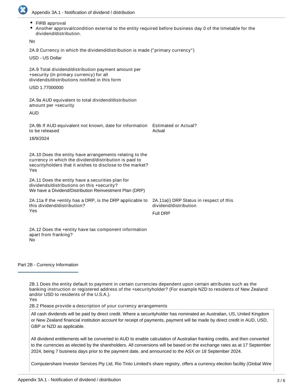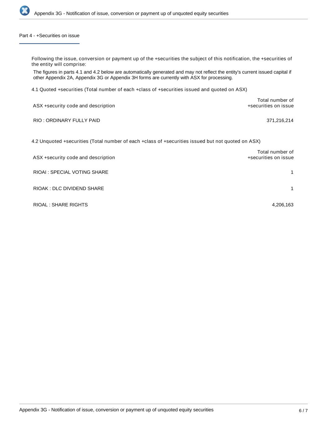 604 page 1/2 15 July 2001 Form 604 Corporations Act 2001 Section 671B Notice of change of interests of substantial holder To Company Name/Scheme Rio Tinto Limited ACN/ARSN 004 458 404 1. Details of substantial holder (1) Name Vanguard Group (The Vanguard Group, Inc. and its controlled entities including those listed in Annexure A) ACN/ARSN (if applicable) N/A There was a change in the interests of the substantial holder on 21 June 2024 The previous notice was given to the company on 8 April 2022 The previous notice was dated 8 April 2022 2. Previous and present voting power The total number of votes attached to all the voting shares in the company or voting interests in the scheme that the substantial holder or an associate (2) had a relevant interest (3) in when last required, and when now required, to give a substantial holding notice to the company or scheme, are as follows: Class of securities (4) Previous notice Present notice Person's votes Voting power (5) Person’s votes Voting power (5) Ordinary 18,564,679 5.001% 22,353,663 6.022% 3. Changes in relevant interests Particulars of each change in, or change in the nature of, a relevant interest of the substantial holder or an associate in voting securities of the company or scheme, since the substantial holder was last required to give a substantial holding notice to the company or scheme are as follows: Date of change Person whose relevant interest changed Nature of change (6) Consideration given in relation to change (7) Class and number of securities affected Person's votes affected See Annexure A 4. Present relevant interests Particulars of each relevant interest of the substantial holder in voting securities after the change are as follows: Holder of relevant interest Registered holder of securities Person entitled to be registered as holder (8) Nature of relevant interest (6) Class and number of securities Person's votes Vanguard Group Brown Brothers Harriman Various funds and other accounts of Vanguard Group Vanguard Group is the manager of various Mutual funds and accounts and in that capacity has the power to dispose of the shares. The other members of Vanguard Group have a relevant interest under section 608(3) of the Corporations Act. Ordinary – 1,228,246 1,228,246 Vanguard Group BNY Mellon Various funds and other accounts of Vanguard Group Vanguard Group is the manager of various Mutual funds and accounts and in that capacity has the power to dispose of the shares. The other members of Vanguard Group have a relevant interest under section 608(3) of the Corporations Act. Ordinary – 1,424,501 1,424,501 Vanguard Group JP Morgan Chase Bank, N.A. Various funds and other accounts of Vanguard Group Vanguard Group is the manager of various Mutual funds and accounts and in that capacity has the power to dispose of the shares. The other members of Vanguard Group have a relevant interest under section 608(3) of the Corporations Act. Ordinary – 16,092,882 16,092,882 Vanguard Group State Street Bank and Trust Company Various funds and other accounts of Vanguard Group Vanguard Group is the manager of various Mutual funds and accounts and in that capacity has the power to dispose of the shares. The other members of Vanguard Group have a relevant interest under section 608(3) of the Corporations Act. Ordinary – 3,607,048 3,607,048 EXHIBIT 99.3
