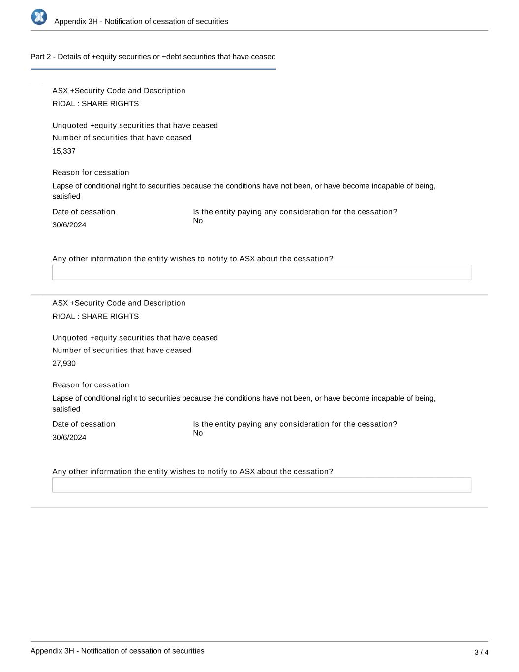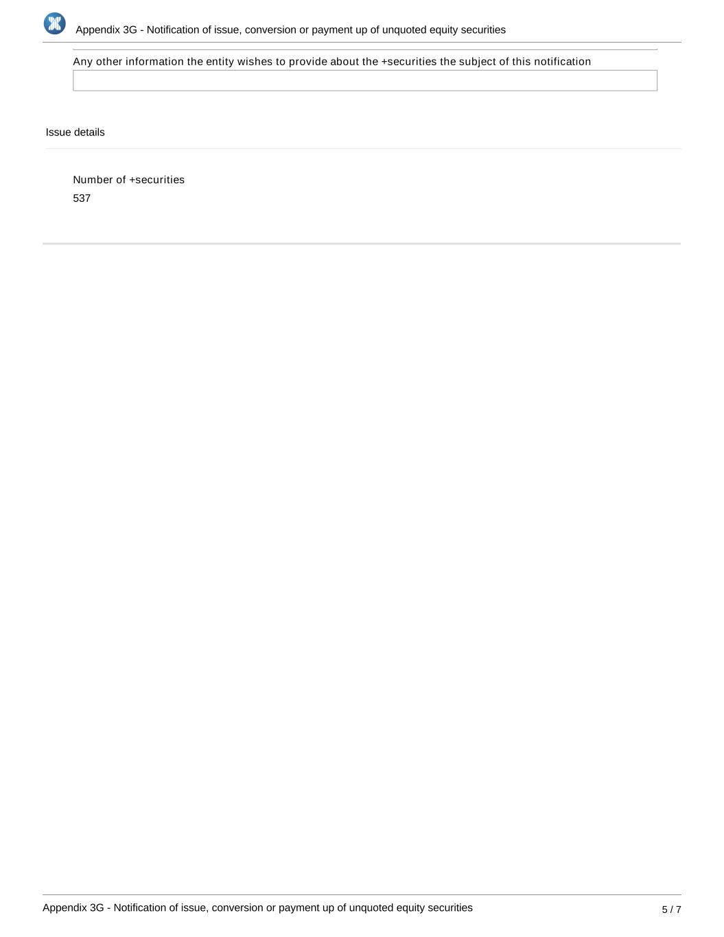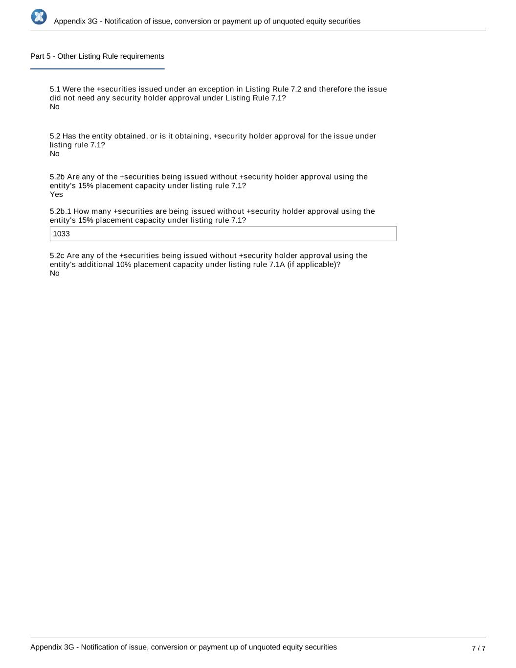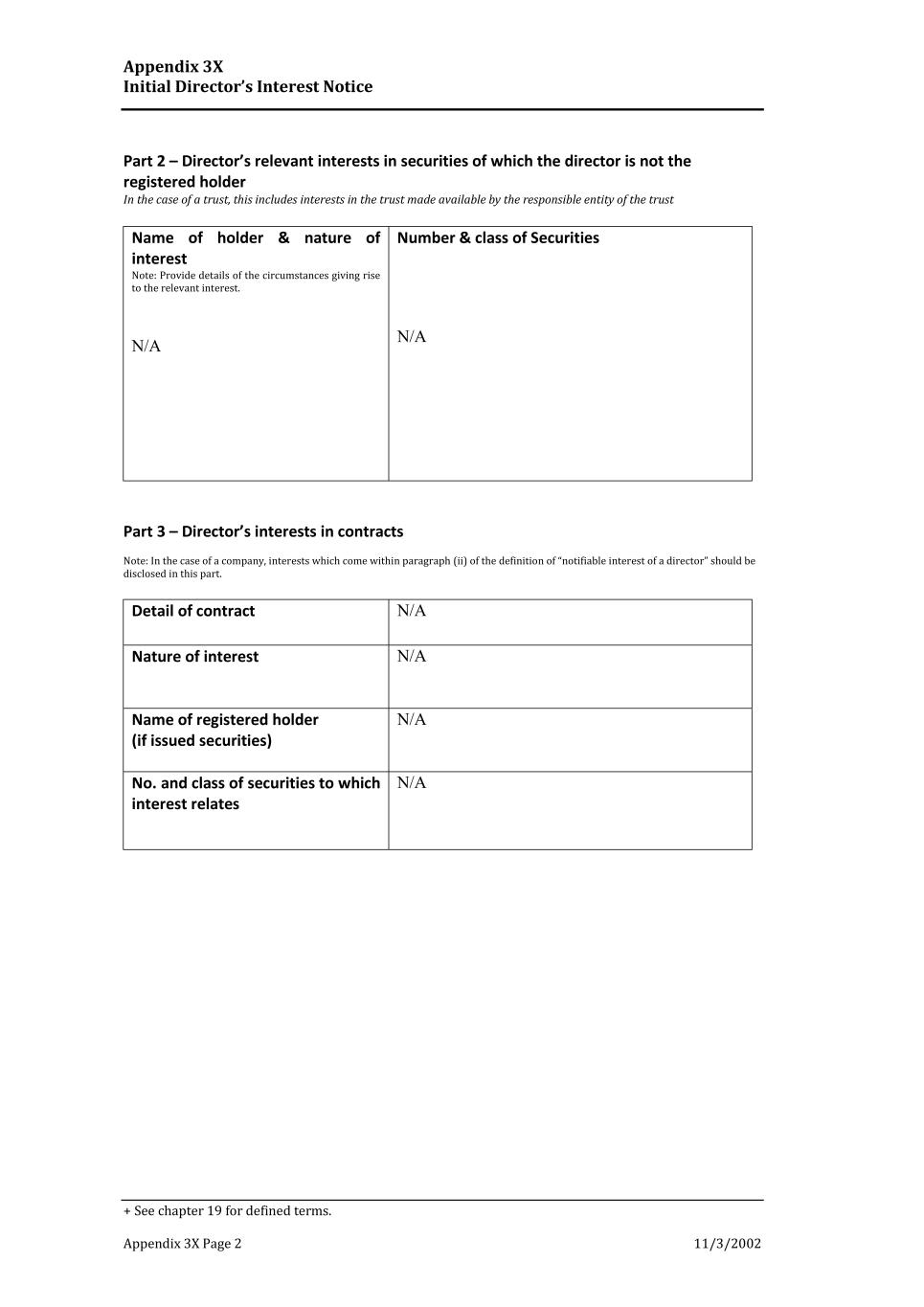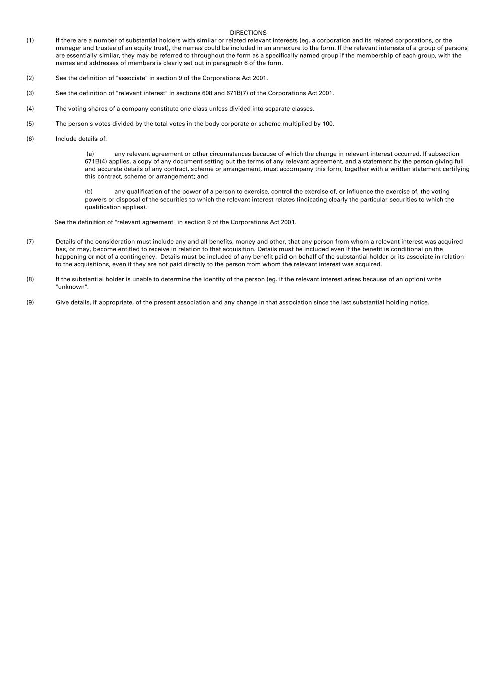 DIRECTIONS (1) If there are a number of substantial holders with similar or related relevant interests (eg. a corporation and its related corporations, or the manager and trustee of an equity trust), the names could be included in an annexure to the form. If the relevant interests of a group of persons are essentially similar, they may be referred to throughout the form as a specifically named group if the membership of each group, with the names and addresses of members is clearly set out in paragraph 6 of the form. (2) See the definition of "associate" in section 9 of the Corporations Act 2001. (3) See the definition of "relevant interest" in sections 608 and 671B(7) of the Corporations Act 2001. (4) The voting shares of a company constitute one class unless divided into separate classes. (5) The person's votes divided by the total votes in the body corporate or scheme multiplied by 100. (6) Include details of: (a) any relevant agreement or other circumstances because of which the change in relevant interest occurred. If subsection 671B(4) applies, a copy of any document setting out the terms of any relevant agreement, and a statement by the person giving full and accurate details of any contract, scheme or arrangement, must accompany this form, together with a written statement certifying this contract, scheme or arrangement; and (b) any qualification of the power of a person to exercise, control the exercise of, or influence the exercise of, the voting powers or disposal of the securities to which the relevant interest relates (indicating clearly the particular securities to which the qualification applies). See the definition of "relevant agreement" in section 9 of the Corporations Act 2001. (7) Details of the consideration must include any and all benefits, money and other, that any person from whom a relevant interest was acquired has, or may, become entitled to receive in relation to that acquisition. Details must be included even if the benefit is conditional on the happening or not of a contingency. Details must be included of any benefit paid on behalf of the substantial holder or its associate in relation to the acquisitions, even if they are not paid directly to the person from whom the relevant interest was acquired. (8) If the substantial holder is unable to determine the identity of the person (eg. if the relevant interest arises because of an option) write "unknown". (9) Give details, if appropriate, of the present association and any change in that association since the last substantial holding notice.