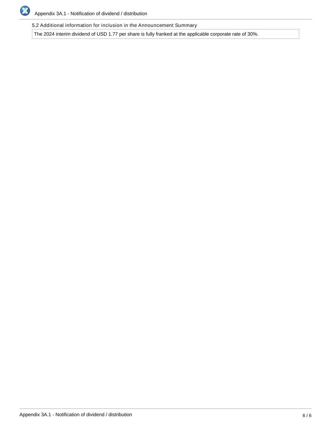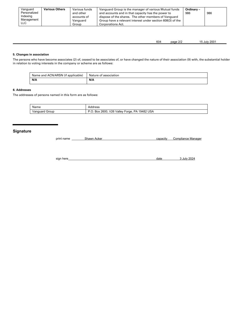 Vanguard Personalized Indexing Management LLC Various Others Various funds and other accounts of Vanguard Group Vanguard Group is the manager of various Mutual funds and accounts and in that capacity has the power to dispose of the shares. The other members of Vanguard Group have a relevant interest under section 608(3) of the Corporations Act. Ordinary – 986 986 604 page 2/2 15 July 2001 5. Changes in association The persons who have become associates (2) of, ceased to be associates of, or have changed the nature of their association (9) with, the substantial holder in relation to voting interests in the company or scheme are as follows: Name and ACN/ARSN (if applicable) Nature of association N/A N/A 6. Addresses The addresses of persons named in this form are as follows: Name Address Vanguard Group P.O. Box 2600, V26 Valley Forge, PA 19482 USA Signature print name Shawn Acker capacity Compliance Manager sign here date 3 July 2024