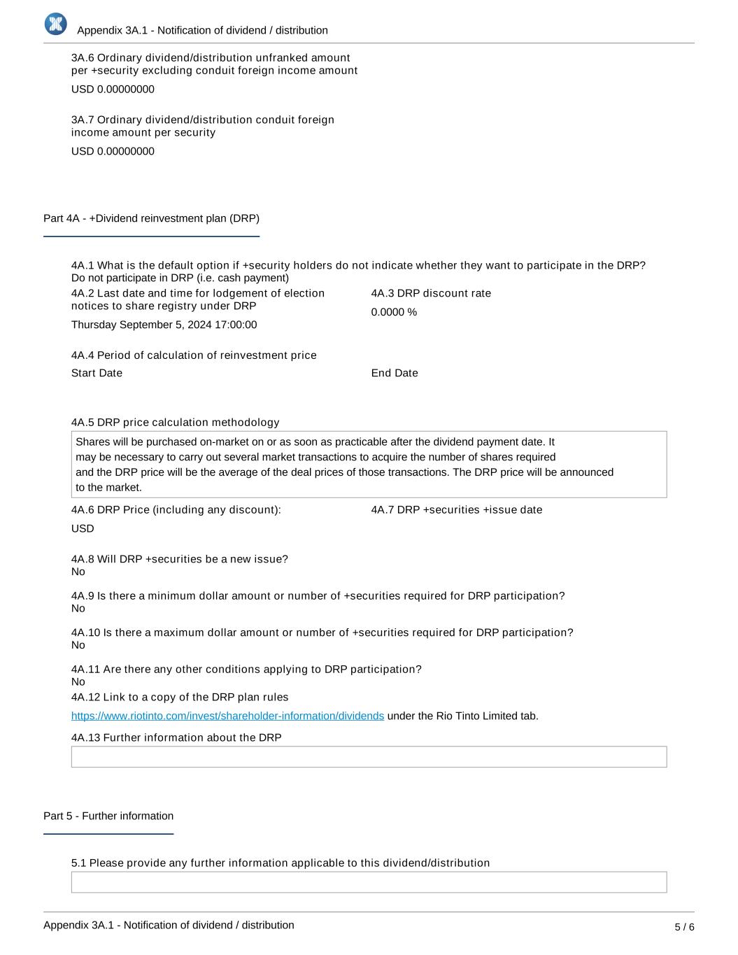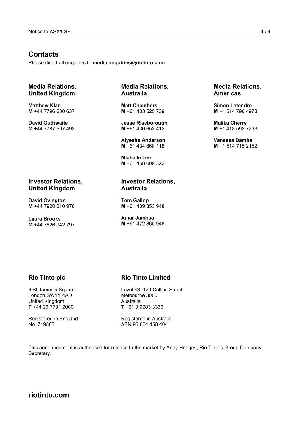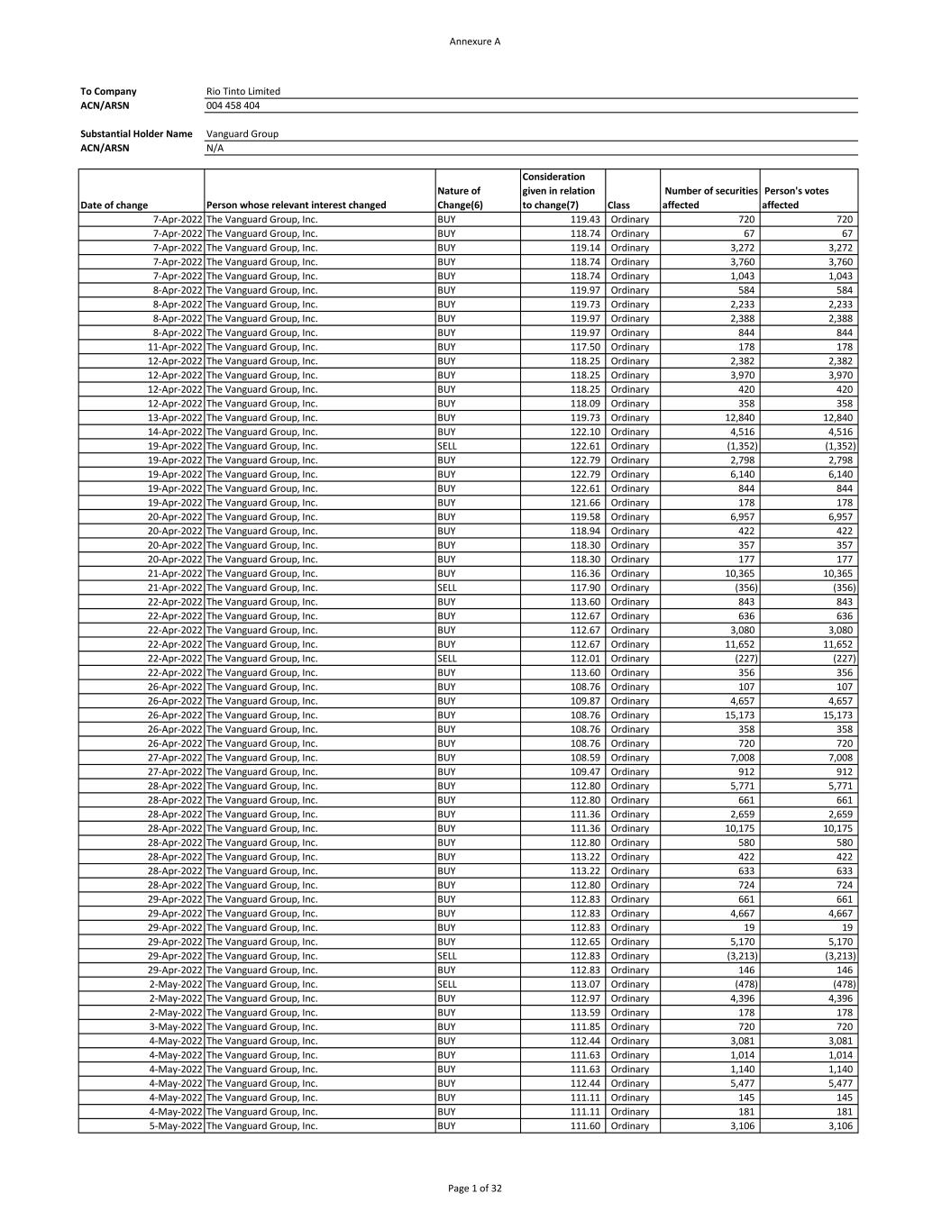 Annexure A To Company Rio Tinto Limited ACN/ARSN 004 458 404 Substantial Holder Name Vanguard Group ACN/ARSN N/A Date of change Person whose relevant interest changed Nature of Change(6) Consideration given in relation to change(7) Class Number of securities affected Person's votes affected 7-Apr-2022 The Vanguard Group, Inc. BUY 119.43 Ordinary 720 720 7-Apr-2022 The Vanguard Group, Inc. BUY 118.74 Ordinary 67 67 7-Apr-2022 The Vanguard Group, Inc. BUY 119.14 Ordinary 3,272 3,272 7-Apr-2022 The Vanguard Group, Inc. BUY 118.74 Ordinary 3,760 3,760 7-Apr-2022 The Vanguard Group, Inc. BUY 118.74 Ordinary 1,043 1,043 8-Apr-2022 The Vanguard Group, Inc. BUY 119.97 Ordinary 584 584 8-Apr-2022 The Vanguard Group, Inc. BUY 119.73 Ordinary 2,233 2,233 8-Apr-2022 The Vanguard Group, Inc. BUY 119.97 Ordinary 2,388 2,388 8-Apr-2022 The Vanguard Group, Inc. BUY 119.97 Ordinary 844 844 11-Apr-2022 The Vanguard Group, Inc. BUY 117.50 Ordinary 178 178 12-Apr-2022 The Vanguard Group, Inc. BUY 118.25 Ordinary 2,382 2,382 12-Apr-2022 The Vanguard Group, Inc. BUY 118.25 Ordinary 3,970 3,970 12-Apr-2022 The Vanguard Group, Inc. BUY 118.25 Ordinary 420 420 12-Apr-2022 The Vanguard Group, Inc. BUY 118.09 Ordinary 358 358 13-Apr-2022 The Vanguard Group, Inc. BUY 119.73 Ordinary 12,840 12,840 14-Apr-2022 The Vanguard Group, Inc. BUY 122.10 Ordinary 4,516 4,516 19-Apr-2022 The Vanguard Group, Inc. SELL 122.61 Ordinary (1,352) (1,352) 19-Apr-2022 The Vanguard Group, Inc. BUY 122.79 Ordinary 2,798 2,798 19-Apr-2022 The Vanguard Group, Inc. BUY 122.79 Ordinary 6,140 6,140 19-Apr-2022 The Vanguard Group, Inc. BUY 122.61 Ordinary 844 844 19-Apr-2022 The Vanguard Group, Inc. BUY 121.66 Ordinary 178 178 20-Apr-2022 The Vanguard Group, Inc. BUY 119.58 Ordinary 6,957 6,957 20-Apr-2022 The Vanguard Group, Inc. BUY 118.94 Ordinary 422 422 20-Apr-2022 The Vanguard Group, Inc. BUY 118.30 Ordinary 357 357 20-Apr-2022 The Vanguard Group, Inc. BUY 118.30 Ordinary 177 177 21-Apr-2022 The Vanguard Group, Inc. BUY 116.36 Ordinary 10,365 10,365 21-Apr-2022 The Vanguard Group, Inc. SELL 117.90 Ordinary (356) (356) 22-Apr-2022 The Vanguard Group, Inc. BUY 113.60 Ordinary 843 843 22-Apr-2022 The Vanguard Group, Inc. BUY 112.67 Ordinary 636 636 22-Apr-2022 The Vanguard Group, Inc. BUY 112.67 Ordinary 3,080 3,080 22-Apr-2022 The Vanguard Group, Inc. BUY 112.67 Ordinary 11,652 11,652 22-Apr-2022 The Vanguard Group, Inc. SELL 112.01 Ordinary (227) (227) 22-Apr-2022 The Vanguard Group, Inc. BUY 113.60 Ordinary 356 356 26-Apr-2022 The Vanguard Group, Inc. BUY 108.76 Ordinary 107 107 26-Apr-2022 The Vanguard Group, Inc. BUY 109.87 Ordinary 4,657 4,657 26-Apr-2022 The Vanguard Group, Inc. BUY 108.76 Ordinary 15,173 15,173 26-Apr-2022 The Vanguard Group, Inc. BUY 108.76 Ordinary 358 358 26-Apr-2022 The Vanguard Group, Inc. BUY 108.76 Ordinary 720 720 27-Apr-2022 The Vanguard Group, Inc. BUY 108.59 Ordinary 7,008 7,008 27-Apr-2022 The Vanguard Group, Inc. BUY 109.47 Ordinary 912 912 28-Apr-2022 The Vanguard Group, Inc. BUY 112.80 Ordinary 5,771 5,771 28-Apr-2022 The Vanguard Group, Inc. BUY 112.80 Ordinary 661 661 28-Apr-2022 The Vanguard Group, Inc. BUY 111.36 Ordinary 2,659 2,659 28-Apr-2022 The Vanguard Group, Inc. BUY 111.36 Ordinary 10,175 10,175 28-Apr-2022 The Vanguard Group, Inc. BUY 112.80 Ordinary 580 580 28-Apr-2022 The Vanguard Group, Inc. BUY 113.22 Ordinary 422 422 28-Apr-2022 The Vanguard Group, Inc. BUY 113.22 Ordinary 633 633 28-Apr-2022 The Vanguard Group, Inc. BUY 112.80 Ordinary 724 724 29-Apr-2022 The Vanguard Group, Inc. BUY 112.83 Ordinary 661 661 29-Apr-2022 The Vanguard Group, Inc. BUY 112.83 Ordinary 4,667 4,667 29-Apr-2022 The Vanguard Group, Inc. BUY 112.83 Ordinary 19 19 29-Apr-2022 The Vanguard Group, Inc. BUY 112.65 Ordinary 5,170 5,170 29-Apr-2022 The Vanguard Group, Inc. SELL 112.83 Ordinary (3,213) (3,213) 29-Apr-2022 The Vanguard Group, Inc. BUY 112.83 Ordinary 146 146 2-May-2022 The Vanguard Group, Inc. SELL 113.07 Ordinary (478) (478) 2-May-2022 The Vanguard Group, Inc. BUY 112.97 Ordinary 4,396 4,396 2-May-2022 The Vanguard Group, Inc. BUY 113.59 Ordinary 178 178 3-May-2022 The Vanguard Group, Inc. BUY 111.85 Ordinary 720 720 4-May-2022 The Vanguard Group, Inc. BUY 112.44 Ordinary 3,081 3,081 4-May-2022 The Vanguard Group, Inc. BUY 111.63 Ordinary 1,014 1,014 4-May-2022 The Vanguard Group, Inc. BUY 111.63 Ordinary 1,140 1,140 4-May-2022 The Vanguard Group, Inc. BUY 112.44 Ordinary 5,477 5,477 4-May-2022 The Vanguard Group, Inc. BUY 111.11 Ordinary 145 145 4-May-2022 The Vanguard Group, Inc. BUY 111.11 Ordinary 181 181 5-May-2022 The Vanguard Group, Inc. BUY 111.60 Ordinary 3,106 3,106 Page 1 of 32