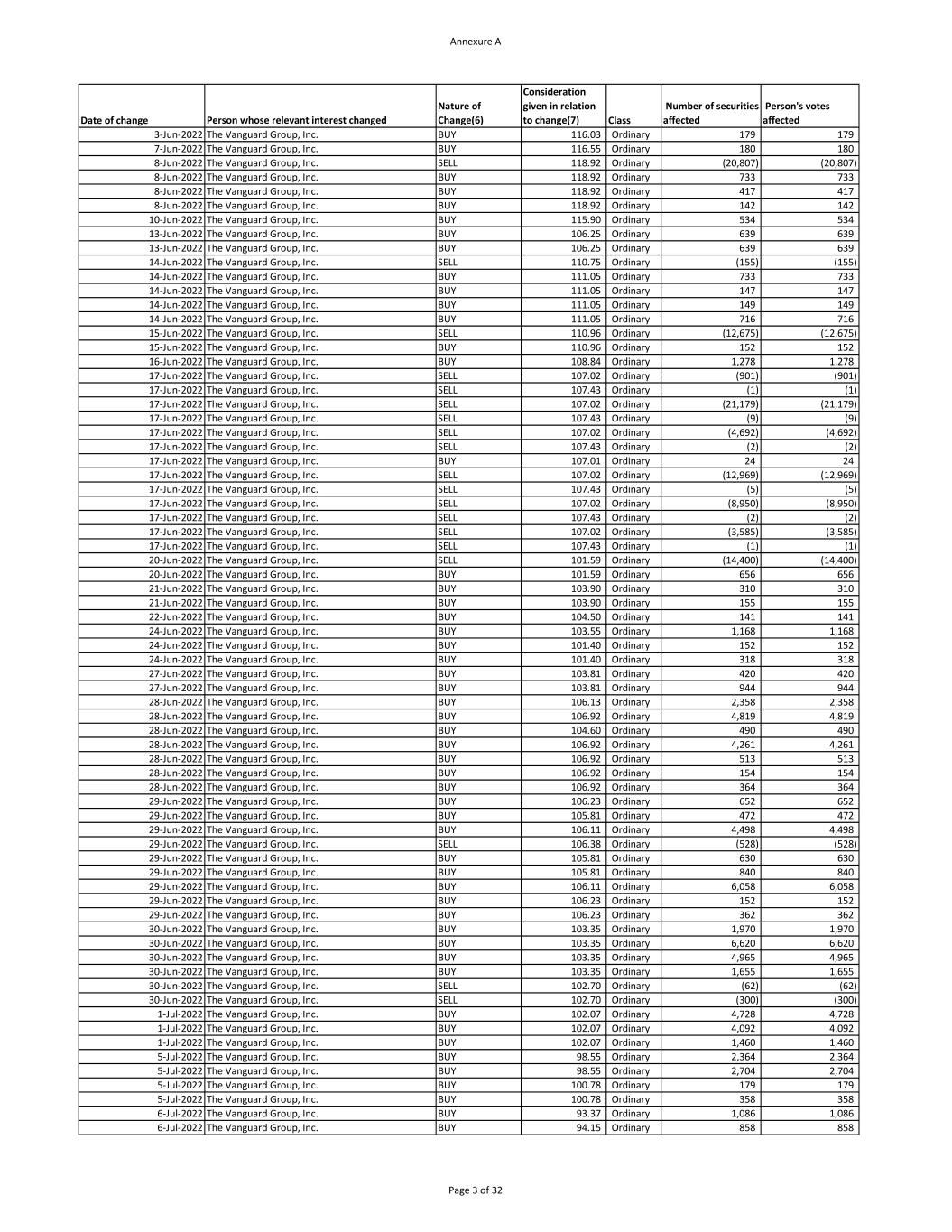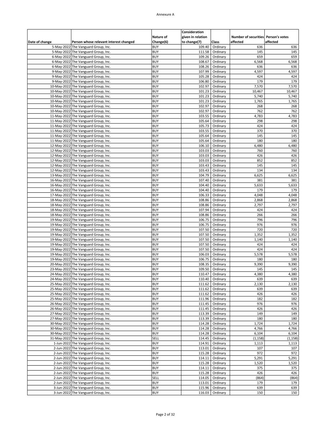 Annexure A Date of change Person whose relevant interest changed Nature of Change(6) Consideration given in relation to change(7) Class Number of securities affected Person's votes affected 3-Jun-2022 The Vanguard Group, Inc. BUY 116.03 Ordinary 179 179 7-Jun-2022 The Vanguard Group, Inc. BUY 116.55 Ordinary 180 180 8-Jun-2022 The Vanguard Group, Inc. SELL 118.92 Ordinary (20,807) (20,807) 8-Jun-2022 The Vanguard Group, Inc. BUY 118.92 Ordinary 733 733 8-Jun-2022 The Vanguard Group, Inc. BUY 118.92 Ordinary 417 417 8-Jun-2022 The Vanguard Group, Inc. BUY 118.92 Ordinary 142 142 10-Jun-2022 The Vanguard Group, Inc. BUY 115.90 Ordinary 534 534 13-Jun-2022 The Vanguard Group, Inc. BUY 106.25 Ordinary 639 639 13-Jun-2022 The Vanguard Group, Inc. BUY 106.25 Ordinary 639 639 14-Jun-2022 The Vanguard Group, Inc. SELL 110.75 Ordinary (155) (155) 14-Jun-2022 The Vanguard Group, Inc. BUY 111.05 Ordinary 733 733 14-Jun-2022 The Vanguard Group, Inc. BUY 111.05 Ordinary 147 147 14-Jun-2022 The Vanguard Group, Inc. BUY 111.05 Ordinary 149 149 14-Jun-2022 The Vanguard Group, Inc. BUY 111.05 Ordinary 716 716 15-Jun-2022 The Vanguard Group, Inc. SELL 110.96 Ordinary (12,675) (12,675) 15-Jun-2022 The Vanguard Group, Inc. BUY 110.96 Ordinary 152 152 16-Jun-2022 The Vanguard Group, Inc. BUY 108.84 Ordinary 1,278 1,278 17-Jun-2022 The Vanguard Group, Inc. SELL 107.02 Ordinary (901) (901) 17-Jun-2022 The Vanguard Group, Inc. SELL 107.43 Ordinary (1) (1) 17-Jun-2022 The Vanguard Group, Inc. SELL 107.02 Ordinary (21,179) (21,179) 17-Jun-2022 The Vanguard Group, Inc. SELL 107.43 Ordinary (9) (9) 17-Jun-2022 The Vanguard Group, Inc. SELL 107.02 Ordinary (4,692) (4,692) 17-Jun-2022 The Vanguard Group, Inc. SELL 107.43 Ordinary (2) (2) 17-Jun-2022 The Vanguard Group, Inc. BUY 107.01 Ordinary 24 24 17-Jun-2022 The Vanguard Group, Inc. SELL 107.02 Ordinary (12,969) (12,969) 17-Jun-2022 The Vanguard Group, Inc. SELL 107.43 Ordinary (5) (5) 17-Jun-2022 The Vanguard Group, Inc. SELL 107.02 Ordinary (8,950) (8,950) 17-Jun-2022 The Vanguard Group, Inc. SELL 107.43 Ordinary (2) (2) 17-Jun-2022 The Vanguard Group, Inc. SELL 107.02 Ordinary (3,585) (3,585) 17-Jun-2022 The Vanguard Group, Inc. SELL 107.43 Ordinary (1) (1) 20-Jun-2022 The Vanguard Group, Inc. SELL 101.59 Ordinary (14,400) (14,400) 20-Jun-2022 The Vanguard Group, Inc. BUY 101.59 Ordinary 656 656 21-Jun-2022 The Vanguard Group, Inc. BUY 103.90 Ordinary 310 310 21-Jun-2022 The Vanguard Group, Inc. BUY 103.90 Ordinary 155 155 22-Jun-2022 The Vanguard Group, Inc. BUY 104.50 Ordinary 141 141 24-Jun-2022 The Vanguard Group, Inc. BUY 103.55 Ordinary 1,168 1,168 24-Jun-2022 The Vanguard Group, Inc. BUY 101.40 Ordinary 152 152 24-Jun-2022 The Vanguard Group, Inc. BUY 101.40 Ordinary 318 318 27-Jun-2022 The Vanguard Group, Inc. BUY 103.81 Ordinary 420 420 27-Jun-2022 The Vanguard Group, Inc. BUY 103.81 Ordinary 944 944 28-Jun-2022 The Vanguard Group, Inc. BUY 106.13 Ordinary 2,358 2,358 28-Jun-2022 The Vanguard Group, Inc. BUY 106.92 Ordinary 4,819 4,819 28-Jun-2022 The Vanguard Group, Inc. BUY 104.60 Ordinary 490 490 28-Jun-2022 The Vanguard Group, Inc. BUY 106.92 Ordinary 4,261 4,261 28-Jun-2022 The Vanguard Group, Inc. BUY 106.92 Ordinary 513 513 28-Jun-2022 The Vanguard Group, Inc. BUY 106.92 Ordinary 154 154 28-Jun-2022 The Vanguard Group, Inc. BUY 106.92 Ordinary 364 364 29-Jun-2022 The Vanguard Group, Inc. BUY 106.23 Ordinary 652 652 29-Jun-2022 The Vanguard Group, Inc. BUY 105.81 Ordinary 472 472 29-Jun-2022 The Vanguard Group, Inc. BUY 106.11 Ordinary 4,498 4,498 29-Jun-2022 The Vanguard Group, Inc. SELL 106.38 Ordinary (528) (528) 29-Jun-2022 The Vanguard Group, Inc. BUY 105.81 Ordinary 630 630 29-Jun-2022 The Vanguard Group, Inc. BUY 105.81 Ordinary 840 840 29-Jun-2022 The Vanguard Group, Inc. BUY 106.11 Ordinary 6,058 6,058 29-Jun-2022 The Vanguard Group, Inc. BUY 106.23 Ordinary 152 152 29-Jun-2022 The Vanguard Group, Inc. BUY 106.23 Ordinary 362 362 30-Jun-2022 The Vanguard Group, Inc. BUY 103.35 Ordinary 1,970 1,970 30-Jun-2022 The Vanguard Group, Inc. BUY 103.35 Ordinary 6,620 6,620 30-Jun-2022 The Vanguard Group, Inc. BUY 103.35 Ordinary 4,965 4,965 30-Jun-2022 The Vanguard Group, Inc. BUY 103.35 Ordinary 1,655 1,655 30-Jun-2022 The Vanguard Group, Inc. SELL 102.70 Ordinary (62) (62) 30-Jun-2022 The Vanguard Group, Inc. SELL 102.70 Ordinary (300) (300) 1-Jul-2022 The Vanguard Group, Inc. BUY 102.07 Ordinary 4,728 4,728 1-Jul-2022 The Vanguard Group, Inc. BUY 102.07 Ordinary 4,092 4,092 1-Jul-2022 The Vanguard Group, Inc. BUY 102.07 Ordinary 1,460 1,460 5-Jul-2022 The Vanguard Group, Inc. BUY 98.55 Ordinary 2,364 2,364 5-Jul-2022 The Vanguard Group, Inc. BUY 98.55 Ordinary 2,704 2,704 5-Jul-2022 The Vanguard Group, Inc. BUY 100.78 Ordinary 179 179 5-Jul-2022 The Vanguard Group, Inc. BUY 100.78 Ordinary 358 358 6-Jul-2022 The Vanguard Group, Inc. BUY 93.37 Ordinary 1,086 1,086 6-Jul-2022 The Vanguard Group, Inc. BUY 94.15 Ordinary 858 858 Page 3 of 32