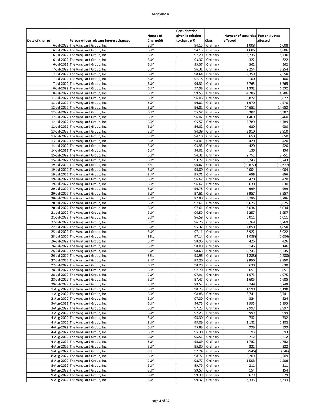Annexure A Date of change Person whose relevant interest changed Nature of Change(6) Consideration given in relation to change(7) Class Number of securities affected Person's votes affected 6-Jul-2022 The Vanguard Group, Inc. BUY 94.15 Ordinary 1,008 1,008 6-Jul-2022 The Vanguard Group, Inc. BUY 94.15 Ordinary 1,606 1,606 6-Jul-2022 The Vanguard Group, Inc. BUY 97.20 Ordinary 5,736 5,736 6-Jul-2022 The Vanguard Group, Inc. BUY 93.37 Ordinary 322 322 6-Jul-2022 The Vanguard Group, Inc. BUY 93.37 Ordinary 362 362 7-Jul-2022 The Vanguard Group, Inc. BUY 96.31 Ordinary 2,254 2,254 7-Jul-2022 The Vanguard Group, Inc. BUY 98.64 Ordinary 2,350 2,350 7-Jul-2022 The Vanguard Group, Inc. BUY 97.18 Ordinary 100 100 7-Jul-2022 The Vanguard Group, Inc. BUY 96.31 Ordinary 6,765 6,765 8-Jul-2022 The Vanguard Group, Inc. BUY 97.99 Ordinary 1,332 1,332 8-Jul-2022 The Vanguard Group, Inc. BUY 99.53 Ordinary 4,786 4,786 11-Jul-2022 The Vanguard Group, Inc. BUY 96.08 Ordinary 6,872 6,872 12-Jul-2022 The Vanguard Group, Inc. BUY 96.02 Ordinary 1,970 1,970 12-Jul-2022 The Vanguard Group, Inc. BUY 96.02 Ordinary 14,652 14,652 12-Jul-2022 The Vanguard Group, Inc. BUY 95.57 Ordinary 8,387 8,387 12-Jul-2022 The Vanguard Group, Inc. BUY 96.02 Ordinary 1,460 1,460 12-Jul-2022 The Vanguard Group, Inc. BUY 95.57 Ordinary 6,789 6,789 12-Jul-2022 The Vanguard Group, Inc. BUY 96.02 Ordinary 630 630 13-Jul-2022 The Vanguard Group, Inc. BUY 94.39 Ordinary 3,910 3,910 13-Jul-2022 The Vanguard Group, Inc. BUY 94.10 Ordinary 650 650 13-Jul-2022 The Vanguard Group, Inc. BUY 94.41 Ordinary 420 420 14-Jul-2022 The Vanguard Group, Inc. BUY 93.93 Ordinary 420 420 14-Jul-2022 The Vanguard Group, Inc. BUY 96.01 Ordinary 156 156 15-Jul-2022 The Vanguard Group, Inc. BUY 94.31 Ordinary 2,751 2,751 15-Jul-2022 The Vanguard Group, Inc. BUY 93.27 Ordinary 13,743 13,743 19-Jul-2022 The Vanguard Group, Inc. SELL 96.67 Ordinary (10,677) (10,677) 19-Jul-2022 The Vanguard Group, Inc. BUY 95.80 Ordinary 4,004 4,004 19-Jul-2022 The Vanguard Group, Inc. BUY 95.71 Ordinary 656 656 19-Jul-2022 The Vanguard Group, Inc. BUY 96.67 Ordinary 420 420 19-Jul-2022 The Vanguard Group, Inc. BUY 96.67 Ordinary 630 630 20-Jul-2022 The Vanguard Group, Inc. BUY 96.78 Ordinary 999 999 20-Jul-2022 The Vanguard Group, Inc. BUY 97.61 Ordinary 3,957 3,957 20-Jul-2022 The Vanguard Group, Inc. BUY 97.80 Ordinary 5,786 5,786 20-Jul-2022 The Vanguard Group, Inc. BUY 97.61 Ordinary 9,625 9,625 20-Jul-2022 The Vanguard Group, Inc. BUY 97.61 Ordinary 5,034 5,034 21-Jul-2022 The Vanguard Group, Inc. BUY 96.59 Ordinary 5,257 5,257 21-Jul-2022 The Vanguard Group, Inc. BUY 96.59 Ordinary 6,011 6,011 22-Jul-2022 The Vanguard Group, Inc. BUY 96.26 Ordinary 6,769 6,769 22-Jul-2022 The Vanguard Group, Inc. BUY 95.37 Ordinary 4,850 4,850 25-Jul-2022 The Vanguard Group, Inc. BUY 97.11 Ordinary 8,922 8,922 25-Jul-2022 The Vanguard Group, Inc. SELL 97.14 Ordinary (1,086) (1,086) 26-Jul-2022 The Vanguard Group, Inc. BUY 98.96 Ordinary 426 426 26-Jul-2022 The Vanguard Group, Inc. BUY 98.00 Ordinary 146 146 26-Jul-2022 The Vanguard Group, Inc. BUY 98.68 Ordinary 8,735 8,735 26-Jul-2022 The Vanguard Group, Inc. SELL 98.96 Ordinary (1,288) (1,288) 27-Jul-2022 The Vanguard Group, Inc. BUY 98.20 Ordinary 3,950 3,950 27-Jul-2022 The Vanguard Group, Inc. BUY 98.20 Ordinary 630 630 28-Jul-2022 The Vanguard Group, Inc. BUY 97.70 Ordinary 651 651 28-Jul-2022 The Vanguard Group, Inc. BUY 97.91 Ordinary 1,975 1,975 28-Jul-2022 The Vanguard Group, Inc. BUY 97.47 Ordinary 1,605 1,605 29-Jul-2022 The Vanguard Group, Inc. BUY 98.52 Ordinary 5,749 5,749 1-Aug-2022 The Vanguard Group, Inc. BUY 98.73 Ordinary 1,190 1,190 1-Aug-2022 The Vanguard Group, Inc. BUY 98.86 Ordinary 3,741 3,741 2-Aug-2022 The Vanguard Group, Inc. BUY 97.30 Ordinary 324 324 3-Aug-2022 The Vanguard Group, Inc. BUY 96.73 Ordinary 2,993 2,993 3-Aug-2022 The Vanguard Group, Inc. BUY 97.25 Ordinary 2,997 2,997 3-Aug-2022 The Vanguard Group, Inc. BUY 97.25 Ordinary 999 999 4-Aug-2022 The Vanguard Group, Inc. BUY 95.30 Ordinary 732 732 4-Aug-2022 The Vanguard Group, Inc. BUY 95.89 Ordinary 1,182 1,182 4-Aug-2022 The Vanguard Group, Inc. BUY 95.89 Ordinary 999 999 4-Aug-2022 The Vanguard Group, Inc. BUY 95.30 Ordinary 93 93 4-Aug-2022 The Vanguard Group, Inc. BUY 95.51 Ordinary 3,712 3,712 4-Aug-2022 The Vanguard Group, Inc. BUY 95.89 Ordinary 1,752 1,752 4-Aug-2022 The Vanguard Group, Inc. BUY 95.30 Ordinary 322 322 5-Aug-2022 The Vanguard Group, Inc. SELL 97.74 Ordinary (546) (546) 8-Aug-2022 The Vanguard Group, Inc. BUY 98.77 Ordinary 3,209 3,209 8-Aug-2022 The Vanguard Group, Inc. BUY 98.77 Ordinary 1,508 1,508 8-Aug-2022 The Vanguard Group, Inc. BUY 99.75 Ordinary 211 211 8-Aug-2022 The Vanguard Group, Inc. BUY 99.57 Ordinary 154 154 9-Aug-2022 The Vanguard Group, Inc. BUY 99.39 Ordinary 679 679 9-Aug-2022 The Vanguard Group, Inc. BUY 99.37 Ordinary 6,333 6,333 Page 4 of 32