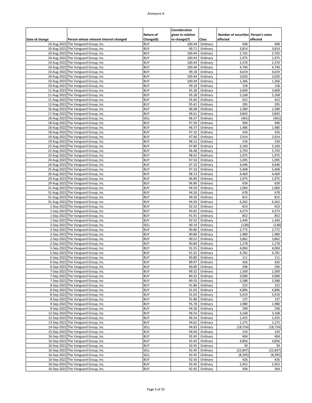 Annexure A Date of change Person whose relevant interest changed Nature of Change(6) Consideration given in relation to change(7) Class Number of securities affected Person's votes affected 10-Aug-2022 The Vanguard Group, Inc. BUY 100.44 Ordinary 948 948 10-Aug-2022 The Vanguard Group, Inc. BUY 99.71 Ordinary 3,814 3,814 10-Aug-2022 The Vanguard Group, Inc. BUY 100.44 Ordinary 2,765 2,765 10-Aug-2022 The Vanguard Group, Inc. BUY 100.44 Ordinary 1,975 1,975 10-Aug-2022 The Vanguard Group, Inc. BUY 100.44 Ordinary 2,370 2,370 10-Aug-2022 The Vanguard Group, Inc. BUY 100.44 Ordinary 4,740 4,740 10-Aug-2022 The Vanguard Group, Inc. BUY 99.18 Ordinary 4,019 4,019 10-Aug-2022 The Vanguard Group, Inc. BUY 100.44 Ordinary 3,650 3,650 10-Aug-2022 The Vanguard Group, Inc. BUY 100.44 Ordinary 1,266 1,266 10-Aug-2022 The Vanguard Group, Inc. BUY 99.18 Ordinary 158 158 11-Aug-2022 The Vanguard Group, Inc. BUY 95.28 Ordinary 3,609 3,609 11-Aug-2022 The Vanguard Group, Inc. BUY 95.28 Ordinary 5,168 5,168 11-Aug-2022 The Vanguard Group, Inc. BUY 95.00 Ordinary 422 422 12-Aug-2022 The Vanguard Group, Inc. BUY 95.41 Ordinary 295 295 16-Aug-2022 The Vanguard Group, Inc. BUY 96.08 Ordinary 1,580 1,580 17-Aug-2022 The Vanguard Group, Inc. BUY 96.61 Ordinary 3,843 3,843 18-Aug-2022 The Vanguard Group, Inc. SELL 96.37 Ordinary (461) (461) 18-Aug-2022 The Vanguard Group, Inc. BUY 97.39 Ordinary 940 940 18-Aug-2022 The Vanguard Group, Inc. BUY 96.37 Ordinary 1,486 1,486 18-Aug-2022 The Vanguard Group, Inc. BUY 97.10 Ordinary 326 326 19-Aug-2022 The Vanguard Group, Inc. BUY 97.60 Ordinary 2,914 2,914 19-Aug-2022 The Vanguard Group, Inc. BUY 98.12 Ordinary 234 234 22-Aug-2022 The Vanguard Group, Inc. BUY 97.89 Ordinary 3,160 3,160 22-Aug-2022 The Vanguard Group, Inc. BUY 96.48 Ordinary 5,793 5,793 23-Aug-2022 The Vanguard Group, Inc. BUY 98.42 Ordinary 1,975 1,975 24-Aug-2022 The Vanguard Group, Inc. BUY 97.54 Ordinary 1,095 1,095 24-Aug-2022 The Vanguard Group, Inc. BUY 97.10 Ordinary 4,446 4,446 25-Aug-2022 The Vanguard Group, Inc. BUY 97.10 Ordinary 5,468 5,468 26-Aug-2022 The Vanguard Group, Inc. BUY 98.13 Ordinary 4,469 4,469 29-Aug-2022 The Vanguard Group, Inc. BUY 96.89 Ordinary 1,975 1,975 29-Aug-2022 The Vanguard Group, Inc. BUY 96.89 Ordinary 639 639 31-Aug-2022 The Vanguard Group, Inc. BUY 94.50 Ordinary 1,066 1,066 31-Aug-2022 The Vanguard Group, Inc. BUY 94.50 Ordinary 678 678 31-Aug-2022 The Vanguard Group, Inc. BUY 94.50 Ordinary 815 815 31-Aug-2022 The Vanguard Group, Inc. BUY 94.50 Ordinary 6,262 6,262 1-Sep-2022 The Vanguard Group, Inc. BUY 92.52 Ordinary 653 653 1-Sep-2022 The Vanguard Group, Inc. BUY 93.65 Ordinary 4,573 4,573 1-Sep-2022 The Vanguard Group, Inc. BUY 91.91 Ordinary 852 852 1-Sep-2022 The Vanguard Group, Inc. BUY 92.52 Ordinary 1,440 1,440 2-Sep-2022 The Vanguard Group, Inc. SELL 90.19 Ordinary (138) (138) 2-Sep-2022 The Vanguard Group, Inc. BUY 90.80 Ordinary 2,772 2,772 2-Sep-2022 The Vanguard Group, Inc. BUY 90.80 Ordinary 1,980 1,980 2-Sep-2022 The Vanguard Group, Inc. BUY 90.52 Ordinary 3,862 3,862 2-Sep-2022 The Vanguard Group, Inc. BUY 90.80 Ordinary 1,278 1,278 5-Sep-2022 The Vanguard Group, Inc. BUY 91.55 Ordinary 4,004 4,004 5-Sep-2022 The Vanguard Group, Inc. BUY 91.55 Ordinary 4,781 4,781 6-Sep-2022 The Vanguard Group, Inc. BUY 90.80 Ordinary 111 111 6-Sep-2022 The Vanguard Group, Inc. BUY 89.97 Ordinary 426 426 6-Sep-2022 The Vanguard Group, Inc. BUY 90.80 Ordinary 296 296 7-Sep-2022 The Vanguard Group, Inc. BUY 89.32 Ordinary 1,500 1,500 7-Sep-2022 The Vanguard Group, Inc. BUY 89.32 Ordinary 3,000 3,000 7-Sep-2022 The Vanguard Group, Inc. BUY 90.55 Ordinary 5,588 5,588 8-Sep-2022 The Vanguard Group, Inc. BUY 91.86 Ordinary 222 222 8-Sep-2022 The Vanguard Group, Inc. BUY 91.03 Ordinary 4,896 4,896 8-Sep-2022 The Vanguard Group, Inc. BUY 91.03 Ordinary 5,919 5,919 8-Sep-2022 The Vanguard Group, Inc. BUY 91.86 Ordinary 137 137 9-Sep-2022 The Vanguard Group, Inc. BUY 95.78 Ordinary 1,980 1,980 9-Sep-2022 The Vanguard Group, Inc. BUY 94.36 Ordinary 298 298 12-Sep-2022 The Vanguard Group, Inc. BUY 96.54 Ordinary 3,168 3,168 12-Sep-2022 The Vanguard Group, Inc. BUY 96.54 Ordinary 1,425 1,425 13-Sep-2022 The Vanguard Group, Inc. BUY 94.62 Ordinary 1,275 1,275 14-Sep-2022 The Vanguard Group, Inc. SELL 94.83 Ordinary (18,724) (18,724) 15-Sep-2022 The Vanguard Group, Inc. BUY 94.64 Ordinary 143 143 16-Sep-2022 The Vanguard Group, Inc. BUY 92.45 Ordinary 404 404 16-Sep-2022 The Vanguard Group, Inc. BUY 92.45 Ordinary 4,856 4,856 16-Sep-2022 The Vanguard Group, Inc. BUY 92.45 Ordinary 39 39 16-Sep-2022 The Vanguard Group, Inc. SELL 92.45 Ordinary (22,847) (22,847) 16-Sep-2022 The Vanguard Group, Inc. SELL 92.45 Ordinary (8,395) (8,395) 16-Sep-2022 The Vanguard Group, Inc. BUY 92.56 Ordinary 426 426 16-Sep-2022 The Vanguard Group, Inc. BUY 92.45 Ordinary 2,452 2,452 16-Sep-2022 The Vanguard Group, Inc. BUY 92.45 Ordinary 304 304 Page 5 of 32