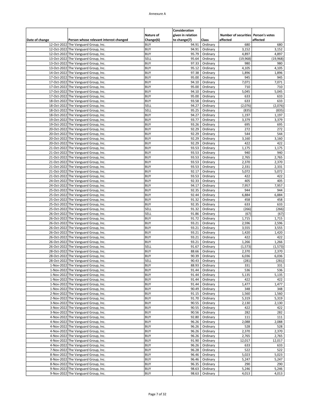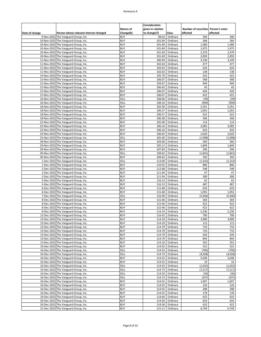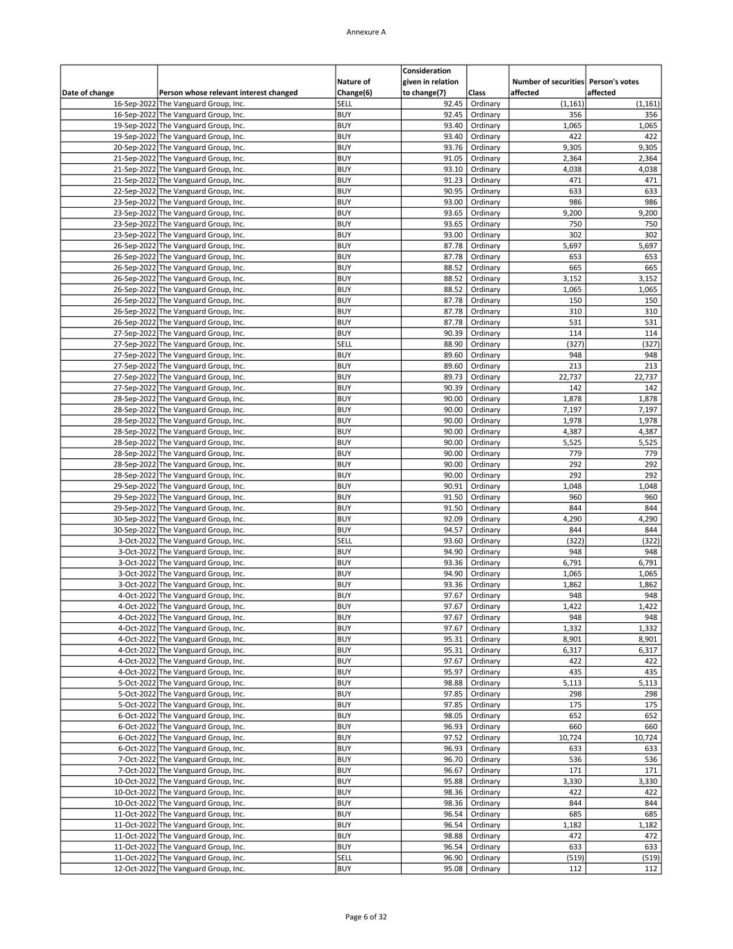 Annexure A Date of change Person whose relevant interest changed Nature of Change(6) Consideration given in relation to change(7) Class Number of securities affected Person's votes affected 12-Oct-2022 The Vanguard Group, Inc. BUY 94.91 Ordinary 680 680 12-Oct-2022 The Vanguard Group, Inc. BUY 94.91 Ordinary 3,152 3,152 12-Oct-2022 The Vanguard Group, Inc. BUY 95.79 Ordinary 4,897 4,897 13-Oct-2022 The Vanguard Group, Inc. SELL 95.64 Ordinary (19,968) (19,968) 13-Oct-2022 The Vanguard Group, Inc. BUY 97.33 Ordinary 980 980 13-Oct-2022 The Vanguard Group, Inc. BUY 95.12 Ordinary 4,105 4,105 14-Oct-2022 The Vanguard Group, Inc. BUY 97.38 Ordinary 1,896 1,896 17-Oct-2022 The Vanguard Group, Inc. BUY 95.00 Ordinary 945 945 17-Oct-2022 The Vanguard Group, Inc. BUY 94.10 Ordinary 7,071 7,071 17-Oct-2022 The Vanguard Group, Inc. BUY 95.00 Ordinary 710 710 17-Oct-2022 The Vanguard Group, Inc. BUY 94.10 Ordinary 5,045 5,045 17-Oct-2022 The Vanguard Group, Inc. BUY 95.00 Ordinary 633 633 18-Oct-2022 The Vanguard Group, Inc. BUY 93.58 Ordinary 633 633 18-Oct-2022 The Vanguard Group, Inc. SELL 94.27 Ordinary (2,076) (2,076) 18-Oct-2022 The Vanguard Group, Inc. SELL 95.25 Ordinary (835) (835) 18-Oct-2022 The Vanguard Group, Inc. BUY 94.27 Ordinary 1,197 1,197 19-Oct-2022 The Vanguard Group, Inc. BUY 93.77 Ordinary 3,379 3,379 19-Oct-2022 The Vanguard Group, Inc. BUY 93.26 Ordinary 695 695 20-Oct-2022 The Vanguard Group, Inc. BUY 92.29 Ordinary 272 272 20-Oct-2022 The Vanguard Group, Inc. BUY 92.29 Ordinary 544 544 20-Oct-2022 The Vanguard Group, Inc. BUY 92.29 Ordinary 3,160 3,160 20-Oct-2022 The Vanguard Group, Inc. BUY 92.29 Ordinary 422 422 21-Oct-2022 The Vanguard Group, Inc. BUY 93.53 Ordinary 1,175 1,175 21-Oct-2022 The Vanguard Group, Inc. BUY 93.53 Ordinary 940 940 21-Oct-2022 The Vanguard Group, Inc. BUY 93.53 Ordinary 2,765 2,765 21-Oct-2022 The Vanguard Group, Inc. BUY 93.53 Ordinary 2,370 2,370 21-Oct-2022 The Vanguard Group, Inc. BUY 93.53 Ordinary 2,331 2,331 21-Oct-2022 The Vanguard Group, Inc. BUY 92.17 Ordinary 5,072 5,072 21-Oct-2022 The Vanguard Group, Inc. BUY 93.53 Ordinary 422 422 24-Oct-2022 The Vanguard Group, Inc. BUY 92.33 Ordinary 405 405 24-Oct-2022 The Vanguard Group, Inc. BUY 94.17 Ordinary 7,957 7,957 25-Oct-2022 The Vanguard Group, Inc. BUY 92.35 Ordinary 944 944 25-Oct-2022 The Vanguard Group, Inc. BUY 92.44 Ordinary 6,884 6,884 25-Oct-2022 The Vanguard Group, Inc. BUY 91.32 Ordinary 458 458 25-Oct-2022 The Vanguard Group, Inc. BUY 92.35 Ordinary 633 633 25-Oct-2022 The Vanguard Group, Inc. SELL 91.32 Ordinary (266) (266) 26-Oct-2022 The Vanguard Group, Inc. SELL 91.86 Ordinary (67) (67) 26-Oct-2022 The Vanguard Group, Inc. BUY 91.72 Ordinary 1,715 1,715 26-Oct-2022 The Vanguard Group, Inc. BUY 93.21 Ordinary 2,596 2,596 26-Oct-2022 The Vanguard Group, Inc. BUY 93.21 Ordinary 3,555 3,555 26-Oct-2022 The Vanguard Group, Inc. BUY 93.21 Ordinary 1,420 1,420 26-Oct-2022 The Vanguard Group, Inc. BUY 93.21 Ordinary 422 422 26-Oct-2022 The Vanguard Group, Inc. BUY 93.21 Ordinary 1,266 1,266 26-Oct-2022 The Vanguard Group, Inc. SELL 91.67 Ordinary (1,573) (1,573) 28-Oct-2022 The Vanguard Group, Inc. BUY 88.66 Ordinary 2,370 2,370 28-Oct-2022 The Vanguard Group, Inc. BUY 90.39 Ordinary 6,036 6,036 28-Oct-2022 The Vanguard Group, Inc. SELL 90.43 Ordinary (281) (281) 1-Nov-2022 The Vanguard Group, Inc. BUY 88.93 Ordinary 331 331 1-Nov-2022 The Vanguard Group, Inc. BUY 91.44 Ordinary 536 536 1-Nov-2022 The Vanguard Group, Inc. BUY 91.44 Ordinary 5,135 5,135 1-Nov-2022 The Vanguard Group, Inc. BUY 91.44 Ordinary 422 422 1-Nov-2022 The Vanguard Group, Inc. BUY 91.44 Ordinary 1,477 1,477 1-Nov-2022 The Vanguard Group, Inc. BUY 90.49 Ordinary 348 348 2-Nov-2022 The Vanguard Group, Inc. BUY 91.15 Ordinary 1,560 1,560 2-Nov-2022 The Vanguard Group, Inc. BUY 91.70 Ordinary 5,319 5,319 3-Nov-2022 The Vanguard Group, Inc. BUY 90.55 Ordinary 2,130 2,130 3-Nov-2022 The Vanguard Group, Inc. BUY 90.55 Ordinary 422 422 3-Nov-2022 The Vanguard Group, Inc. BUY 90.56 Ordinary 282 282 4-Nov-2022 The Vanguard Group, Inc. BUY 92.80 Ordinary 111 111 4-Nov-2022 The Vanguard Group, Inc. BUY 96.26 Ordinary 2,088 2,088 4-Nov-2022 The Vanguard Group, Inc. BUY 96.26 Ordinary 528 528 4-Nov-2022 The Vanguard Group, Inc. BUY 96.26 Ordinary 2,370 2,370 4-Nov-2022 The Vanguard Group, Inc. BUY 96.26 Ordinary 2,765 2,765 4-Nov-2022 The Vanguard Group, Inc. BUY 91.90 Ordinary 12,017 12,017 4-Nov-2022 The Vanguard Group, Inc. BUY 96.26 Ordinary 633 633 7-Nov-2022 The Vanguard Group, Inc. BUY 96.28 Ordinary 522 522 8-Nov-2022 The Vanguard Group, Inc. BUY 96.46 Ordinary 5,023 5,023 8-Nov-2022 The Vanguard Group, Inc. BUY 96.46 Ordinary 5,247 5,247 8-Nov-2022 The Vanguard Group, Inc. BUY 96.35 Ordinary 290 290 9-Nov-2022 The Vanguard Group, Inc. BUY 98.63 Ordinary 5,246 5,246 9-Nov-2022 The Vanguard Group, Inc. BUY 98.63 Ordinary 4,013 4,013 Page 7 of 32