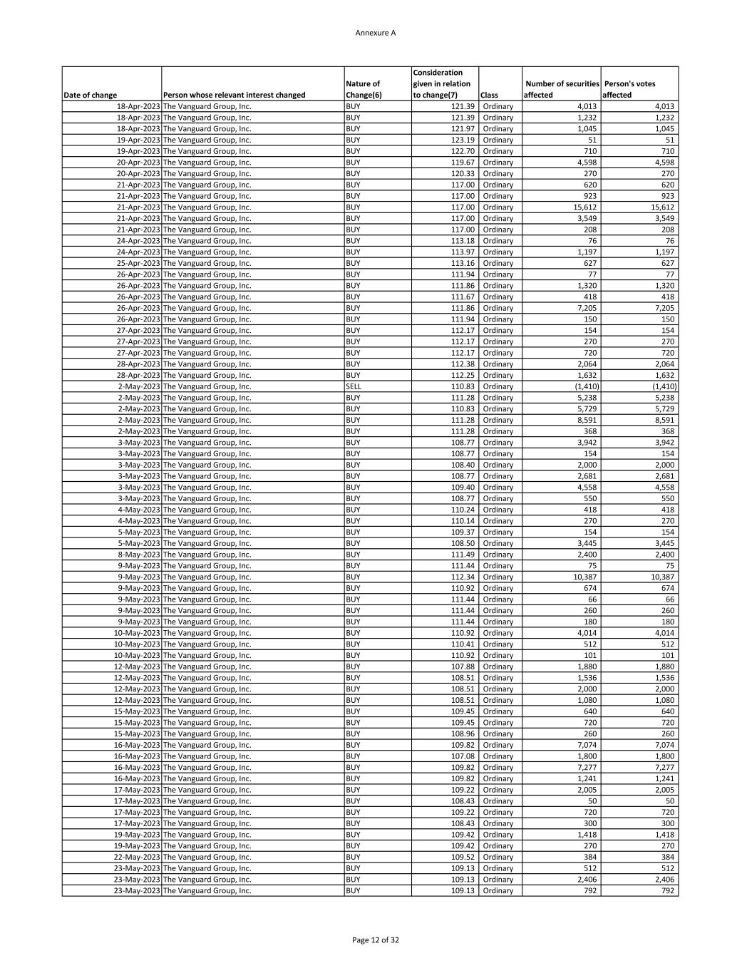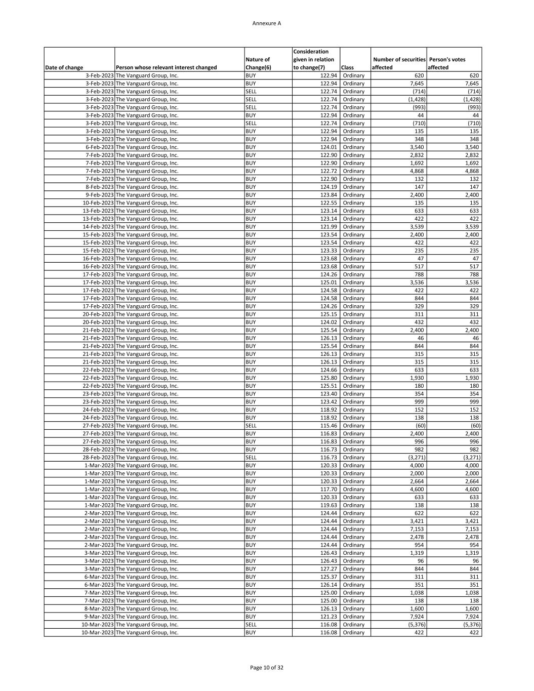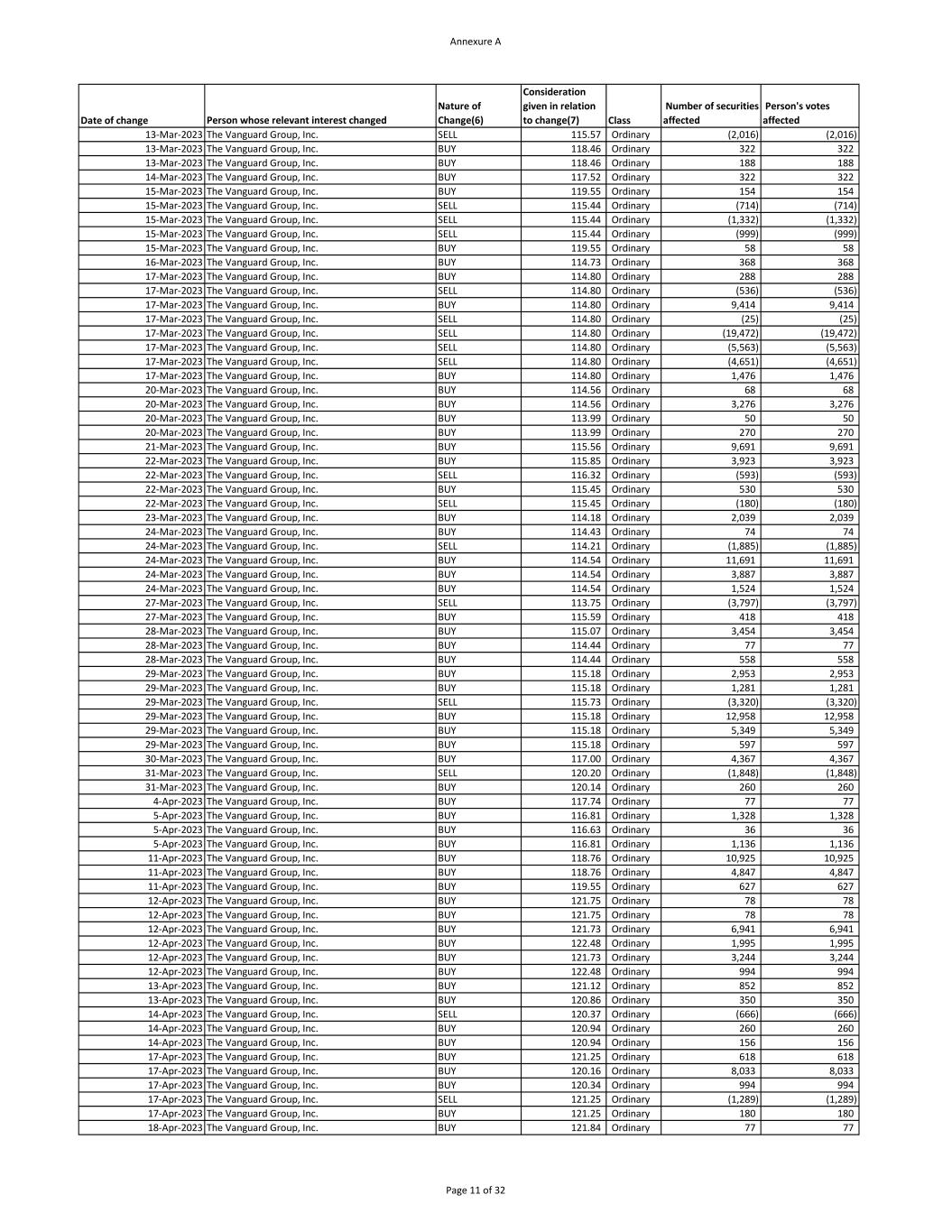 Annexure A Date of change Person whose relevant interest changed Nature of Change(6) Consideration given in relation to change(7) Class Number of securities affected Person's votes affected 13-Mar-2023 The Vanguard Group, Inc. SELL 115.57 Ordinary (2,016) (2,016) 13-Mar-2023 The Vanguard Group, Inc. BUY 118.46 Ordinary 322 322 13-Mar-2023 The Vanguard Group, Inc. BUY 118.46 Ordinary 188 188 14-Mar-2023 The Vanguard Group, Inc. BUY 117.52 Ordinary 322 322 15-Mar-2023 The Vanguard Group, Inc. BUY 119.55 Ordinary 154 154 15-Mar-2023 The Vanguard Group, Inc. SELL 115.44 Ordinary (714) (714) 15-Mar-2023 The Vanguard Group, Inc. SELL 115.44 Ordinary (1,332) (1,332) 15-Mar-2023 The Vanguard Group, Inc. SELL 115.44 Ordinary (999) (999) 15-Mar-2023 The Vanguard Group, Inc. BUY 119.55 Ordinary 58 58 16-Mar-2023 The Vanguard Group, Inc. BUY 114.73 Ordinary 368 368 17-Mar-2023 The Vanguard Group, Inc. BUY 114.80 Ordinary 288 288 17-Mar-2023 The Vanguard Group, Inc. SELL 114.80 Ordinary (536) (536) 17-Mar-2023 The Vanguard Group, Inc. BUY 114.80 Ordinary 9,414 9,414 17-Mar-2023 The Vanguard Group, Inc. SELL 114.80 Ordinary (25) (25) 17-Mar-2023 The Vanguard Group, Inc. SELL 114.80 Ordinary (19,472) (19,472) 17-Mar-2023 The Vanguard Group, Inc. SELL 114.80 Ordinary (5,563) (5,563) 17-Mar-2023 The Vanguard Group, Inc. SELL 114.80 Ordinary (4,651) (4,651) 17-Mar-2023 The Vanguard Group, Inc. BUY 114.80 Ordinary 1,476 1,476 20-Mar-2023 The Vanguard Group, Inc. BUY 114.56 Ordinary 68 68 20-Mar-2023 The Vanguard Group, Inc. BUY 114.56 Ordinary 3,276 3,276 20-Mar-2023 The Vanguard Group, Inc. BUY 113.99 Ordinary 50 50 20-Mar-2023 The Vanguard Group, Inc. BUY 113.99 Ordinary 270 270 21-Mar-2023 The Vanguard Group, Inc. BUY 115.56 Ordinary 9,691 9,691 22-Mar-2023 The Vanguard Group, Inc. BUY 115.85 Ordinary 3,923 3,923 22-Mar-2023 The Vanguard Group, Inc. SELL 116.32 Ordinary (593) (593) 22-Mar-2023 The Vanguard Group, Inc. BUY 115.45 Ordinary 530 530 22-Mar-2023 The Vanguard Group, Inc. SELL 115.45 Ordinary (180) (180) 23-Mar-2023 The Vanguard Group, Inc. BUY 114.18 Ordinary 2,039 2,039 24-Mar-2023 The Vanguard Group, Inc. BUY 114.43 Ordinary 74 74 24-Mar-2023 The Vanguard Group, Inc. SELL 114.21 Ordinary (1,885) (1,885) 24-Mar-2023 The Vanguard Group, Inc. BUY 114.54 Ordinary 11,691 11,691 24-Mar-2023 The Vanguard Group, Inc. BUY 114.54 Ordinary 3,887 3,887 24-Mar-2023 The Vanguard Group, Inc. BUY 114.54 Ordinary 1,524 1,524 27-Mar-2023 The Vanguard Group, Inc. SELL 113.75 Ordinary (3,797) (3,797) 27-Mar-2023 The Vanguard Group, Inc. BUY 115.59 Ordinary 418 418 28-Mar-2023 The Vanguard Group, Inc. BUY 115.07 Ordinary 3,454 3,454 28-Mar-2023 The Vanguard Group, Inc. BUY 114.44 Ordinary 77 77 28-Mar-2023 The Vanguard Group, Inc. BUY 114.44 Ordinary 558 558 29-Mar-2023 The Vanguard Group, Inc. BUY 115.18 Ordinary 2,953 2,953 29-Mar-2023 The Vanguard Group, Inc. BUY 115.18 Ordinary 1,281 1,281 29-Mar-2023 The Vanguard Group, Inc. SELL 115.73 Ordinary (3,320) (3,320) 29-Mar-2023 The Vanguard Group, Inc. BUY 115.18 Ordinary 12,958 12,958 29-Mar-2023 The Vanguard Group, Inc. BUY 115.18 Ordinary 5,349 5,349 29-Mar-2023 The Vanguard Group, Inc. BUY 115.18 Ordinary 597 597 30-Mar-2023 The Vanguard Group, Inc. BUY 117.00 Ordinary 4,367 4,367 31-Mar-2023 The Vanguard Group, Inc. SELL 120.20 Ordinary (1,848) (1,848) 31-Mar-2023 The Vanguard Group, Inc. BUY 120.14 Ordinary 260 260 4-Apr-2023 The Vanguard Group, Inc. BUY 117.74 Ordinary 77 77 5-Apr-2023 The Vanguard Group, Inc. BUY 116.81 Ordinary 1,328 1,328 5-Apr-2023 The Vanguard Group, Inc. BUY 116.63 Ordinary 36 36 5-Apr-2023 The Vanguard Group, Inc. BUY 116.81 Ordinary 1,136 1,136 11-Apr-2023 The Vanguard Group, Inc. BUY 118.76 Ordinary 10,925 10,925 11-Apr-2023 The Vanguard Group, Inc. BUY 118.76 Ordinary 4,847 4,847 11-Apr-2023 The Vanguard Group, Inc. BUY 119.55 Ordinary 627 627 12-Apr-2023 The Vanguard Group, Inc. BUY 121.75 Ordinary 78 78 12-Apr-2023 The Vanguard Group, Inc. BUY 121.75 Ordinary 78 78 12-Apr-2023 The Vanguard Group, Inc. BUY 121.73 Ordinary 6,941 6,941 12-Apr-2023 The Vanguard Group, Inc. BUY 122.48 Ordinary 1,995 1,995 12-Apr-2023 The Vanguard Group, Inc. BUY 121.73 Ordinary 3,244 3,244 12-Apr-2023 The Vanguard Group, Inc. BUY 122.48 Ordinary 994 994 13-Apr-2023 The Vanguard Group, Inc. BUY 121.12 Ordinary 852 852 13-Apr-2023 The Vanguard Group, Inc. BUY 120.86 Ordinary 350 350 14-Apr-2023 The Vanguard Group, Inc. SELL 120.37 Ordinary (666) (666) 14-Apr-2023 The Vanguard Group, Inc. BUY 120.94 Ordinary 260 260 14-Apr-2023 The Vanguard Group, Inc. BUY 120.94 Ordinary 156 156 17-Apr-2023 The Vanguard Group, Inc. BUY 121.25 Ordinary 618 618 17-Apr-2023 The Vanguard Group, Inc. BUY 120.16 Ordinary 8,033 8,033 17-Apr-2023 The Vanguard Group, Inc. BUY 120.34 Ordinary 994 994 17-Apr-2023 The Vanguard Group, Inc. SELL 121.25 Ordinary (1,289) (1,289) 17-Apr-2023 The Vanguard Group, Inc. BUY 121.25 Ordinary 180 180 18-Apr-2023 The Vanguard Group, Inc. BUY 121.84 Ordinary 77 77 Page 11 of 32
