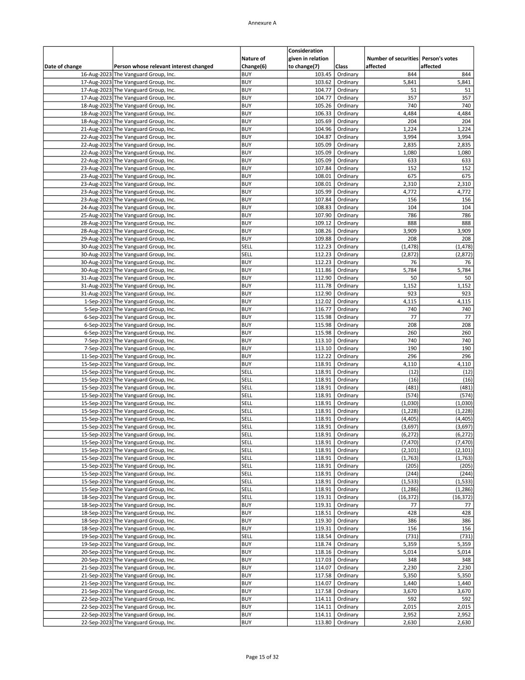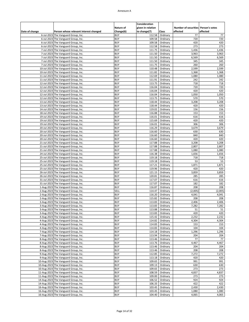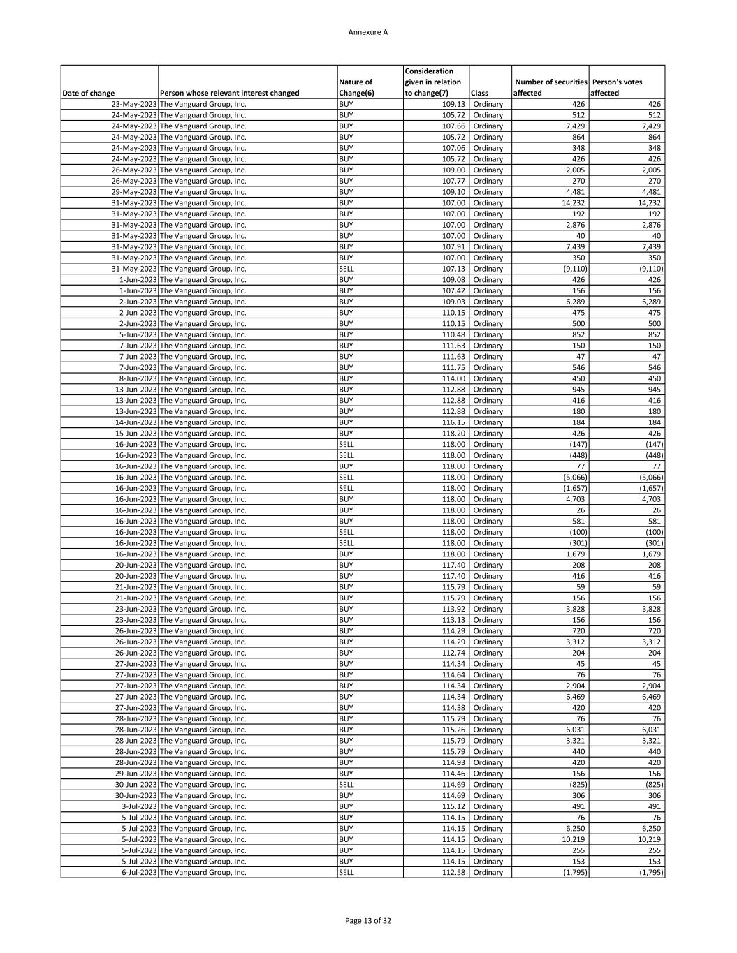 Annexure A Date of change Person whose relevant interest changed Nature of Change(6) Consideration given in relation to change(7) Class Number of securities affected Person's votes affected 6-Jul-2023 The Vanguard Group, Inc. BUY 112.58 Ordinary 77 77 6-Jul-2023 The Vanguard Group, Inc. BUY 109.58 Ordinary 720 720 6-Jul-2023 The Vanguard Group, Inc. BUY 109.58 Ordinary 420 420 6-Jul-2023 The Vanguard Group, Inc. BUY 112.58 Ordinary 273 273 7-Jul-2023 The Vanguard Group, Inc. BUY 111.75 Ordinary 1,436 1,436 7-Jul-2023 The Vanguard Group, Inc. BUY 111.50 Ordinary 3,963 3,963 7-Jul-2023 The Vanguard Group, Inc. BUY 111.50 Ordinary 6,569 6,569 7-Jul-2023 The Vanguard Group, Inc. BUY 111.50 Ordinary 345 345 7-Jul-2023 The Vanguard Group, Inc. BUY 111.75 Ordinary 260 260 10-Jul-2023 The Vanguard Group, Inc. BUY 110.48 Ordinary 2,599 2,599 10-Jul-2023 The Vanguard Group, Inc. BUY 111.82 Ordinary 1,368 1,368 11-Jul-2023 The Vanguard Group, Inc. BUY 112.69 Ordinary 1,080 1,080 11-Jul-2023 The Vanguard Group, Inc. BUY 111.91 Ordinary 242 242 12-Jul-2023 The Vanguard Group, Inc. BUY 113.75 Ordinary 718 718 12-Jul-2023 The Vanguard Group, Inc. BUY 116.04 Ordinary 720 720 12-Jul-2023 The Vanguard Group, Inc. BUY 116.04 Ordinary 420 420 12-Jul-2023 The Vanguard Group, Inc. BUY 116.04 Ordinary 1,050 1,050 12-Jul-2023 The Vanguard Group, Inc. BUY 113.75 Ordinary 570 570 13-Jul-2023 The Vanguard Group, Inc. BUY 118.44 Ordinary 3,208 3,208 13-Jul-2023 The Vanguard Group, Inc. BUY 118.44 Ordinary 420 420 14-Jul-2023 The Vanguard Group, Inc. BUY 119.02 Ordinary 156 156 18-Jul-2023 The Vanguard Group, Inc. BUY 116.88 Ordinary 153 153 19-Jul-2023 The Vanguard Group, Inc. BUY 116.01 Ordinary 616 616 19-Jul-2023 The Vanguard Group, Inc. BUY 115.69 Ordinary 420 420 19-Jul-2023 The Vanguard Group, Inc. BUY 116.01 Ordinary 306 306 20-Jul-2023 The Vanguard Group, Inc. BUY 116.29 Ordinary 3,679 3,679 20-Jul-2023 The Vanguard Group, Inc. BUY 116.60 Ordinary 630 630 20-Jul-2023 The Vanguard Group, Inc. BUY 116.60 Ordinary 840 840 20-Jul-2023 The Vanguard Group, Inc. BUY 116.60 Ordinary 420 420 21-Jul-2023 The Vanguard Group, Inc. BUY 117.88 Ordinary 3,208 3,208 21-Jul-2023 The Vanguard Group, Inc. BUY 117.88 Ordinary 2,807 2,807 21-Jul-2023 The Vanguard Group, Inc. BUY 117.88 Ordinary 1,080 1,080 24-Jul-2023 The Vanguard Group, Inc. BUY 116.38 Ordinary 1,656 1,656 25-Jul-2023 The Vanguard Group, Inc. BUY 119.18 Ordinary 718 718 25-Jul-2023 The Vanguard Group, Inc. BUY 119.18 Ordinary 53 53 25-Jul-2023 The Vanguard Group, Inc. BUY 117.21 Ordinary 1,871 1,871 25-Jul-2023 The Vanguard Group, Inc. BUY 119.96 Ordinary 420 420 26-Jul-2023 The Vanguard Group, Inc. BUY 121.15 Ordinary 3,859 3,859 26-Jul-2023 The Vanguard Group, Inc. BUY 120.81 Ordinary 285 285 31-Jul-2023 The Vanguard Group, Inc. BUY 117.07 Ordinary 616 616 31-Jul-2023 The Vanguard Group, Inc. BUY 117.07 Ordinary 182 182 1-Aug-2023 The Vanguard Group, Inc. BUY 116.87 Ordinary 208 208 2-Aug-2023 The Vanguard Group, Inc. SELL 114.47 Ordinary (2,005) (2,005) 2-Aug-2023 The Vanguard Group, Inc. BUY 116.20 Ordinary 4,041 4,041 2-Aug-2023 The Vanguard Group, Inc. BUY 115.82 Ordinary 208 208 3-Aug-2023 The Vanguard Group, Inc. BUY 113.83 Ordinary 2,406 2,406 3-Aug-2023 The Vanguard Group, Inc. BUY 113.83 Ordinary 7,282 7,282 3-Aug-2023 The Vanguard Group, Inc. BUY 113.88 Ordinary 51 51 3-Aug-2023 The Vanguard Group, Inc. BUY 113.83 Ordinary 420 420 4-Aug-2023 The Vanguard Group, Inc. BUY 115.42 Ordinary 2,232 2,232 4-Aug-2023 The Vanguard Group, Inc. BUY 114.82 Ordinary 4,304 4,304 4-Aug-2023 The Vanguard Group, Inc. BUY 114.83 Ordinary 153 153 4-Aug-2023 The Vanguard Group, Inc. BUY 114.83 Ordinary 104 104 7-Aug-2023 The Vanguard Group, Inc. BUY 114.18 Ordinary 1,296 1,296 7-Aug-2023 The Vanguard Group, Inc. BUY 113.94 Ordinary 204 204 8-Aug-2023 The Vanguard Group, Inc. BUY 113.46 Ordinary 77 77 8-Aug-2023 The Vanguard Group, Inc. BUY 113.76 Ordinary 4,467 4,467 8-Aug-2023 The Vanguard Group, Inc. BUY 113.46 Ordinary 204 204 8-Aug-2023 The Vanguard Group, Inc. BUY 113.46 Ordinary 208 208 9-Aug-2023 The Vanguard Group, Inc. BUY 112.85 Ordinary 7,272 7,272 9-Aug-2023 The Vanguard Group, Inc. BUY 113.18 Ordinary 420 420 10-Aug-2023 The Vanguard Group, Inc. BUY 109.65 Ordinary 991 991 10-Aug-2023 The Vanguard Group, Inc. BUY 109.13 Ordinary 630 630 10-Aug-2023 The Vanguard Group, Inc. BUY 109.65 Ordinary 273 273 11-Aug-2023 The Vanguard Group, Inc. BUY 108.59 Ordinary 4,837 4,837 11-Aug-2023 The Vanguard Group, Inc. BUY 109.00 Ordinary 273 273 14-Aug-2023 The Vanguard Group, Inc. BUY 106.52 Ordinary 924 924 14-Aug-2023 The Vanguard Group, Inc. BUY 106.33 Ordinary 422 422 16-Aug-2023 The Vanguard Group, Inc. BUY 103.45 Ordinary 2,430 2,430 16-Aug-2023 The Vanguard Group, Inc. BUY 103.45 Ordinary 1,080 1,080 16-Aug-2023 The Vanguard Group, Inc. BUY 104.40 Ordinary 4,065 4,065 Page 14 of 32