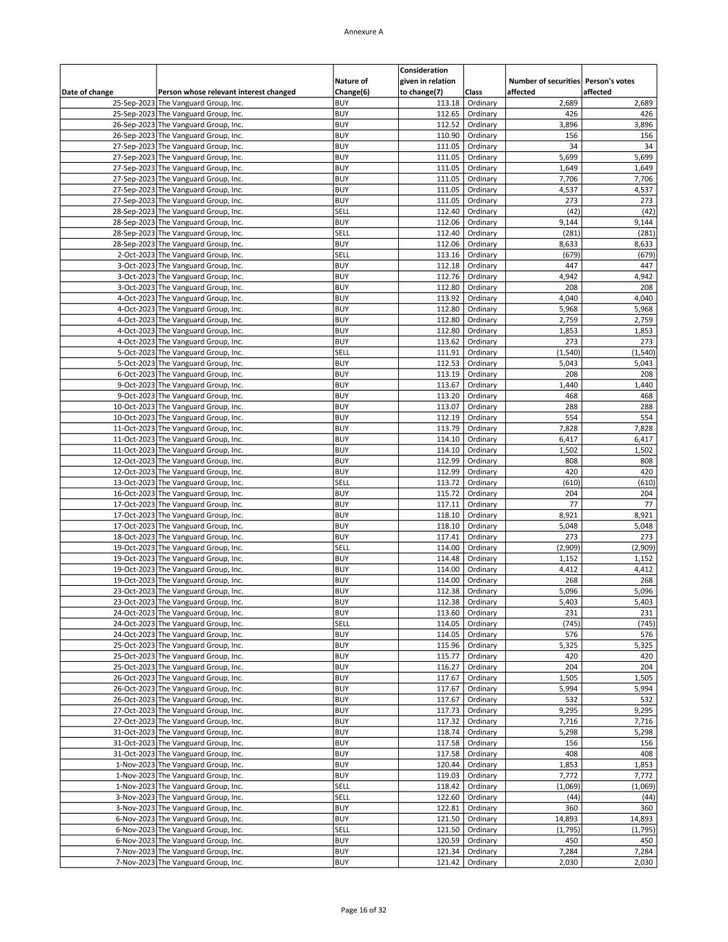 Annexure A Date of change Person whose relevant interest changed Nature of Change(6) Consideration given in relation to change(7) Class Number of securities affected Person's votes affected 25-Sep-2023 The Vanguard Group, Inc. BUY 113.18 Ordinary 2,689 2,689 25-Sep-2023 The Vanguard Group, Inc. BUY 112.65 Ordinary 426 426 26-Sep-2023 The Vanguard Group, Inc. BUY 112.52 Ordinary 3,896 3,896 26-Sep-2023 The Vanguard Group, Inc. BUY 110.90 Ordinary 156 156 27-Sep-2023 The Vanguard Group, Inc. BUY 111.05 Ordinary 34 34 27-Sep-2023 The Vanguard Group, Inc. BUY 111.05 Ordinary 5,699 5,699 27-Sep-2023 The Vanguard Group, Inc. BUY 111.05 Ordinary 1,649 1,649 27-Sep-2023 The Vanguard Group, Inc. BUY 111.05 Ordinary 7,706 7,706 27-Sep-2023 The Vanguard Group, Inc. BUY 111.05 Ordinary 4,537 4,537 27-Sep-2023 The Vanguard Group, Inc. BUY 111.05 Ordinary 273 273 28-Sep-2023 The Vanguard Group, Inc. SELL 112.40 Ordinary (42) (42) 28-Sep-2023 The Vanguard Group, Inc. BUY 112.06 Ordinary 9,144 9,144 28-Sep-2023 The Vanguard Group, Inc. SELL 112.40 Ordinary (281) (281) 28-Sep-2023 The Vanguard Group, Inc. BUY 112.06 Ordinary 8,633 8,633 2-Oct-2023 The Vanguard Group, Inc. SELL 113.16 Ordinary (679) (679) 3-Oct-2023 The Vanguard Group, Inc. BUY 112.18 Ordinary 447 447 3-Oct-2023 The Vanguard Group, Inc. BUY 112.76 Ordinary 4,942 4,942 3-Oct-2023 The Vanguard Group, Inc. BUY 112.80 Ordinary 208 208 4-Oct-2023 The Vanguard Group, Inc. BUY 113.92 Ordinary 4,040 4,040 4-Oct-2023 The Vanguard Group, Inc. BUY 112.80 Ordinary 5,968 5,968 4-Oct-2023 The Vanguard Group, Inc. BUY 112.80 Ordinary 2,759 2,759 4-Oct-2023 The Vanguard Group, Inc. BUY 112.80 Ordinary 1,853 1,853 4-Oct-2023 The Vanguard Group, Inc. BUY 113.62 Ordinary 273 273 5-Oct-2023 The Vanguard Group, Inc. SELL 111.91 Ordinary (1,540) (1,540) 5-Oct-2023 The Vanguard Group, Inc. BUY 112.53 Ordinary 5,043 5,043 6-Oct-2023 The Vanguard Group, Inc. BUY 113.19 Ordinary 208 208 9-Oct-2023 The Vanguard Group, Inc. BUY 113.67 Ordinary 1,440 1,440 9-Oct-2023 The Vanguard Group, Inc. BUY 113.20 Ordinary 468 468 10-Oct-2023 The Vanguard Group, Inc. BUY 113.07 Ordinary 288 288 10-Oct-2023 The Vanguard Group, Inc. BUY 112.19 Ordinary 554 554 11-Oct-2023 The Vanguard Group, Inc. BUY 113.79 Ordinary 7,828 7,828 11-Oct-2023 The Vanguard Group, Inc. BUY 114.10 Ordinary 6,417 6,417 11-Oct-2023 The Vanguard Group, Inc. BUY 114.10 Ordinary 1,502 1,502 12-Oct-2023 The Vanguard Group, Inc. BUY 112.99 Ordinary 808 808 12-Oct-2023 The Vanguard Group, Inc. BUY 112.99 Ordinary 420 420 13-Oct-2023 The Vanguard Group, Inc. SELL 113.72 Ordinary (610) (610) 16-Oct-2023 The Vanguard Group, Inc. BUY 115.72 Ordinary 204 204 17-Oct-2023 The Vanguard Group, Inc. BUY 117.11 Ordinary 77 77 17-Oct-2023 The Vanguard Group, Inc. BUY 118.10 Ordinary 8,921 8,921 17-Oct-2023 The Vanguard Group, Inc. BUY 118.10 Ordinary 5,048 5,048 18-Oct-2023 The Vanguard Group, Inc. BUY 117.41 Ordinary 273 273 19-Oct-2023 The Vanguard Group, Inc. SELL 114.00 Ordinary (2,909) (2,909) 19-Oct-2023 The Vanguard Group, Inc. BUY 114.48 Ordinary 1,152 1,152 19-Oct-2023 The Vanguard Group, Inc. BUY 114.00 Ordinary 4,412 4,412 19-Oct-2023 The Vanguard Group, Inc. BUY 114.00 Ordinary 268 268 23-Oct-2023 The Vanguard Group, Inc. BUY 112.38 Ordinary 5,096 5,096 23-Oct-2023 The Vanguard Group, Inc. BUY 112.38 Ordinary 5,403 5,403 24-Oct-2023 The Vanguard Group, Inc. BUY 113.60 Ordinary 231 231 24-Oct-2023 The Vanguard Group, Inc. SELL 114.05 Ordinary (745) (745) 24-Oct-2023 The Vanguard Group, Inc. BUY 114.05 Ordinary 576 576 25-Oct-2023 The Vanguard Group, Inc. BUY 115.96 Ordinary 5,325 5,325 25-Oct-2023 The Vanguard Group, Inc. BUY 115.77 Ordinary 420 420 25-Oct-2023 The Vanguard Group, Inc. BUY 116.27 Ordinary 204 204 26-Oct-2023 The Vanguard Group, Inc. BUY 117.67 Ordinary 1,505 1,505 26-Oct-2023 The Vanguard Group, Inc. BUY 117.67 Ordinary 5,994 5,994 26-Oct-2023 The Vanguard Group, Inc. BUY 117.67 Ordinary 532 532 27-Oct-2023 The Vanguard Group, Inc. BUY 117.73 Ordinary 9,295 9,295 27-Oct-2023 The Vanguard Group, Inc. BUY 117.32 Ordinary 7,716 7,716 31-Oct-2023 The Vanguard Group, Inc. BUY 118.74 Ordinary 5,298 5,298 31-Oct-2023 The Vanguard Group, Inc. BUY 117.58 Ordinary 156 156 31-Oct-2023 The Vanguard Group, Inc. BUY 117.58 Ordinary 408 408 1-Nov-2023 The Vanguard Group, Inc. BUY 120.44 Ordinary 1,853 1,853 1-Nov-2023 The Vanguard Group, Inc. BUY 119.03 Ordinary 7,772 7,772 1-Nov-2023 The Vanguard Group, Inc. SELL 118.42 Ordinary (1,069) (1,069) 3-Nov-2023 The Vanguard Group, Inc. SELL 122.60 Ordinary (44) (44) 3-Nov-2023 The Vanguard Group, Inc. BUY 122.81 Ordinary 360 360 6-Nov-2023 The Vanguard Group, Inc. BUY 121.50 Ordinary 14,893 14,893 6-Nov-2023 The Vanguard Group, Inc. SELL 121.50 Ordinary (1,795) (1,795) 6-Nov-2023 The Vanguard Group, Inc. BUY 120.59 Ordinary 450 450 7-Nov-2023 The Vanguard Group, Inc. BUY 121.34 Ordinary 7,284 7,284 7-Nov-2023 The Vanguard Group, Inc. BUY 121.42 Ordinary 2,030 2,030 Page 16 of 32