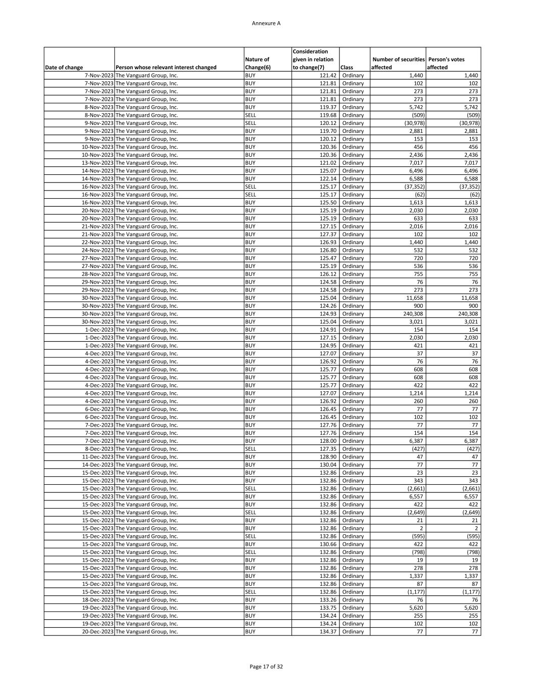 Annexure A Date of change Person whose relevant interest changed Nature of Change(6) Consideration given in relation to change(7) Class Number of securities affected Person's votes affected 7-Nov-2023 The Vanguard Group, Inc. BUY 121.42 Ordinary 1,440 1,440 7-Nov-2023 The Vanguard Group, Inc. BUY 121.81 Ordinary 102 102 7-Nov-2023 The Vanguard Group, Inc. BUY 121.81 Ordinary 273 273 7-Nov-2023 The Vanguard Group, Inc. BUY 121.81 Ordinary 273 273 8-Nov-2023 The Vanguard Group, Inc. BUY 119.37 Ordinary 5,742 5,742 8-Nov-2023 The Vanguard Group, Inc. SELL 119.68 Ordinary (509) (509) 9-Nov-2023 The Vanguard Group, Inc. SELL 120.12 Ordinary (30,978) (30,978) 9-Nov-2023 The Vanguard Group, Inc. BUY 119.70 Ordinary 2,881 2,881 9-Nov-2023 The Vanguard Group, Inc. BUY 120.12 Ordinary 153 153 10-Nov-2023 The Vanguard Group, Inc. BUY 120.36 Ordinary 456 456 10-Nov-2023 The Vanguard Group, Inc. BUY 120.36 Ordinary 2,436 2,436 13-Nov-2023 The Vanguard Group, Inc. BUY 121.02 Ordinary 7,017 7,017 14-Nov-2023 The Vanguard Group, Inc. BUY 125.07 Ordinary 6,496 6,496 14-Nov-2023 The Vanguard Group, Inc. BUY 122.14 Ordinary 6,588 6,588 16-Nov-2023 The Vanguard Group, Inc. SELL 125.17 Ordinary (37,352) (37,352) 16-Nov-2023 The Vanguard Group, Inc. SELL 125.17 Ordinary (62) (62) 16-Nov-2023 The Vanguard Group, Inc. BUY 125.50 Ordinary 1,613 1,613 20-Nov-2023 The Vanguard Group, Inc. BUY 125.19 Ordinary 2,030 2,030 20-Nov-2023 The Vanguard Group, Inc. BUY 125.19 Ordinary 633 633 21-Nov-2023 The Vanguard Group, Inc. BUY 127.15 Ordinary 2,016 2,016 21-Nov-2023 The Vanguard Group, Inc. BUY 127.37 Ordinary 102 102 22-Nov-2023 The Vanguard Group, Inc. BUY 126.93 Ordinary 1,440 1,440 24-Nov-2023 The Vanguard Group, Inc. BUY 126.80 Ordinary 532 532 27-Nov-2023 The Vanguard Group, Inc. BUY 125.47 Ordinary 720 720 27-Nov-2023 The Vanguard Group, Inc. BUY 125.19 Ordinary 536 536 28-Nov-2023 The Vanguard Group, Inc. BUY 126.12 Ordinary 755 755 29-Nov-2023 The Vanguard Group, Inc. BUY 124.58 Ordinary 76 76 29-Nov-2023 The Vanguard Group, Inc. BUY 124.58 Ordinary 273 273 30-Nov-2023 The Vanguard Group, Inc. BUY 125.04 Ordinary 11,658 11,658 30-Nov-2023 The Vanguard Group, Inc. BUY 124.26 Ordinary 900 900 30-Nov-2023 The Vanguard Group, Inc. BUY 124.93 Ordinary 240,308 240,308 30-Nov-2023 The Vanguard Group, Inc. BUY 125.04 Ordinary 3,021 3,021 1-Dec-2023 The Vanguard Group, Inc. BUY 124.91 Ordinary 154 154 1-Dec-2023 The Vanguard Group, Inc. BUY 127.15 Ordinary 2,030 2,030 1-Dec-2023 The Vanguard Group, Inc. BUY 124.95 Ordinary 421 421 4-Dec-2023 The Vanguard Group, Inc. BUY 127.07 Ordinary 37 37 4-Dec-2023 The Vanguard Group, Inc. BUY 126.92 Ordinary 76 76 4-Dec-2023 The Vanguard Group, Inc. BUY 125.77 Ordinary 608 608 4-Dec-2023 The Vanguard Group, Inc. BUY 125.77 Ordinary 608 608 4-Dec-2023 The Vanguard Group, Inc. BUY 125.77 Ordinary 422 422 4-Dec-2023 The Vanguard Group, Inc. BUY 127.07 Ordinary 1,214 1,214 4-Dec-2023 The Vanguard Group, Inc. BUY 126.92 Ordinary 260 260 6-Dec-2023 The Vanguard Group, Inc. BUY 126.45 Ordinary 77 77 6-Dec-2023 The Vanguard Group, Inc. BUY 126.45 Ordinary 102 102 7-Dec-2023 The Vanguard Group, Inc. BUY 127.76 Ordinary 77 77 7-Dec-2023 The Vanguard Group, Inc. BUY 127.76 Ordinary 154 154 7-Dec-2023 The Vanguard Group, Inc. BUY 128.00 Ordinary 6,387 6,387 8-Dec-2023 The Vanguard Group, Inc. SELL 127.35 Ordinary (427) (427) 11-Dec-2023 The Vanguard Group, Inc. BUY 128.90 Ordinary 47 47 14-Dec-2023 The Vanguard Group, Inc. BUY 130.04 Ordinary 77 77 15-Dec-2023 The Vanguard Group, Inc. BUY 132.86 Ordinary 23 23 15-Dec-2023 The Vanguard Group, Inc. BUY 132.86 Ordinary 343 343 15-Dec-2023 The Vanguard Group, Inc. SELL 132.86 Ordinary (2,661) (2,661) 15-Dec-2023 The Vanguard Group, Inc. BUY 132.86 Ordinary 6,557 6,557 15-Dec-2023 The Vanguard Group, Inc. BUY 132.86 Ordinary 422 422 15-Dec-2023 The Vanguard Group, Inc. SELL 132.86 Ordinary (2,649) (2,649) 15-Dec-2023 The Vanguard Group, Inc. BUY 132.86 Ordinary 21 21 15-Dec-2023 The Vanguard Group, Inc. BUY 132.86 Ordinary 2 2 15-Dec-2023 The Vanguard Group, Inc. SELL 132.86 Ordinary (595) (595) 15-Dec-2023 The Vanguard Group, Inc. BUY 130.66 Ordinary 422 422 15-Dec-2023 The Vanguard Group, Inc. SELL 132.86 Ordinary (798) (798) 15-Dec-2023 The Vanguard Group, Inc. BUY 132.86 Ordinary 19 19 15-Dec-2023 The Vanguard Group, Inc. BUY 132.86 Ordinary 278 278 15-Dec-2023 The Vanguard Group, Inc. BUY 132.86 Ordinary 1,337 1,337 15-Dec-2023 The Vanguard Group, Inc. BUY 132.86 Ordinary 87 87 15-Dec-2023 The Vanguard Group, Inc. SELL 132.86 Ordinary (1,177) (1,177) 18-Dec-2023 The Vanguard Group, Inc. BUY 133.26 Ordinary 76 76 19-Dec-2023 The Vanguard Group, Inc. BUY 133.75 Ordinary 5,620 5,620 19-Dec-2023 The Vanguard Group, Inc. BUY 134.24 Ordinary 255 255 19-Dec-2023 The Vanguard Group, Inc. BUY 134.24 Ordinary 102 102 20-Dec-2023 The Vanguard Group, Inc. BUY 134.37 Ordinary 77 77 Page 17 of 32