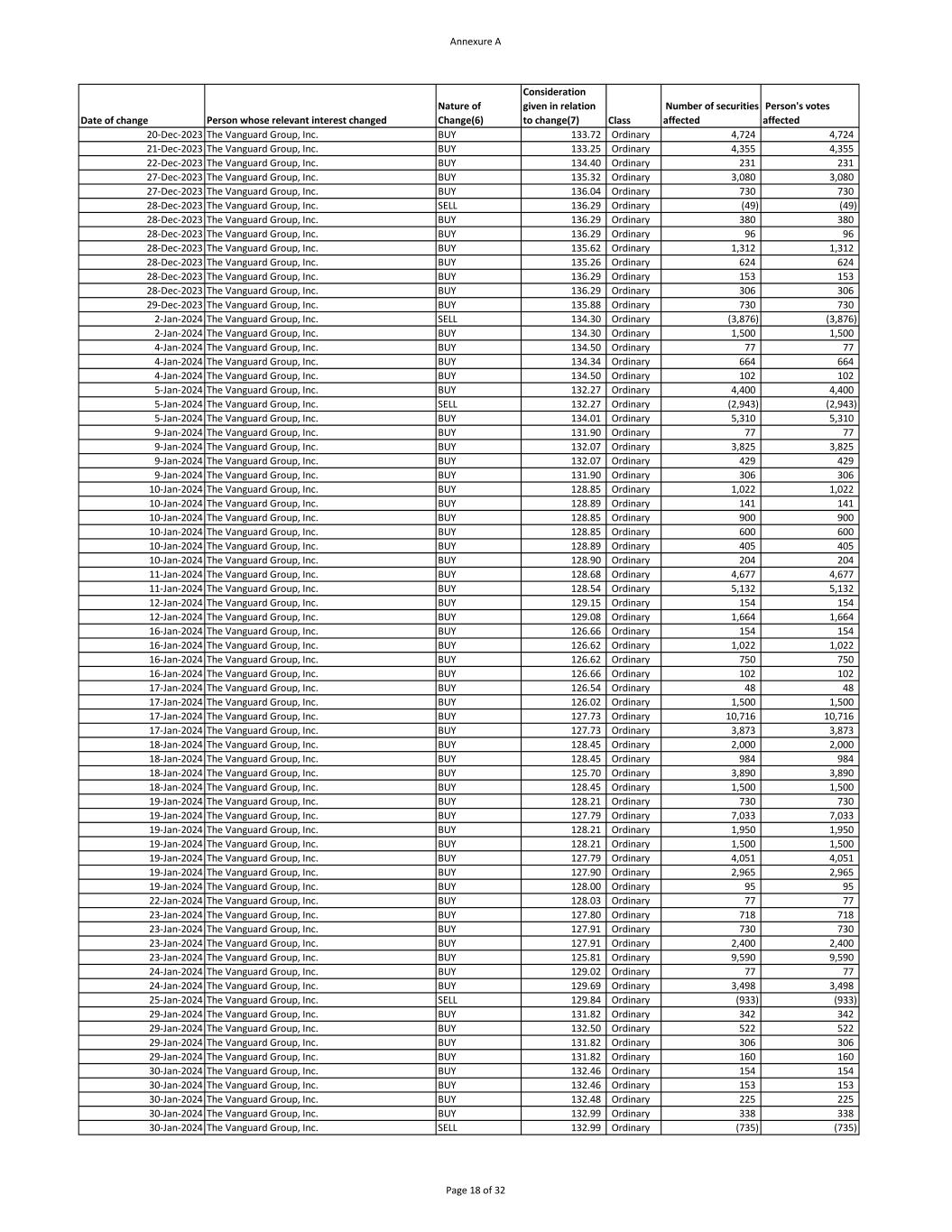 Annexure A Date of change Person whose relevant interest changed Nature of Change(6) Consideration given in relation to change(7) Class Number of securities affected Person's votes affected 20-Dec-2023 The Vanguard Group, Inc. BUY 133.72 Ordinary 4,724 4,724 21-Dec-2023 The Vanguard Group, Inc. BUY 133.25 Ordinary 4,355 4,355 22-Dec-2023 The Vanguard Group, Inc. BUY 134.40 Ordinary 231 231 27-Dec-2023 The Vanguard Group, Inc. BUY 135.32 Ordinary 3,080 3,080 27-Dec-2023 The Vanguard Group, Inc. BUY 136.04 Ordinary 730 730 28-Dec-2023 The Vanguard Group, Inc. SELL 136.29 Ordinary (49) (49) 28-Dec-2023 The Vanguard Group, Inc. BUY 136.29 Ordinary 380 380 28-Dec-2023 The Vanguard Group, Inc. BUY 136.29 Ordinary 96 96 28-Dec-2023 The Vanguard Group, Inc. BUY 135.62 Ordinary 1,312 1,312 28-Dec-2023 The Vanguard Group, Inc. BUY 135.26 Ordinary 624 624 28-Dec-2023 The Vanguard Group, Inc. BUY 136.29 Ordinary 153 153 28-Dec-2023 The Vanguard Group, Inc. BUY 136.29 Ordinary 306 306 29-Dec-2023 The Vanguard Group, Inc. BUY 135.88 Ordinary 730 730 2-Jan-2024 The Vanguard Group, Inc. SELL 134.30 Ordinary (3,876) (3,876) 2-Jan-2024 The Vanguard Group, Inc. BUY 134.30 Ordinary 1,500 1,500 4-Jan-2024 The Vanguard Group, Inc. BUY 134.50 Ordinary 77 77 4-Jan-2024 The Vanguard Group, Inc. BUY 134.34 Ordinary 664 664 4-Jan-2024 The Vanguard Group, Inc. BUY 134.50 Ordinary 102 102 5-Jan-2024 The Vanguard Group, Inc. BUY 132.27 Ordinary 4,400 4,400 5-Jan-2024 The Vanguard Group, Inc. SELL 132.27 Ordinary (2,943) (2,943) 5-Jan-2024 The Vanguard Group, Inc. BUY 134.01 Ordinary 5,310 5,310 9-Jan-2024 The Vanguard Group, Inc. BUY 131.90 Ordinary 77 77 9-Jan-2024 The Vanguard Group, Inc. BUY 132.07 Ordinary 3,825 3,825 9-Jan-2024 The Vanguard Group, Inc. BUY 132.07 Ordinary 429 429 9-Jan-2024 The Vanguard Group, Inc. BUY 131.90 Ordinary 306 306 10-Jan-2024 The Vanguard Group, Inc. BUY 128.85 Ordinary 1,022 1,022 10-Jan-2024 The Vanguard Group, Inc. BUY 128.89 Ordinary 141 141 10-Jan-2024 The Vanguard Group, Inc. BUY 128.85 Ordinary 900 900 10-Jan-2024 The Vanguard Group, Inc. BUY 128.85 Ordinary 600 600 10-Jan-2024 The Vanguard Group, Inc. BUY 128.89 Ordinary 405 405 10-Jan-2024 The Vanguard Group, Inc. BUY 128.90 Ordinary 204 204 11-Jan-2024 The Vanguard Group, Inc. BUY 128.68 Ordinary 4,677 4,677 11-Jan-2024 The Vanguard Group, Inc. BUY 128.54 Ordinary 5,132 5,132 12-Jan-2024 The Vanguard Group, Inc. BUY 129.15 Ordinary 154 154 12-Jan-2024 The Vanguard Group, Inc. BUY 129.08 Ordinary 1,664 1,664 16-Jan-2024 The Vanguard Group, Inc. BUY 126.66 Ordinary 154 154 16-Jan-2024 The Vanguard Group, Inc. BUY 126.62 Ordinary 1,022 1,022 16-Jan-2024 The Vanguard Group, Inc. BUY 126.62 Ordinary 750 750 16-Jan-2024 The Vanguard Group, Inc. BUY 126.66 Ordinary 102 102 17-Jan-2024 The Vanguard Group, Inc. BUY 126.54 Ordinary 48 48 17-Jan-2024 The Vanguard Group, Inc. BUY 126.02 Ordinary 1,500 1,500 17-Jan-2024 The Vanguard Group, Inc. BUY 127.73 Ordinary 10,716 10,716 17-Jan-2024 The Vanguard Group, Inc. BUY 127.73 Ordinary 3,873 3,873 18-Jan-2024 The Vanguard Group, Inc. BUY 128.45 Ordinary 2,000 2,000 18-Jan-2024 The Vanguard Group, Inc. BUY 128.45 Ordinary 984 984 18-Jan-2024 The Vanguard Group, Inc. BUY 125.70 Ordinary 3,890 3,890 18-Jan-2024 The Vanguard Group, Inc. BUY 128.45 Ordinary 1,500 1,500 19-Jan-2024 The Vanguard Group, Inc. BUY 128.21 Ordinary 730 730 19-Jan-2024 The Vanguard Group, Inc. BUY 127.79 Ordinary 7,033 7,033 19-Jan-2024 The Vanguard Group, Inc. BUY 128.21 Ordinary 1,950 1,950 19-Jan-2024 The Vanguard Group, Inc. BUY 128.21 Ordinary 1,500 1,500 19-Jan-2024 The Vanguard Group, Inc. BUY 127.79 Ordinary 4,051 4,051 19-Jan-2024 The Vanguard Group, Inc. BUY 127.90 Ordinary 2,965 2,965 19-Jan-2024 The Vanguard Group, Inc. BUY 128.00 Ordinary 95 95 22-Jan-2024 The Vanguard Group, Inc. BUY 128.03 Ordinary 77 77 23-Jan-2024 The Vanguard Group, Inc. BUY 127.80 Ordinary 718 718 23-Jan-2024 The Vanguard Group, Inc. BUY 127.91 Ordinary 730 730 23-Jan-2024 The Vanguard Group, Inc. BUY 127.91 Ordinary 2,400 2,400 23-Jan-2024 The Vanguard Group, Inc. BUY 125.81 Ordinary 9,590 9,590 24-Jan-2024 The Vanguard Group, Inc. BUY 129.02 Ordinary 77 77 24-Jan-2024 The Vanguard Group, Inc. BUY 129.69 Ordinary 3,498 3,498 25-Jan-2024 The Vanguard Group, Inc. SELL 129.84 Ordinary (933) (933) 29-Jan-2024 The Vanguard Group, Inc. BUY 131.82 Ordinary 342 342 29-Jan-2024 The Vanguard Group, Inc. BUY 132.50 Ordinary 522 522 29-Jan-2024 The Vanguard Group, Inc. BUY 131.82 Ordinary 306 306 29-Jan-2024 The Vanguard Group, Inc. BUY 131.82 Ordinary 160 160 30-Jan-2024 The Vanguard Group, Inc. BUY 132.46 Ordinary 154 154 30-Jan-2024 The Vanguard Group, Inc. BUY 132.46 Ordinary 153 153 30-Jan-2024 The Vanguard Group, Inc. BUY 132.48 Ordinary 225 225 30-Jan-2024 The Vanguard Group, Inc. BUY 132.99 Ordinary 338 338 30-Jan-2024 The Vanguard Group, Inc. SELL 132.99 Ordinary (735) (735) Page 18 of 32