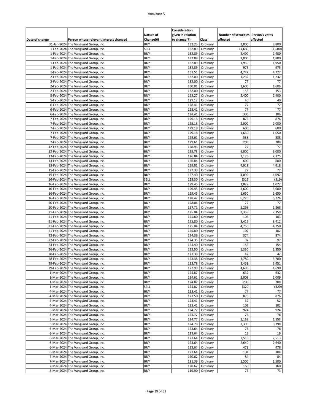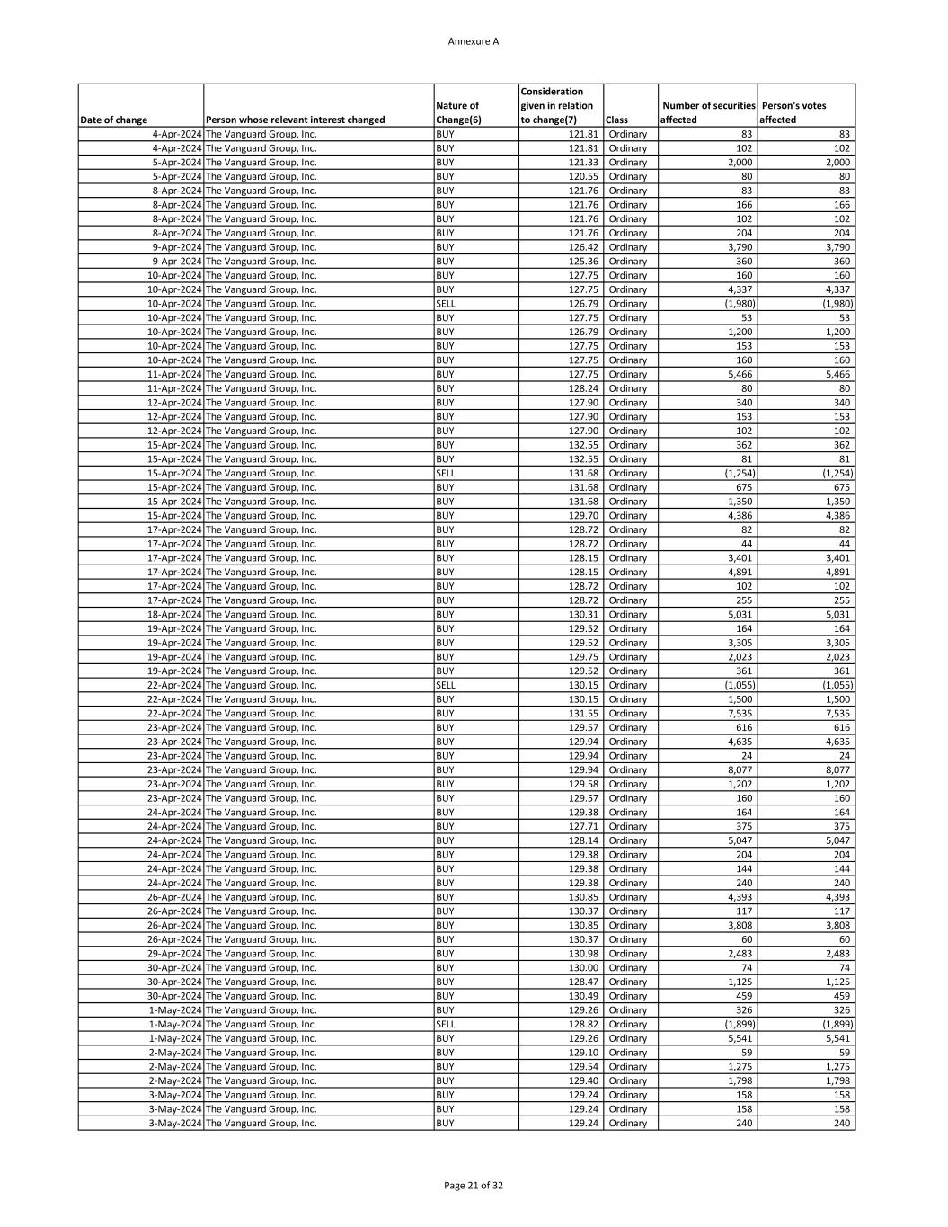 Annexure A Date of change Person whose relevant interest changed Nature of Change(6) Consideration given in relation to change(7) Class Number of securities affected Person's votes affected 4-Apr-2024 The Vanguard Group, Inc. BUY 121.81 Ordinary 83 83 4-Apr-2024 The Vanguard Group, Inc. BUY 121.81 Ordinary 102 102 5-Apr-2024 The Vanguard Group, Inc. BUY 121.33 Ordinary 2,000 2,000 5-Apr-2024 The Vanguard Group, Inc. BUY 120.55 Ordinary 80 80 8-Apr-2024 The Vanguard Group, Inc. BUY 121.76 Ordinary 83 83 8-Apr-2024 The Vanguard Group, Inc. BUY 121.76 Ordinary 166 166 8-Apr-2024 The Vanguard Group, Inc. BUY 121.76 Ordinary 102 102 8-Apr-2024 The Vanguard Group, Inc. BUY 121.76 Ordinary 204 204 9-Apr-2024 The Vanguard Group, Inc. BUY 126.42 Ordinary 3,790 3,790 9-Apr-2024 The Vanguard Group, Inc. BUY 125.36 Ordinary 360 360 10-Apr-2024 The Vanguard Group, Inc. BUY 127.75 Ordinary 160 160 10-Apr-2024 The Vanguard Group, Inc. BUY 127.75 Ordinary 4,337 4,337 10-Apr-2024 The Vanguard Group, Inc. SELL 126.79 Ordinary (1,980) (1,980) 10-Apr-2024 The Vanguard Group, Inc. BUY 127.75 Ordinary 53 53 10-Apr-2024 The Vanguard Group, Inc. BUY 126.79 Ordinary 1,200 1,200 10-Apr-2024 The Vanguard Group, Inc. BUY 127.75 Ordinary 153 153 10-Apr-2024 The Vanguard Group, Inc. BUY 127.75 Ordinary 160 160 11-Apr-2024 The Vanguard Group, Inc. BUY 127.75 Ordinary 5,466 5,466 11-Apr-2024 The Vanguard Group, Inc. BUY 128.24 Ordinary 80 80 12-Apr-2024 The Vanguard Group, Inc. BUY 127.90 Ordinary 340 340 12-Apr-2024 The Vanguard Group, Inc. BUY 127.90 Ordinary 153 153 12-Apr-2024 The Vanguard Group, Inc. BUY 127.90 Ordinary 102 102 15-Apr-2024 The Vanguard Group, Inc. BUY 132.55 Ordinary 362 362 15-Apr-2024 The Vanguard Group, Inc. BUY 132.55 Ordinary 81 81 15-Apr-2024 The Vanguard Group, Inc. SELL 131.68 Ordinary (1,254) (1,254) 15-Apr-2024 The Vanguard Group, Inc. BUY 131.68 Ordinary 675 675 15-Apr-2024 The Vanguard Group, Inc. BUY 131.68 Ordinary 1,350 1,350 15-Apr-2024 The Vanguard Group, Inc. BUY 129.70 Ordinary 4,386 4,386 17-Apr-2024 The Vanguard Group, Inc. BUY 128.72 Ordinary 82 82 17-Apr-2024 The Vanguard Group, Inc. BUY 128.72 Ordinary 44 44 17-Apr-2024 The Vanguard Group, Inc. BUY 128.15 Ordinary 3,401 3,401 17-Apr-2024 The Vanguard Group, Inc. BUY 128.15 Ordinary 4,891 4,891 17-Apr-2024 The Vanguard Group, Inc. BUY 128.72 Ordinary 102 102 17-Apr-2024 The Vanguard Group, Inc. BUY 128.72 Ordinary 255 255 18-Apr-2024 The Vanguard Group, Inc. BUY 130.31 Ordinary 5,031 5,031 19-Apr-2024 The Vanguard Group, Inc. BUY 129.52 Ordinary 164 164 19-Apr-2024 The Vanguard Group, Inc. BUY 129.52 Ordinary 3,305 3,305 19-Apr-2024 The Vanguard Group, Inc. BUY 129.75 Ordinary 2,023 2,023 19-Apr-2024 The Vanguard Group, Inc. BUY 129.52 Ordinary 361 361 22-Apr-2024 The Vanguard Group, Inc. SELL 130.15 Ordinary (1,055) (1,055) 22-Apr-2024 The Vanguard Group, Inc. BUY 130.15 Ordinary 1,500 1,500 22-Apr-2024 The Vanguard Group, Inc. BUY 131.55 Ordinary 7,535 7,535 23-Apr-2024 The Vanguard Group, Inc. BUY 129.57 Ordinary 616 616 23-Apr-2024 The Vanguard Group, Inc. BUY 129.94 Ordinary 4,635 4,635 23-Apr-2024 The Vanguard Group, Inc. BUY 129.94 Ordinary 24 24 23-Apr-2024 The Vanguard Group, Inc. BUY 129.94 Ordinary 8,077 8,077 23-Apr-2024 The Vanguard Group, Inc. BUY 129.58 Ordinary 1,202 1,202 23-Apr-2024 The Vanguard Group, Inc. BUY 129.57 Ordinary 160 160 24-Apr-2024 The Vanguard Group, Inc. BUY 129.38 Ordinary 164 164 24-Apr-2024 The Vanguard Group, Inc. BUY 127.71 Ordinary 375 375 24-Apr-2024 The Vanguard Group, Inc. BUY 128.14 Ordinary 5,047 5,047 24-Apr-2024 The Vanguard Group, Inc. BUY 129.38 Ordinary 204 204 24-Apr-2024 The Vanguard Group, Inc. BUY 129.38 Ordinary 144 144 24-Apr-2024 The Vanguard Group, Inc. BUY 129.38 Ordinary 240 240 26-Apr-2024 The Vanguard Group, Inc. BUY 130.85 Ordinary 4,393 4,393 26-Apr-2024 The Vanguard Group, Inc. BUY 130.37 Ordinary 117 117 26-Apr-2024 The Vanguard Group, Inc. BUY 130.85 Ordinary 3,808 3,808 26-Apr-2024 The Vanguard Group, Inc. BUY 130.37 Ordinary 60 60 29-Apr-2024 The Vanguard Group, Inc. BUY 130.98 Ordinary 2,483 2,483 30-Apr-2024 The Vanguard Group, Inc. BUY 130.00 Ordinary 74 74 30-Apr-2024 The Vanguard Group, Inc. BUY 128.47 Ordinary 1,125 1,125 30-Apr-2024 The Vanguard Group, Inc. BUY 130.49 Ordinary 459 459 1-May-2024 The Vanguard Group, Inc. BUY 129.26 Ordinary 326 326 1-May-2024 The Vanguard Group, Inc. SELL 128.82 Ordinary (1,899) (1,899) 1-May-2024 The Vanguard Group, Inc. BUY 129.26 Ordinary 5,541 5,541 2-May-2024 The Vanguard Group, Inc. BUY 129.10 Ordinary 59 59 2-May-2024 The Vanguard Group, Inc. BUY 129.54 Ordinary 1,275 1,275 2-May-2024 The Vanguard Group, Inc. BUY 129.40 Ordinary 1,798 1,798 3-May-2024 The Vanguard Group, Inc. BUY 129.24 Ordinary 158 158 3-May-2024 The Vanguard Group, Inc. BUY 129.24 Ordinary 158 158 3-May-2024 The Vanguard Group, Inc. BUY 129.24 Ordinary 240 240 Page 21 of 32