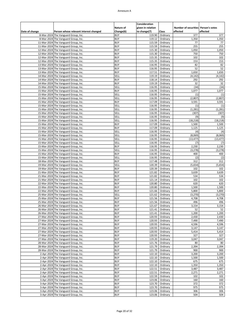 Annexure A Date of change Person whose relevant interest changed Nature of Change(6) Consideration given in relation to change(7) Class Number of securities affected Person's votes affected 8-Mar-2024 The Vanguard Group, Inc. BUY 119.90 Ordinary 377 377 8-Mar-2024 The Vanguard Group, Inc. BUY 119.12 Ordinary 1,350 1,350 11-Mar-2024 The Vanguard Group, Inc. BUY 115.59 Ordinary 77 77 11-Mar-2024 The Vanguard Group, Inc. BUY 115.59 Ordinary 255 255 12-Mar-2024 The Vanguard Group, Inc. BUY 115.30 Ordinary 1,050 1,050 12-Mar-2024 The Vanguard Group, Inc. BUY 115.30 Ordinary 750 750 12-Mar-2024 The Vanguard Group, Inc. BUY 115.35 Ordinary 102 102 12-Mar-2024 The Vanguard Group, Inc. BUY 115.35 Ordinary 153 153 13-Mar-2024 The Vanguard Group, Inc. BUY 116.95 Ordinary 82 82 13-Mar-2024 The Vanguard Group, Inc. BUY 116.95 Ordinary 52 52 13-Mar-2024 The Vanguard Group, Inc. BUY 117.51 Ordinary 1,650 1,650 14-Mar-2024 The Vanguard Group, Inc. SELL 119.19 Ordinary (4,142) (4,142) 14-Mar-2024 The Vanguard Group, Inc. BUY 118.14 Ordinary 292 292 14-Mar-2024 The Vanguard Group, Inc. BUY 119.19 Ordinary 32 32 15-Mar-2024 The Vanguard Group, Inc. SELL 116.95 Ordinary (34) (34) 15-Mar-2024 The Vanguard Group, Inc. BUY 116.95 Ordinary 1,077 1,077 15-Mar-2024 The Vanguard Group, Inc. SELL 116.95 Ordinary (1) (1) 15-Mar-2024 The Vanguard Group, Inc. SELL 116.95 Ordinary (2,807) (2,807) 15-Mar-2024 The Vanguard Group, Inc. BUY 117.09 Ordinary 3,591 3,591 15-Mar-2024 The Vanguard Group, Inc. SELL 116.95 Ordinary (1) (1) 15-Mar-2024 The Vanguard Group, Inc. SELL 116.95 Ordinary (1,281) (1,281) 15-Mar-2024 The Vanguard Group, Inc. SELL 116.95 Ordinary (307) (307) 15-Mar-2024 The Vanguard Group, Inc. SELL 116.95 Ordinary (9) (9) 15-Mar-2024 The Vanguard Group, Inc. SELL 116.95 Ordinary (18,218) (18,218) 15-Mar-2024 The Vanguard Group, Inc. BUY 117.09 Ordinary 1,500 1,500 15-Mar-2024 The Vanguard Group, Inc. BUY 117.09 Ordinary 1,125 1,125 15-Mar-2024 The Vanguard Group, Inc. SELL 116.95 Ordinary (4) (4) 15-Mar-2024 The Vanguard Group, Inc. SELL 116.95 Ordinary (8,069) (8,069) 15-Mar-2024 The Vanguard Group, Inc. SELL 116.95 Ordinary (13,477) (13,477) 15-Mar-2024 The Vanguard Group, Inc. SELL 116.95 Ordinary (7) (7) 15-Mar-2024 The Vanguard Group, Inc. BUY 116.95 Ordinary 2,230 2,230 15-Mar-2024 The Vanguard Group, Inc. SELL 116.95 Ordinary (3,278) (3,278) 15-Mar-2024 The Vanguard Group, Inc. BUY 116.95 Ordinary 400 400 15-Mar-2024 The Vanguard Group, Inc. SELL 116.95 Ordinary (2) (2) 18-Mar-2024 The Vanguard Group, Inc. BUY 117.48 Ordinary 312 312 19-Mar-2024 The Vanguard Group, Inc. SELL 120.39 Ordinary (5,654) (5,654) 19-Mar-2024 The Vanguard Group, Inc. BUY 120.39 Ordinary 102 102 21-Mar-2024 The Vanguard Group, Inc. BUY 121.82 Ordinary 3,639 3,639 21-Mar-2024 The Vanguard Group, Inc. BUY 121.82 Ordinary 534 534 21-Mar-2024 The Vanguard Group, Inc. BUY 121.14 Ordinary 102 102 22-Mar-2024 The Vanguard Group, Inc. BUY 120.80 Ordinary 620 620 22-Mar-2024 The Vanguard Group, Inc. BUY 120.80 Ordinary 1,500 1,500 22-Mar-2024 The Vanguard Group, Inc. BUY 121.66 Ordinary 5,800 5,800 25-Mar-2024 The Vanguard Group, Inc. SELL 121.62 Ordinary (3,270) (3,270) 25-Mar-2024 The Vanguard Group, Inc. BUY 121.56 Ordinary 4,708 4,708 25-Mar-2024 The Vanguard Group, Inc. BUY 121.56 Ordinary 496 496 26-Mar-2024 The Vanguard Group, Inc. BUY 121.67 Ordinary 3,154 3,154 26-Mar-2024 The Vanguard Group, Inc. BUY 121.41 Ordinary 52 52 26-Mar-2024 The Vanguard Group, Inc. BUY 121.41 Ordinary 1,200 1,200 27-Mar-2024 The Vanguard Group, Inc. BUY 120.93 Ordinary 2,430 2,430 27-Mar-2024 The Vanguard Group, Inc. BUY 120.93 Ordinary 7,490 7,490 27-Mar-2024 The Vanguard Group, Inc. BUY 120.93 Ordinary 4,596 4,596 27-Mar-2024 The Vanguard Group, Inc. BUY 120.93 Ordinary 3,147 3,147 27-Mar-2024 The Vanguard Group, Inc. BUY 120.93 Ordinary 5,414 5,414 27-Mar-2024 The Vanguard Group, Inc. BUY 120.93 Ordinary 327 327 27-Mar-2024 The Vanguard Group, Inc. BUY 119.20 Ordinary 3,047 3,047 28-Mar-2024 The Vanguard Group, Inc. BUY 121.76 Ordinary 80 80 28-Mar-2024 The Vanguard Group, Inc. BUY 121.79 Ordinary 2,394 2,394 28-Mar-2024 The Vanguard Group, Inc. BUY 121.79 Ordinary 900 900 2-Apr-2024 The Vanguard Group, Inc. BUY 122.10 Ordinary 3,200 3,200 2-Apr-2024 The Vanguard Group, Inc. BUY 122.10 Ordinary 1,500 1,500 2-Apr-2024 The Vanguard Group, Inc. BUY 122.10 Ordinary 675 675 2-Apr-2024 The Vanguard Group, Inc. BUY 122.10 Ordinary 1,350 1,350 2-Apr-2024 The Vanguard Group, Inc. BUY 122.51 Ordinary 3,487 3,487 2-Apr-2024 The Vanguard Group, Inc. BUY 122.51 Ordinary 2,271 2,271 2-Apr-2024 The Vanguard Group, Inc. BUY 122.59 Ordinary 102 102 3-Apr-2024 The Vanguard Group, Inc. BUY 123.06 Ordinary 160 160 3-Apr-2024 The Vanguard Group, Inc. BUY 123.70 Ordinary 372 372 3-Apr-2024 The Vanguard Group, Inc. BUY 123.70 Ordinary 975 975 3-Apr-2024 The Vanguard Group, Inc. BUY 123.06 Ordinary 306 306 3-Apr-2024 The Vanguard Group, Inc. BUY 123.06 Ordinary 504 504 Page 20 of 32