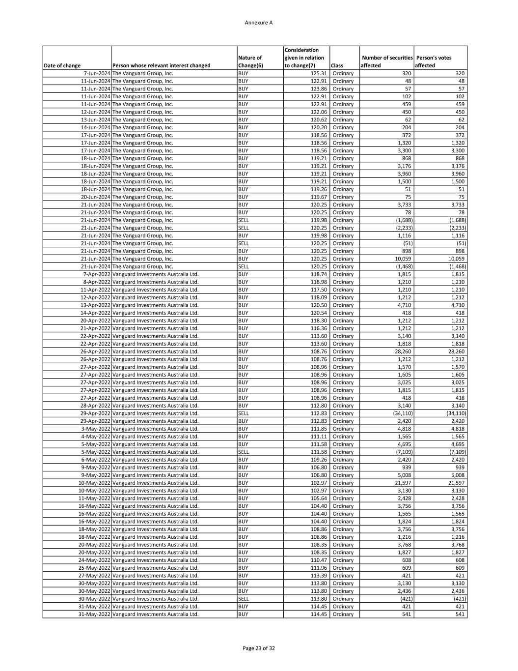 Annexure A Date of change Person whose relevant interest changed Nature of Change(6) Consideration given in relation to change(7) Class Number of securities affected Person's votes affected 7-Jun-2024 The Vanguard Group, Inc. BUY 125.31 Ordinary 320 320 11-Jun-2024 The Vanguard Group, Inc. BUY 122.91 Ordinary 48 48 11-Jun-2024 The Vanguard Group, Inc. BUY 123.86 Ordinary 57 57 11-Jun-2024 The Vanguard Group, Inc. BUY 122.91 Ordinary 102 102 11-Jun-2024 The Vanguard Group, Inc. BUY 122.91 Ordinary 459 459 12-Jun-2024 The Vanguard Group, Inc. BUY 122.06 Ordinary 450 450 13-Jun-2024 The Vanguard Group, Inc. BUY 120.62 Ordinary 62 62 14-Jun-2024 The Vanguard Group, Inc. BUY 120.20 Ordinary 204 204 17-Jun-2024 The Vanguard Group, Inc. BUY 118.56 Ordinary 372 372 17-Jun-2024 The Vanguard Group, Inc. BUY 118.56 Ordinary 1,320 1,320 17-Jun-2024 The Vanguard Group, Inc. BUY 118.56 Ordinary 3,300 3,300 18-Jun-2024 The Vanguard Group, Inc. BUY 119.21 Ordinary 868 868 18-Jun-2024 The Vanguard Group, Inc. BUY 119.21 Ordinary 3,176 3,176 18-Jun-2024 The Vanguard Group, Inc. BUY 119.21 Ordinary 3,960 3,960 18-Jun-2024 The Vanguard Group, Inc. BUY 119.21 Ordinary 1,500 1,500 18-Jun-2024 The Vanguard Group, Inc. BUY 119.26 Ordinary 51 51 20-Jun-2024 The Vanguard Group, Inc. BUY 119.67 Ordinary 75 75 21-Jun-2024 The Vanguard Group, Inc. BUY 120.25 Ordinary 3,733 3,733 21-Jun-2024 The Vanguard Group, Inc. BUY 120.25 Ordinary 78 78 21-Jun-2024 The Vanguard Group, Inc. SELL 119.98 Ordinary (1,688) (1,688) 21-Jun-2024 The Vanguard Group, Inc. SELL 120.25 Ordinary (2,233) (2,233) 21-Jun-2024 The Vanguard Group, Inc. BUY 119.98 Ordinary 1,116 1,116 21-Jun-2024 The Vanguard Group, Inc. SELL 120.25 Ordinary (51) (51) 21-Jun-2024 The Vanguard Group, Inc. BUY 120.25 Ordinary 898 898 21-Jun-2024 The Vanguard Group, Inc. BUY 120.25 Ordinary 10,059 10,059 21-Jun-2024 The Vanguard Group, Inc. SELL 120.25 Ordinary (1,468) (1,468) 7-Apr-2022 Vanguard Investments Australia Ltd. BUY 118.74 Ordinary 1,815 1,815 8-Apr-2022 Vanguard Investments Australia Ltd. BUY 118.98 Ordinary 1,210 1,210 11-Apr-2022 Vanguard Investments Australia Ltd. BUY 117.50 Ordinary 1,210 1,210 12-Apr-2022 Vanguard Investments Australia Ltd. BUY 118.09 Ordinary 1,212 1,212 13-Apr-2022 Vanguard Investments Australia Ltd. BUY 120.50 Ordinary 4,710 4,710 14-Apr-2022 Vanguard Investments Australia Ltd. BUY 120.54 Ordinary 418 418 20-Apr-2022 Vanguard Investments Australia Ltd. BUY 118.30 Ordinary 1,212 1,212 21-Apr-2022 Vanguard Investments Australia Ltd. BUY 116.36 Ordinary 1,212 1,212 22-Apr-2022 Vanguard Investments Australia Ltd. BUY 113.60 Ordinary 3,140 3,140 22-Apr-2022 Vanguard Investments Australia Ltd. BUY 113.60 Ordinary 1,818 1,818 26-Apr-2022 Vanguard Investments Australia Ltd. BUY 108.76 Ordinary 28,260 28,260 26-Apr-2022 Vanguard Investments Australia Ltd. BUY 108.76 Ordinary 1,212 1,212 27-Apr-2022 Vanguard Investments Australia Ltd. BUY 108.96 Ordinary 1,570 1,570 27-Apr-2022 Vanguard Investments Australia Ltd. BUY 108.96 Ordinary 1,605 1,605 27-Apr-2022 Vanguard Investments Australia Ltd. BUY 108.96 Ordinary 3,025 3,025 27-Apr-2022 Vanguard Investments Australia Ltd. BUY 108.96 Ordinary 1,815 1,815 27-Apr-2022 Vanguard Investments Australia Ltd. BUY 108.96 Ordinary 418 418 28-Apr-2022 Vanguard Investments Australia Ltd. BUY 112.80 Ordinary 3,140 3,140 29-Apr-2022 Vanguard Investments Australia Ltd. SELL 112.83 Ordinary (34,110) (34,110) 29-Apr-2022 Vanguard Investments Australia Ltd. BUY 112.83 Ordinary 2,420 2,420 3-May-2022 Vanguard Investments Australia Ltd. BUY 111.85 Ordinary 4,818 4,818 4-May-2022 Vanguard Investments Australia Ltd. BUY 111.11 Ordinary 1,565 1,565 5-May-2022 Vanguard Investments Australia Ltd. BUY 111.58 Ordinary 4,695 4,695 5-May-2022 Vanguard Investments Australia Ltd. SELL 111.58 Ordinary (7,109) (7,109) 6-May-2022 Vanguard Investments Australia Ltd. BUY 109.26 Ordinary 2,420 2,420 9-May-2022 Vanguard Investments Australia Ltd. BUY 106.80 Ordinary 939 939 9-May-2022 Vanguard Investments Australia Ltd. BUY 106.80 Ordinary 5,008 5,008 10-May-2022 Vanguard Investments Australia Ltd. BUY 102.97 Ordinary 21,597 21,597 10-May-2022 Vanguard Investments Australia Ltd. BUY 102.97 Ordinary 3,130 3,130 11-May-2022 Vanguard Investments Australia Ltd. BUY 105.64 Ordinary 2,428 2,428 16-May-2022 Vanguard Investments Australia Ltd. BUY 104.40 Ordinary 3,756 3,756 16-May-2022 Vanguard Investments Australia Ltd. BUY 104.40 Ordinary 1,565 1,565 16-May-2022 Vanguard Investments Australia Ltd. BUY 104.40 Ordinary 1,824 1,824 18-May-2022 Vanguard Investments Australia Ltd. BUY 108.86 Ordinary 3,756 3,756 18-May-2022 Vanguard Investments Australia Ltd. BUY 108.86 Ordinary 1,216 1,216 20-May-2022 Vanguard Investments Australia Ltd. BUY 108.35 Ordinary 3,768 3,768 20-May-2022 Vanguard Investments Australia Ltd. BUY 108.35 Ordinary 1,827 1,827 24-May-2022 Vanguard Investments Australia Ltd. BUY 110.47 Ordinary 608 608 25-May-2022 Vanguard Investments Australia Ltd. BUY 111.96 Ordinary 609 609 27-May-2022 Vanguard Investments Australia Ltd. BUY 113.39 Ordinary 421 421 30-May-2022 Vanguard Investments Australia Ltd. BUY 113.80 Ordinary 3,130 3,130 30-May-2022 Vanguard Investments Australia Ltd. BUY 113.80 Ordinary 2,436 2,436 30-May-2022 Vanguard Investments Australia Ltd. SELL 113.80 Ordinary (421) (421) 31-May-2022 Vanguard Investments Australia Ltd. BUY 114.45 Ordinary 421 421 31-May-2022 Vanguard Investments Australia Ltd. BUY 114.45 Ordinary 541 541 Page 23 of 32